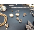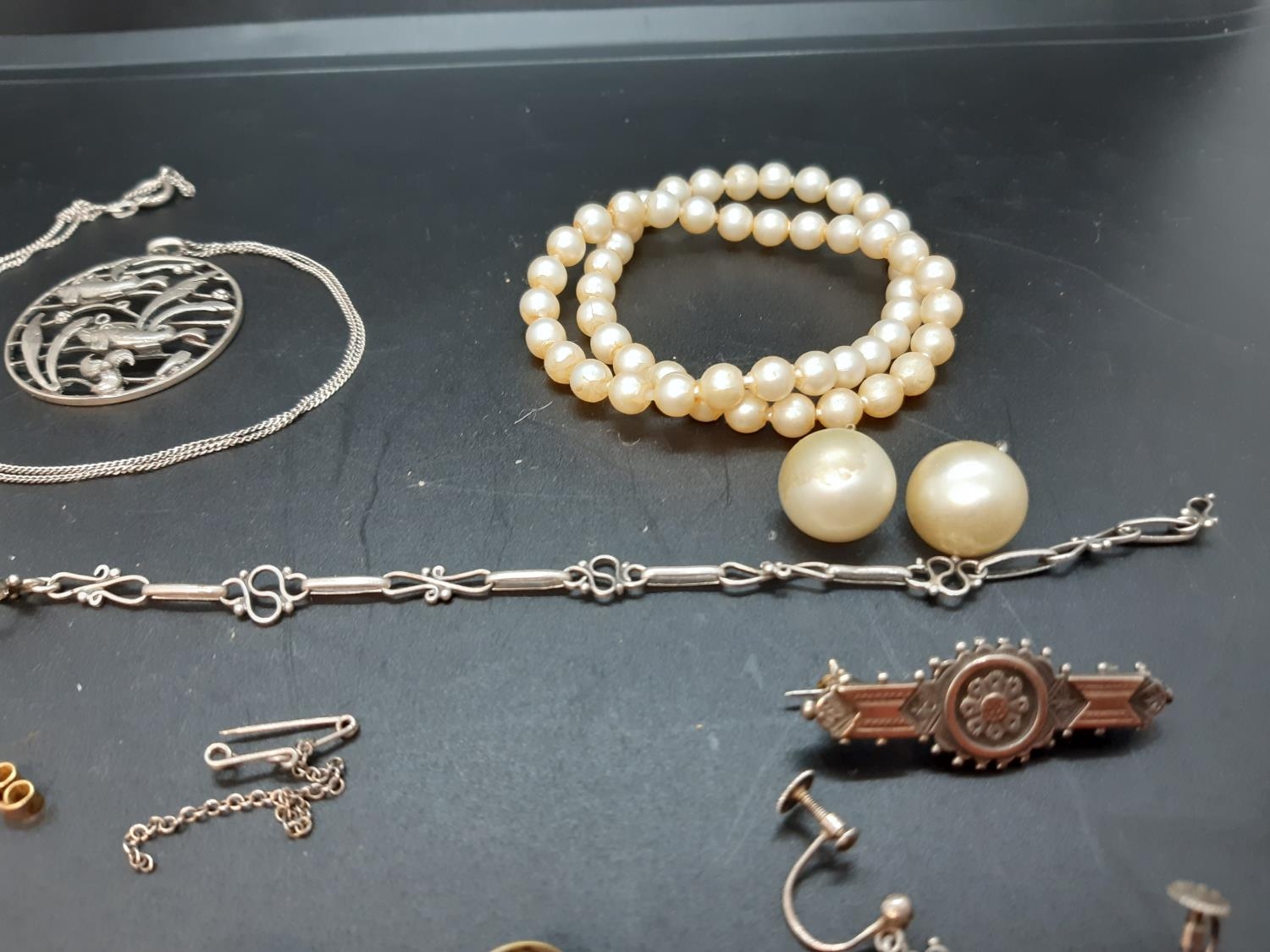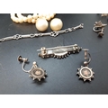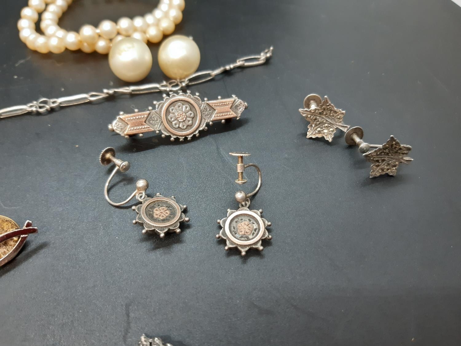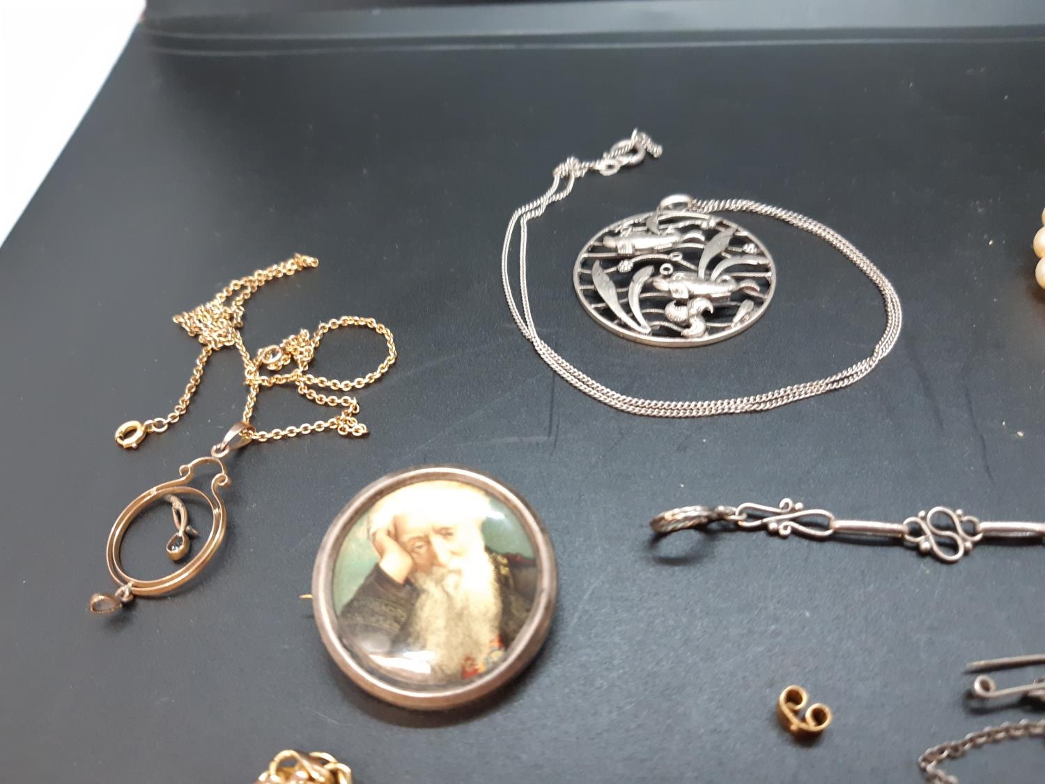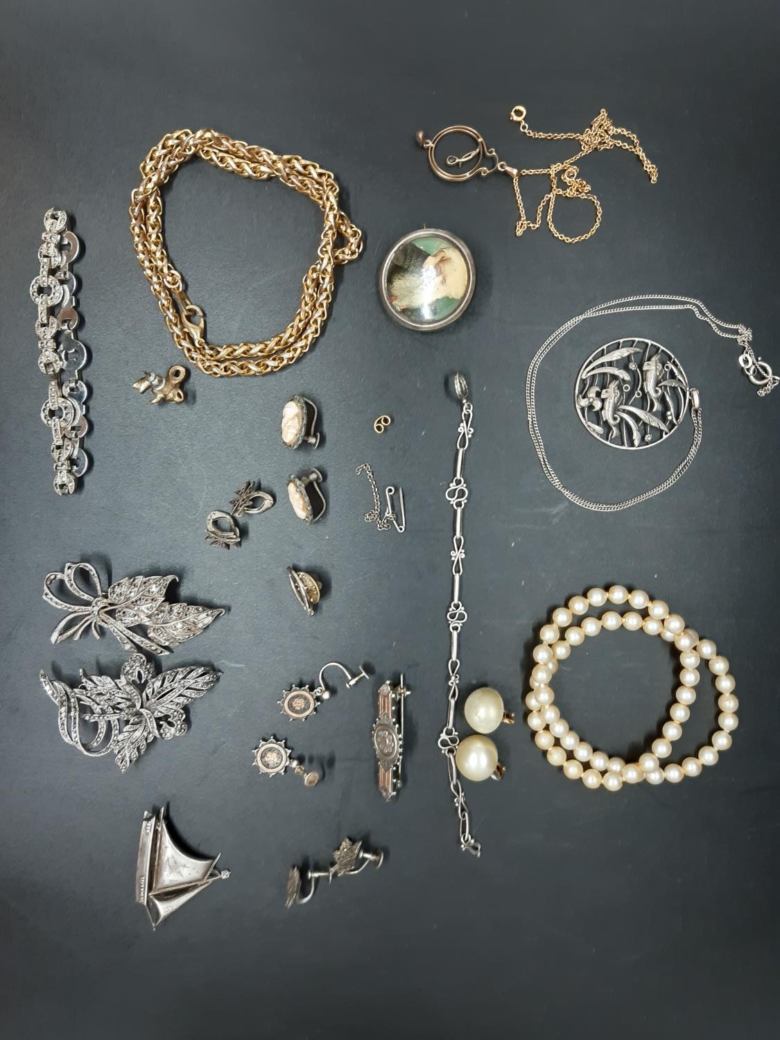 A Collection of vintage and antique jewellery comprising simulated pearl necklace, bearded gentleman printed portrait brooch in hallmarked 800 grade silver surround, two hallmarked silver marcasite brooches, a continental 800 grade silver circular necklace pendant with Fish design and white metal chain, a hallmarked Birmingham silver bar brooch with 9ct gold inlay, earrings, a hallmarked 9ct gold Edwardian necklace pendant with inset pale blue stones and unmarked gold coloured chain etc.
