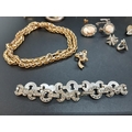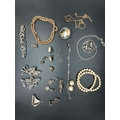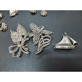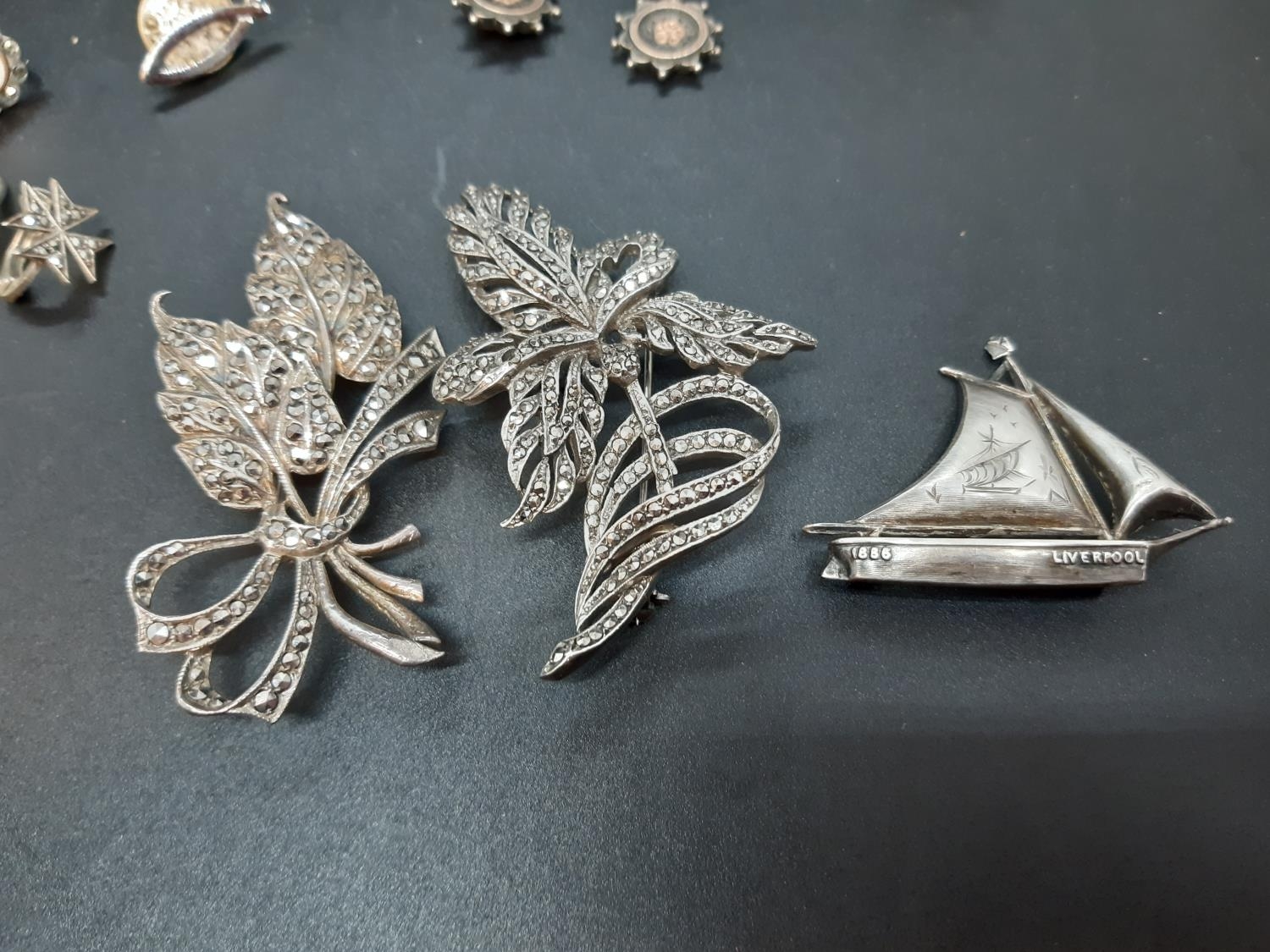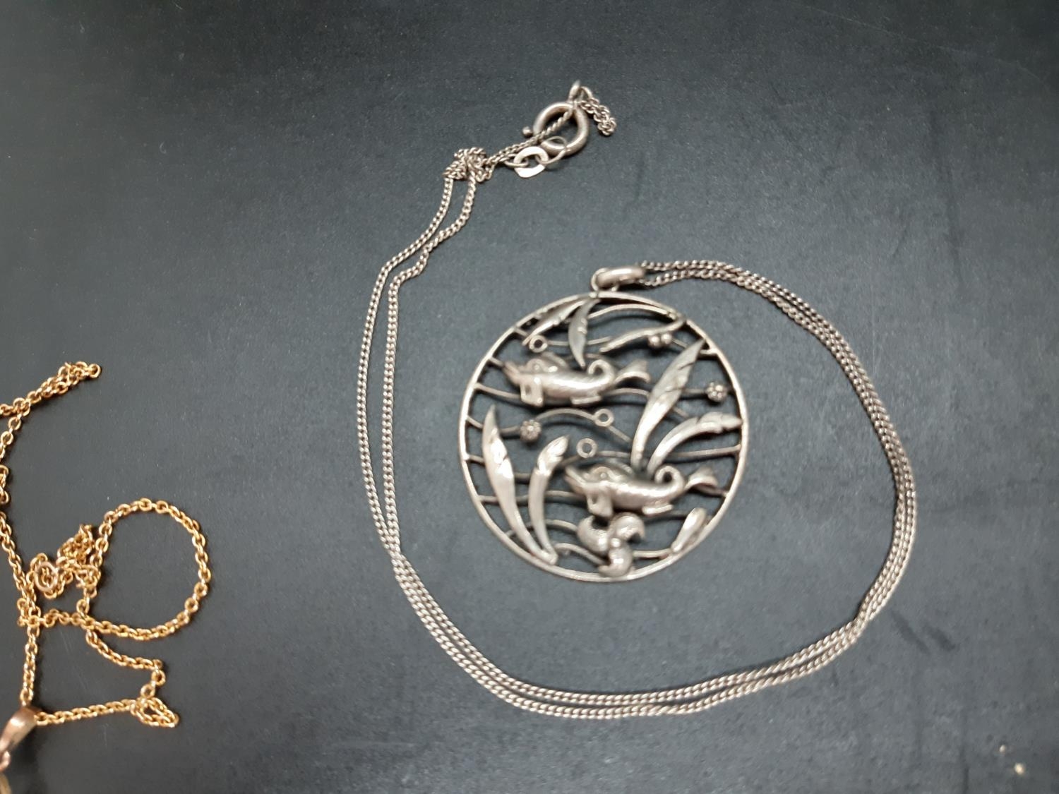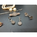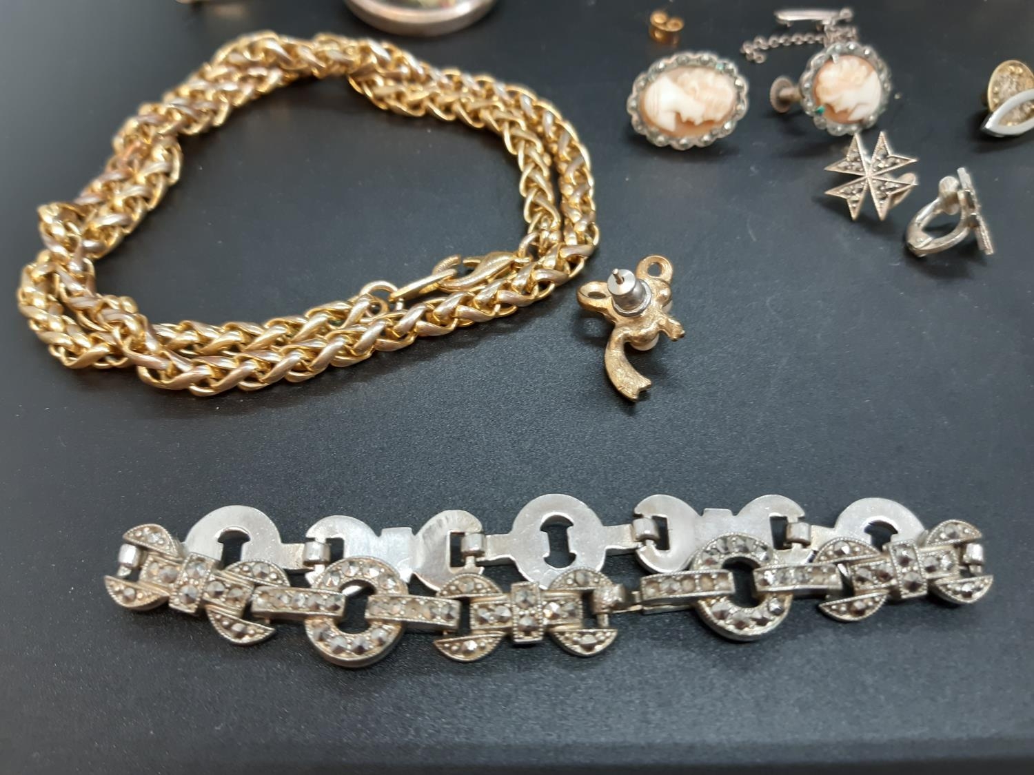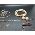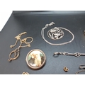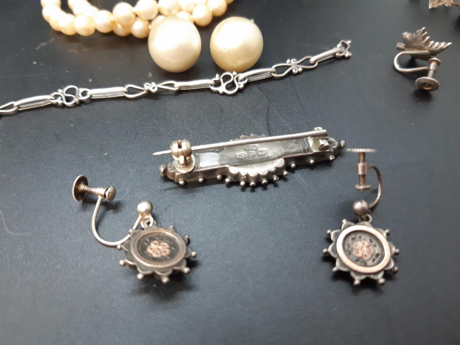 A Collection of vintage and antique jewellery comprising simulated pearl necklace, bearded gentleman printed portrait brooch in hallmarked 800 grade silver surround, two hallmarked silver marcasite brooches, a continental 800 grade silver circular necklace pendant with Fish design and white metal chain, a hallmarked Birmingham silver bar brooch with 9ct gold inlay, earrings, a hallmarked 9ct gold Edwardian necklace pendant with inset pale blue stones and unmarked gold coloured chain etc.