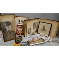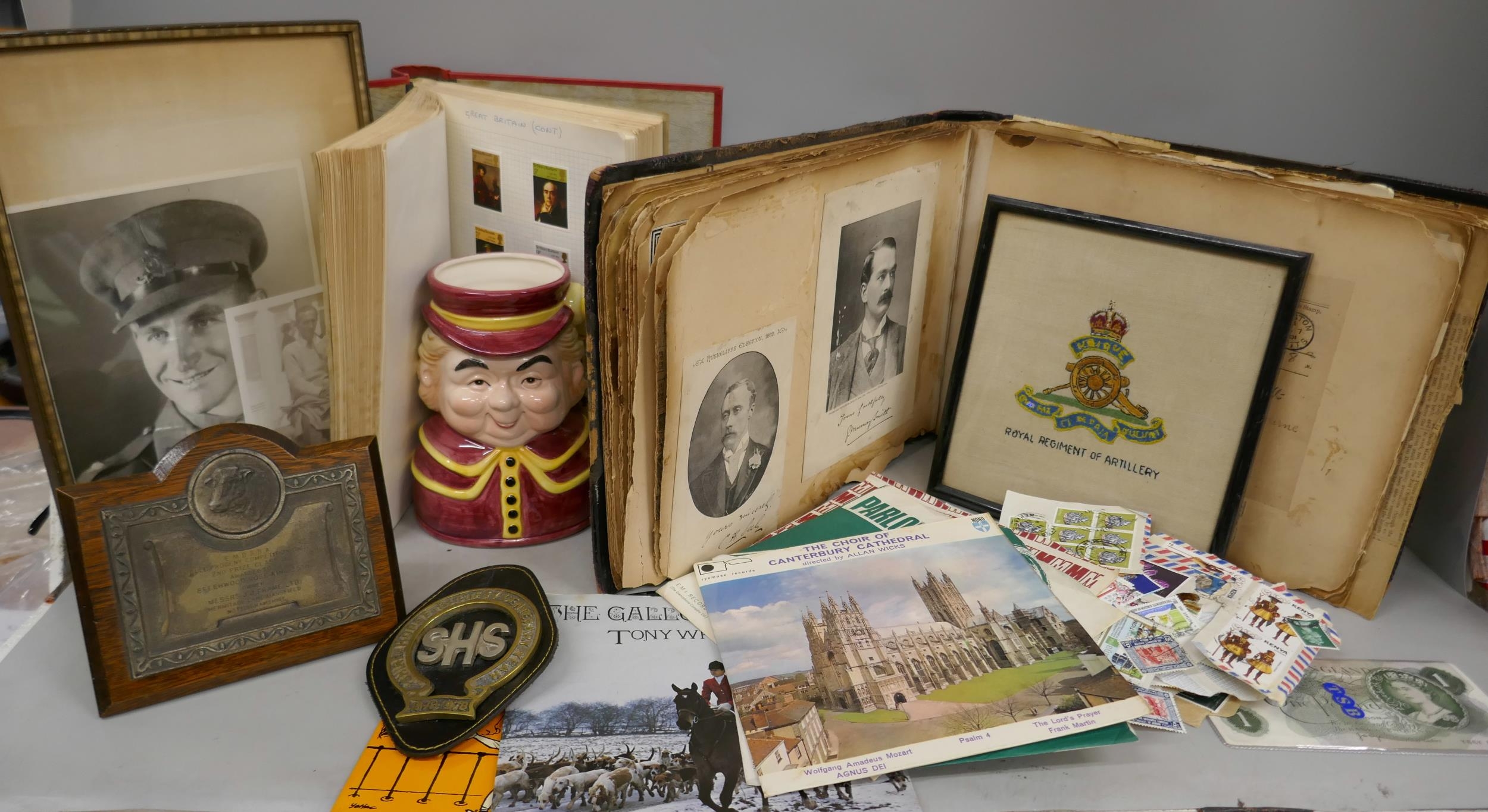 An album of Victorian/Edwardian photographs, postcards and news cuttings, stamps, a framed photograph of gentleman in military uniform, regimental embroidery, 7" singles, etc.