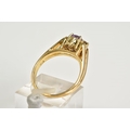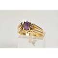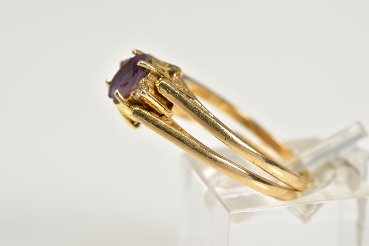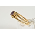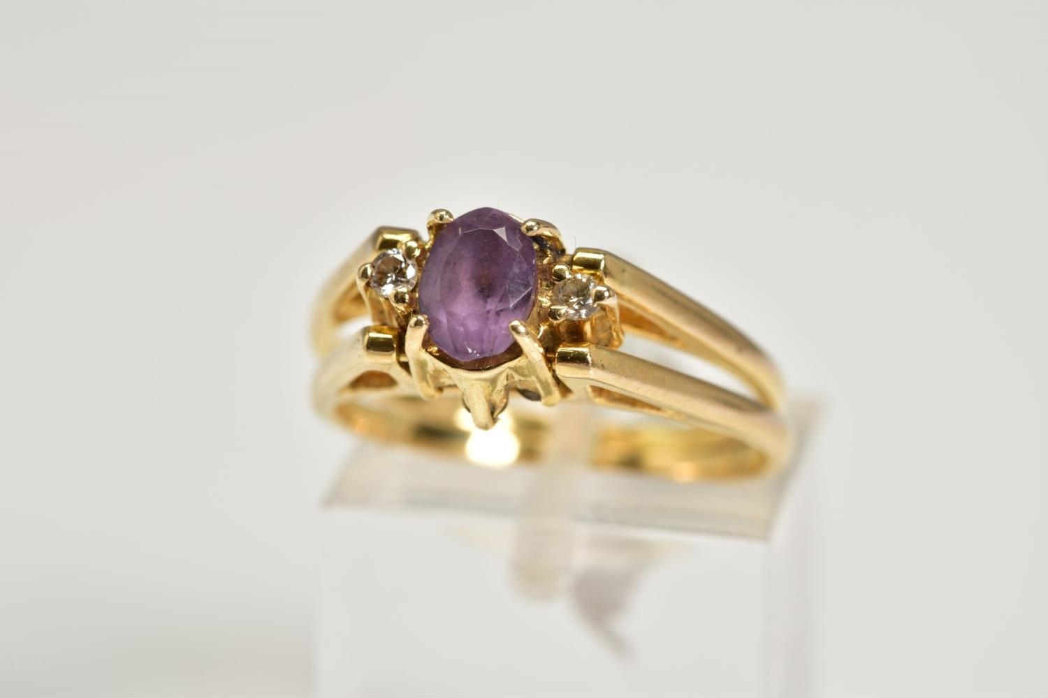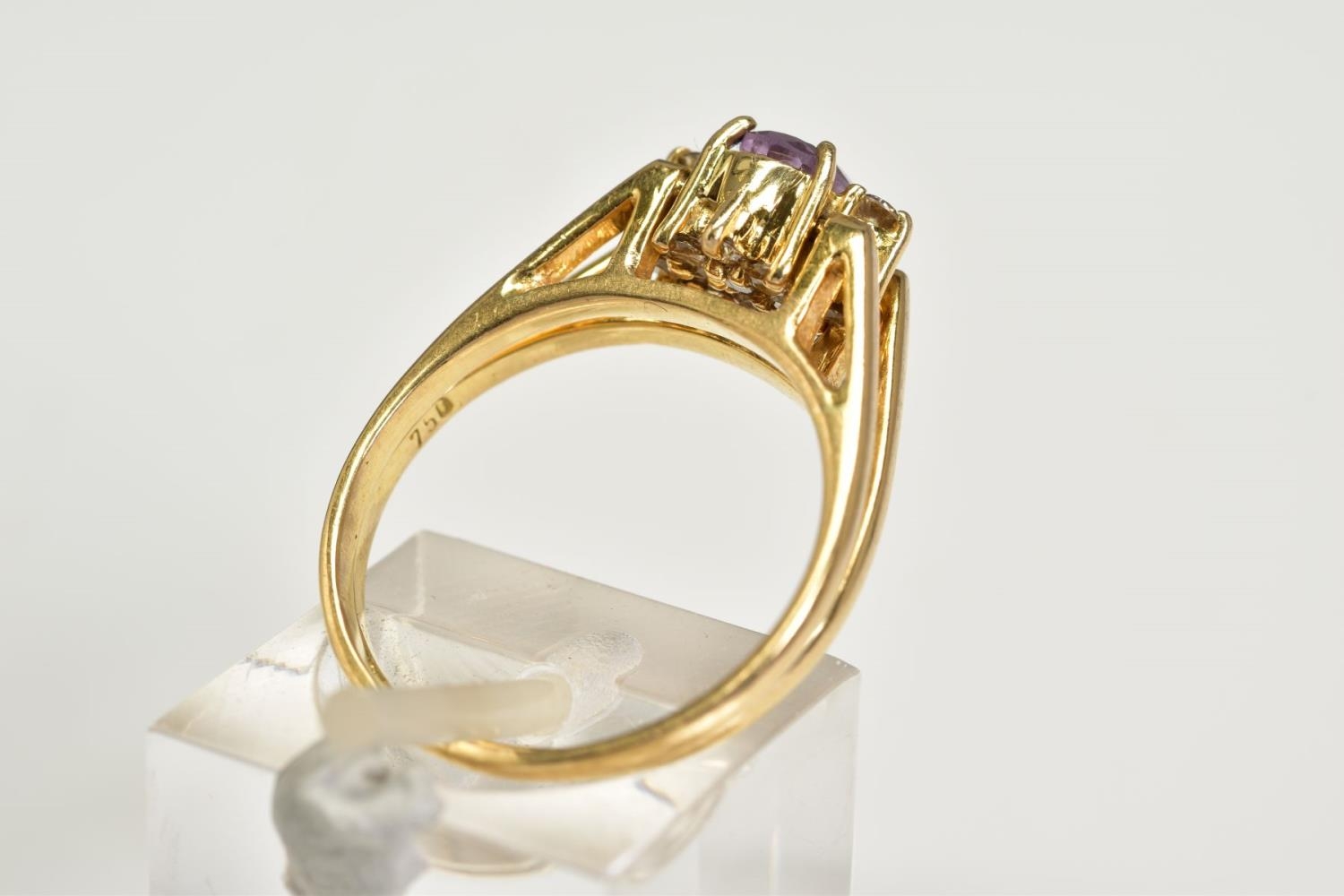 A DOUBLE SIDED SWIVEL RING, to one side a lozenge shape cluster set with round brilliant cut diamonds, swivels to reveal a second design set with an oval cut amethyst flanked with round brilliant cut diamonds, to a plain polished band, stamped 750, ring size N, approximate gross weight 5.2 grams