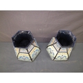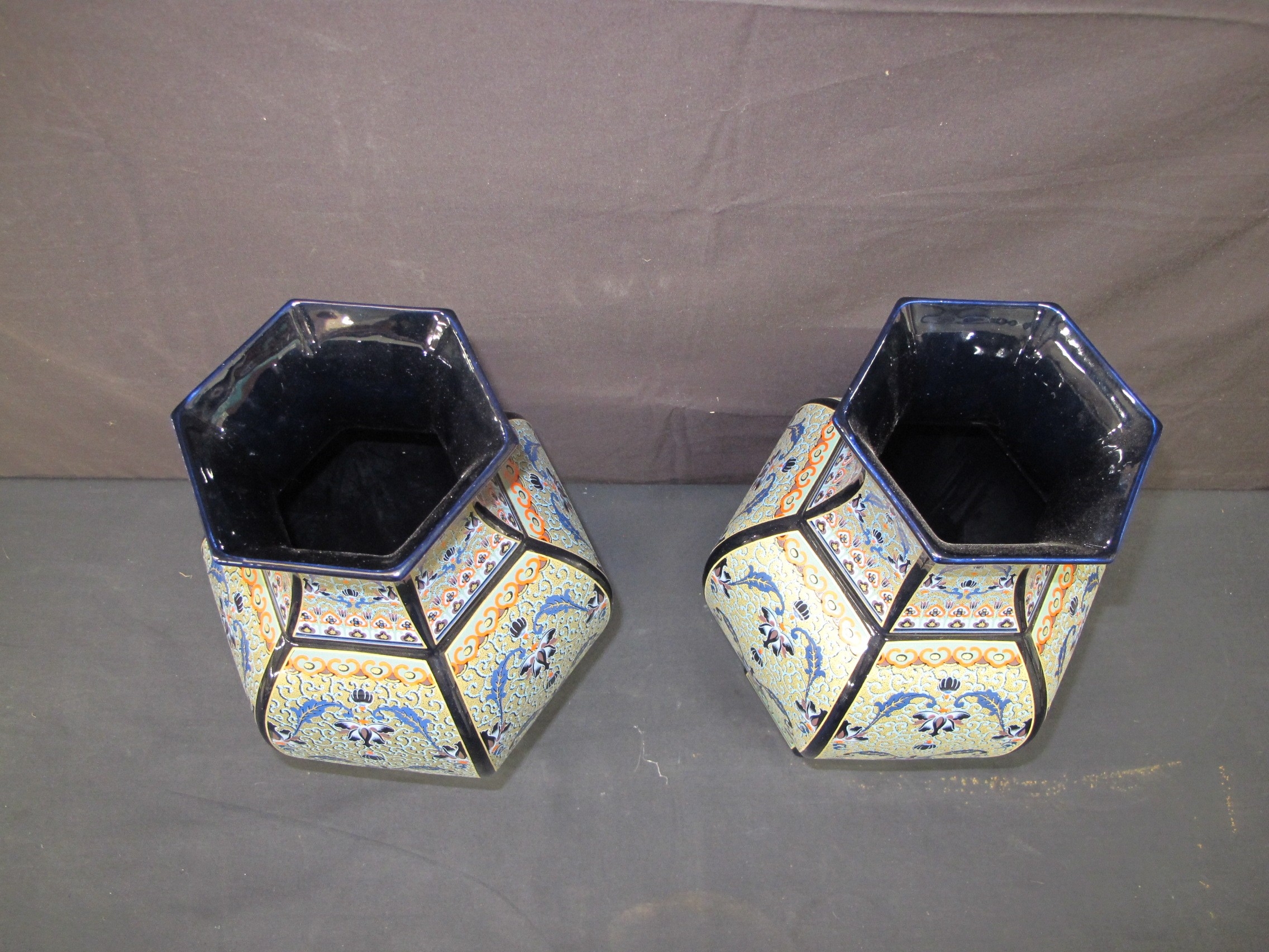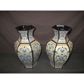 Pair of Decor Exclusiv porcelain vases of hexagonal shape with colourful raised hand painted and floral decoration, stamped Made in Italy