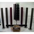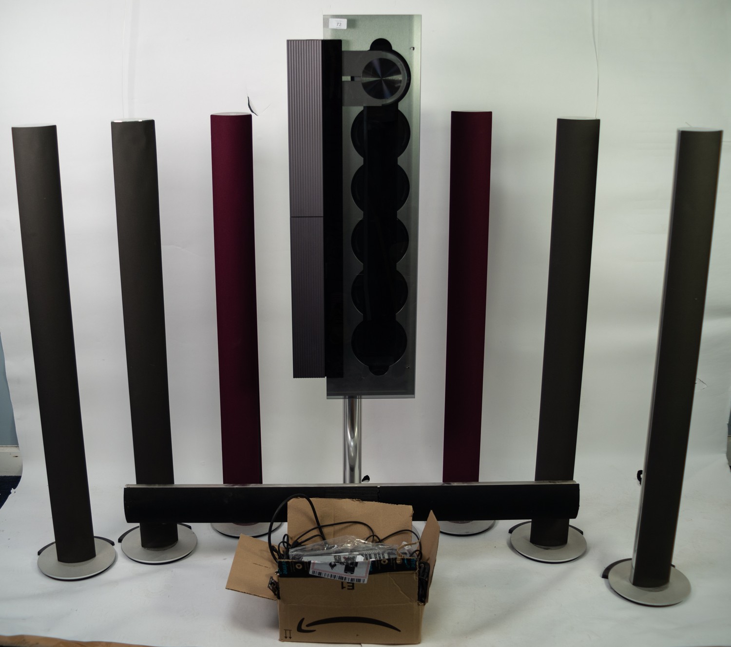 BANG & OLUFSEN SIX DISC CD PLAYER; a set of 4 bright metal cylindrical COLUMN LOUDSPEAKERS; a pair of purple cylindrical COLUMN LOUDSPEAKERS and a SOUND BAR (8)