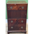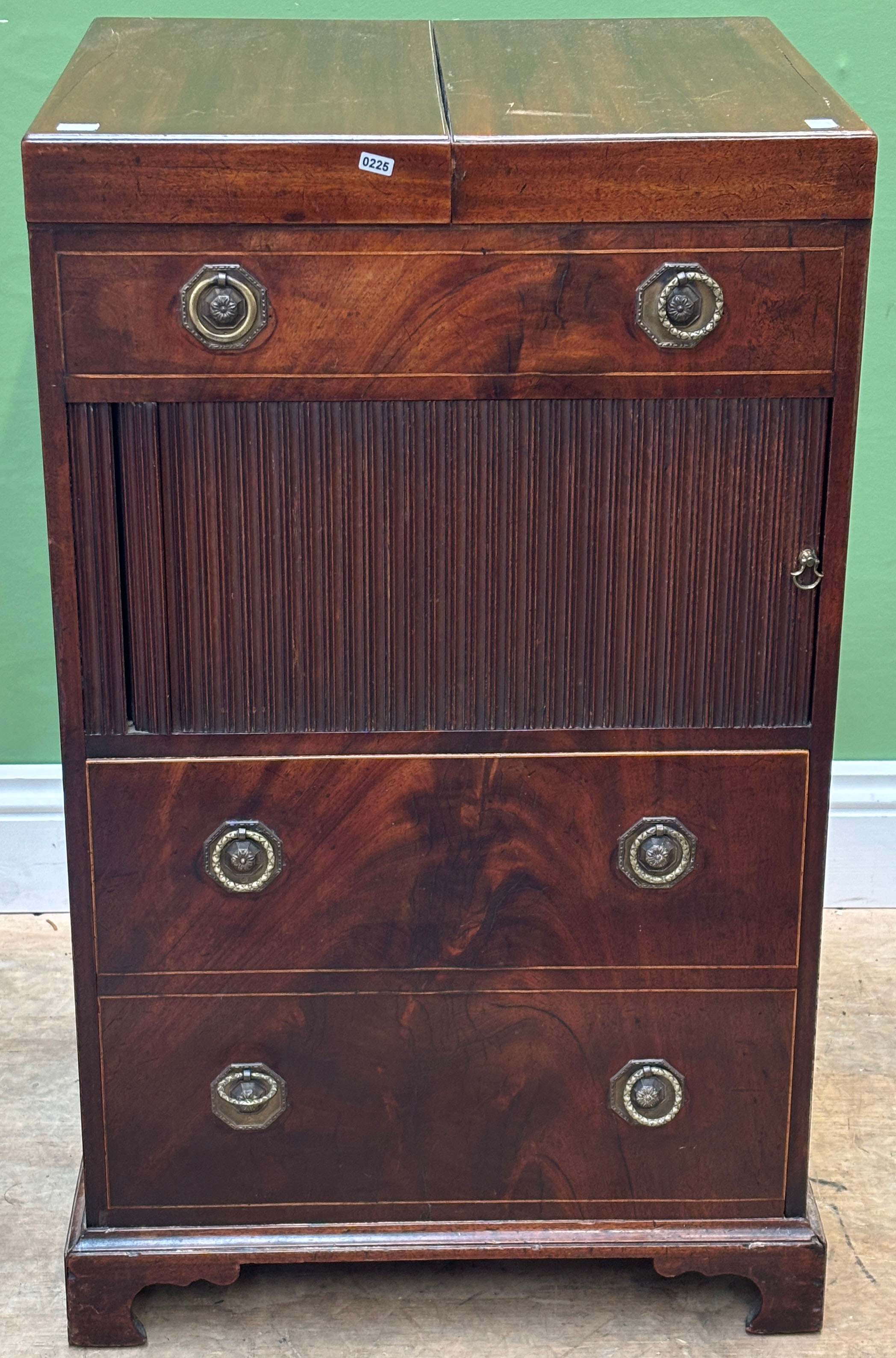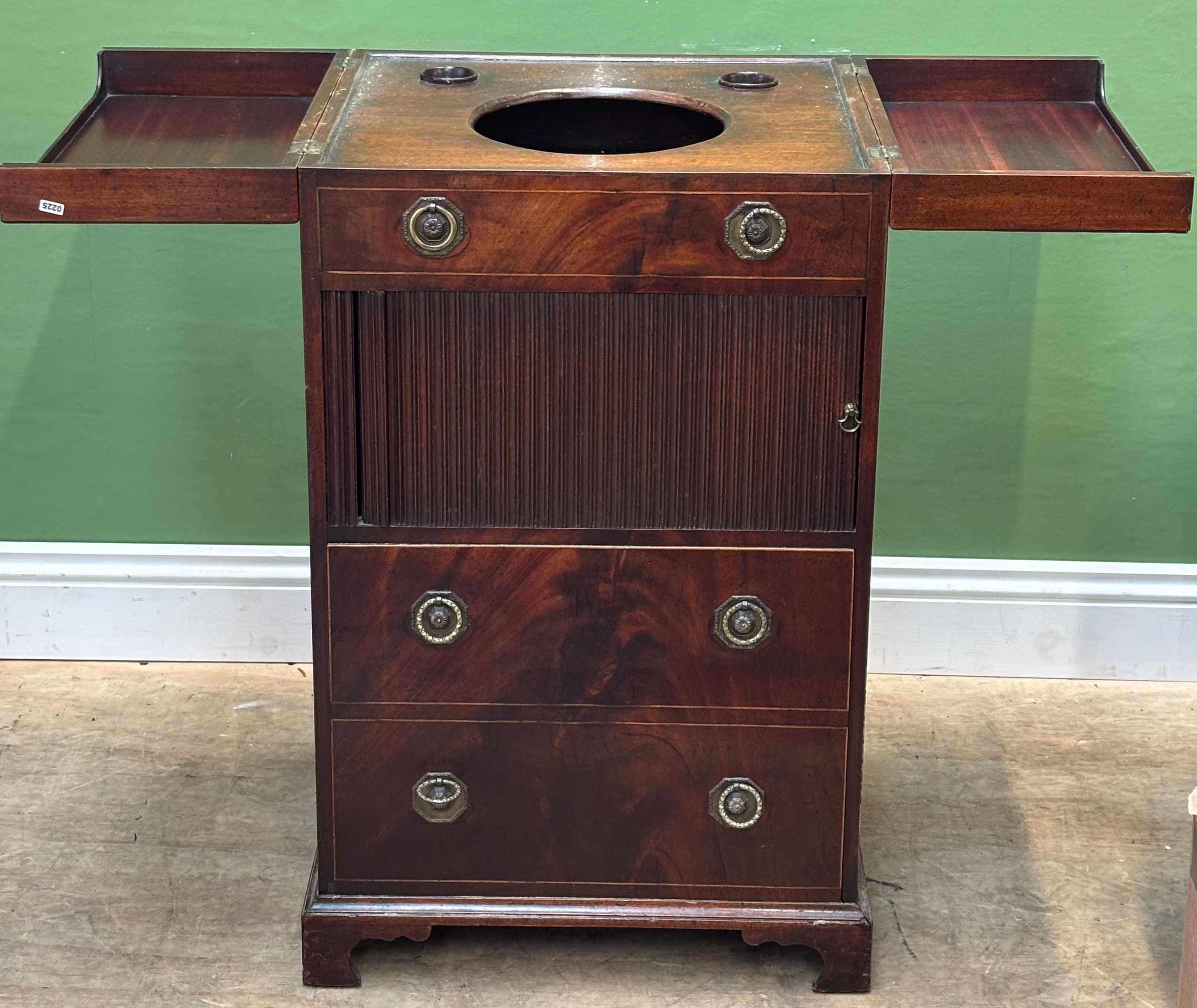 A George III mahogany washstand, the double hinged top opening to an aperture for a washbowl, over a tambour front and and commode drawer, 52x46x87cm