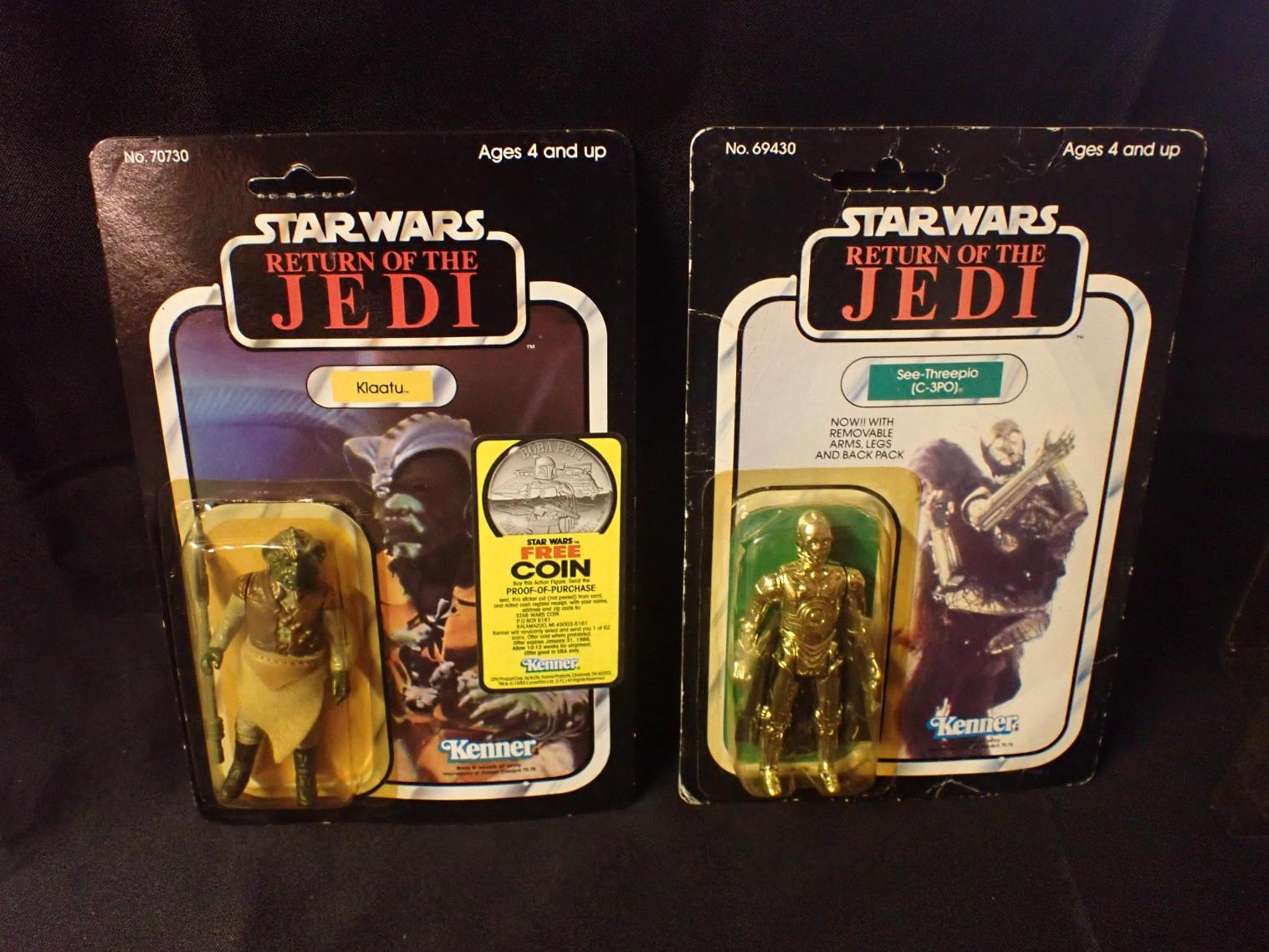 STARWARS RETURN OF THE JEDI 'KLAATU' AND 'SEE-THREEPIO' BY KENNER Nos.70730 (1983) and 69430 (1984), in bubbles on cards (C-3PO hanger punched out), both with Star Case (2) (both bubbles yellowed, C-3Po card with creases and and scuffs, Klaatu card warped)