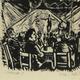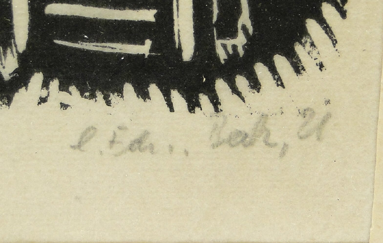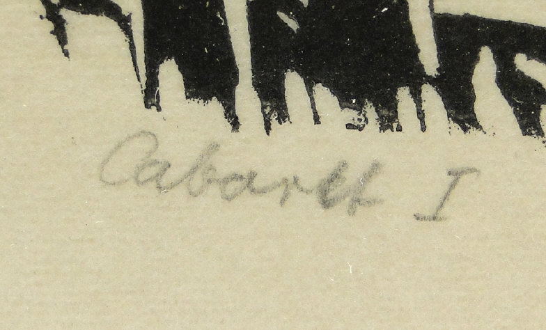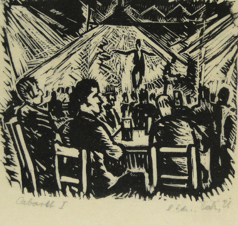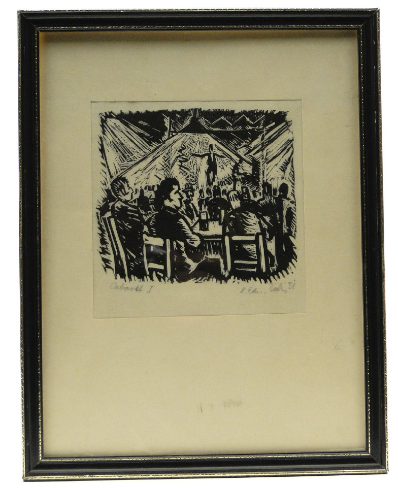 German? woodcut, titled Cabaret I, indistinctly signed, mounted and framed, 13cm x 13cm