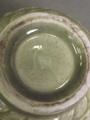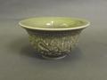 A Chinese olive ground bowl with raised decoration of dragons chasing the flaming pearl, mark to base, 4¾' diameter