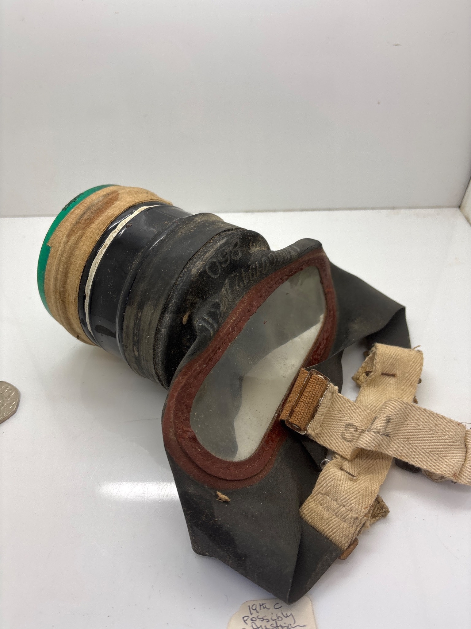 Military-style gas mask with straps and glass lens.