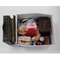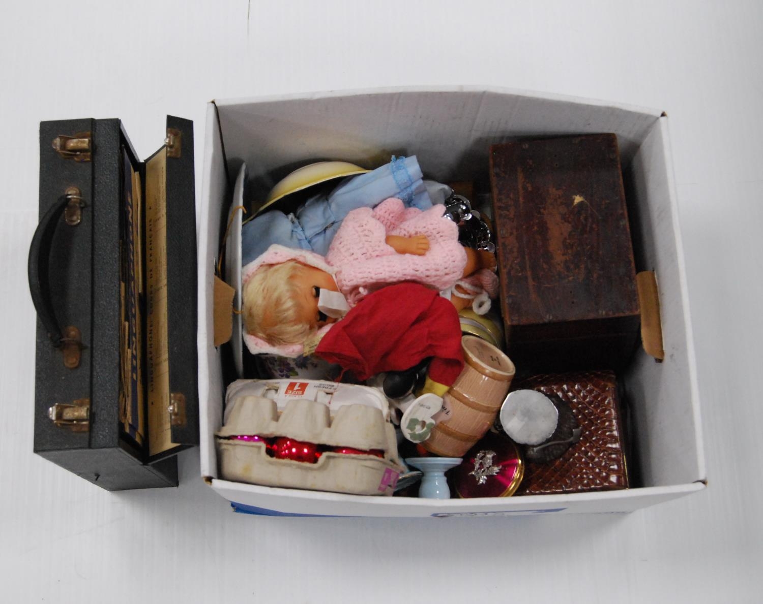 Collection of assorted ornaments to include Semco Mickey Mouse puppet, doll, china, compact, Linguaphone French language records etc.