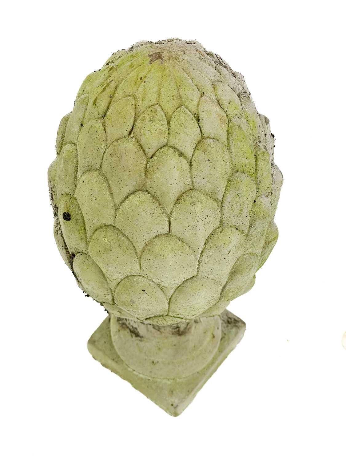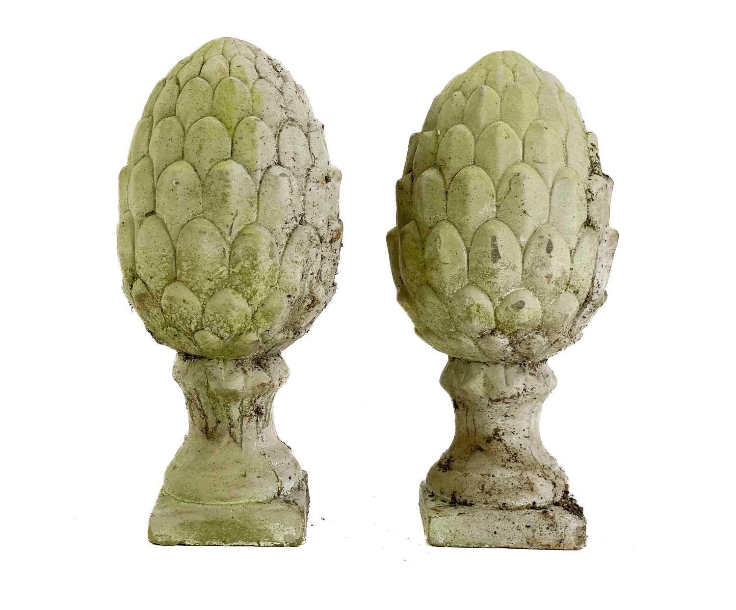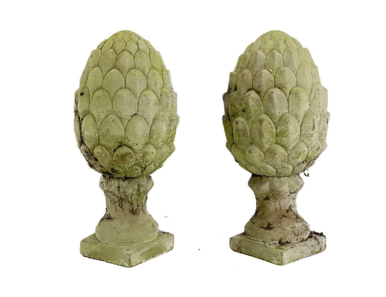 A pair of reconstituted stone artichoke finials. Height 29.5cm.