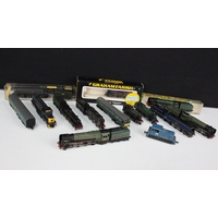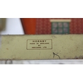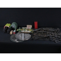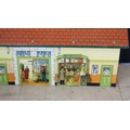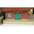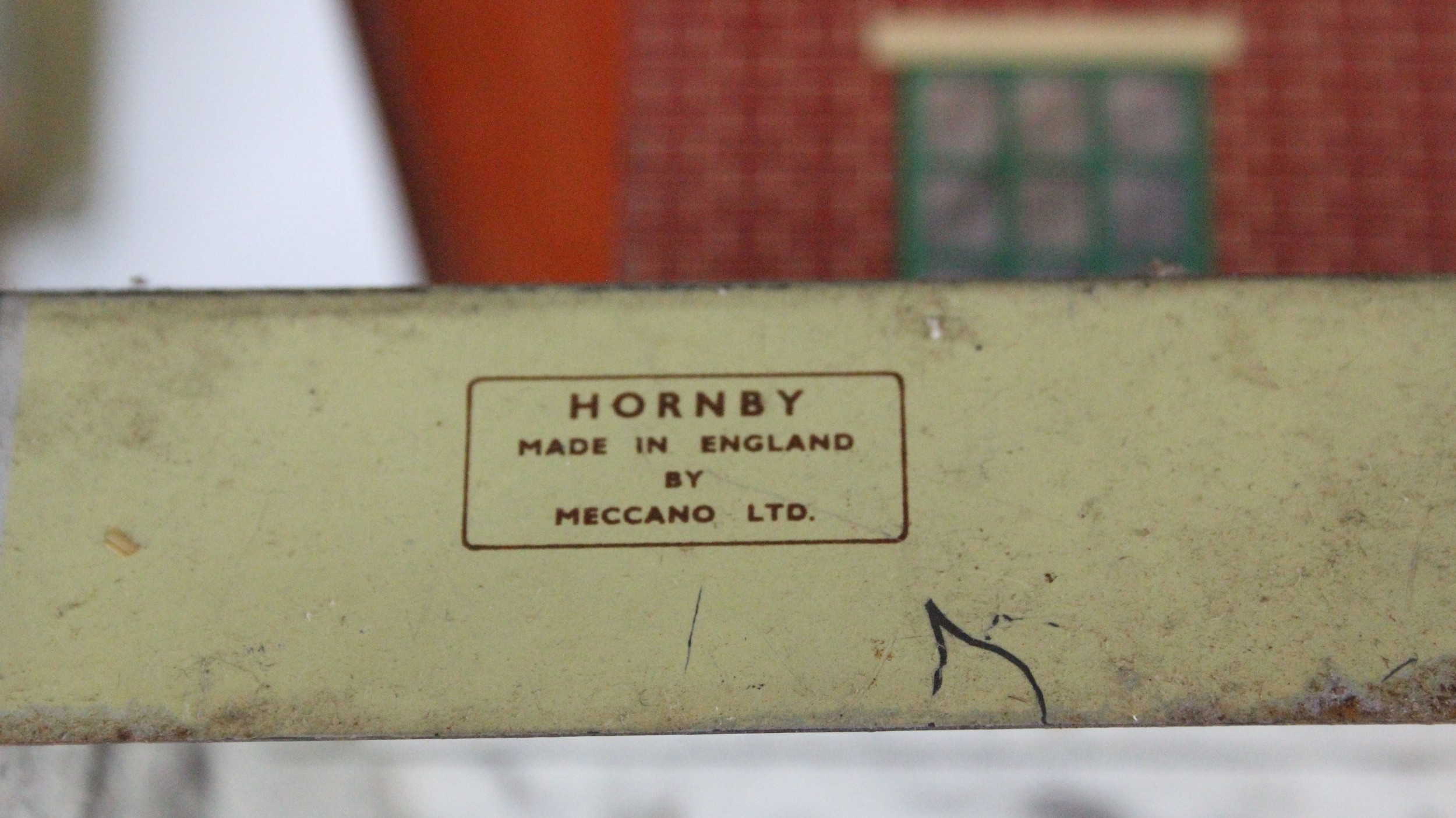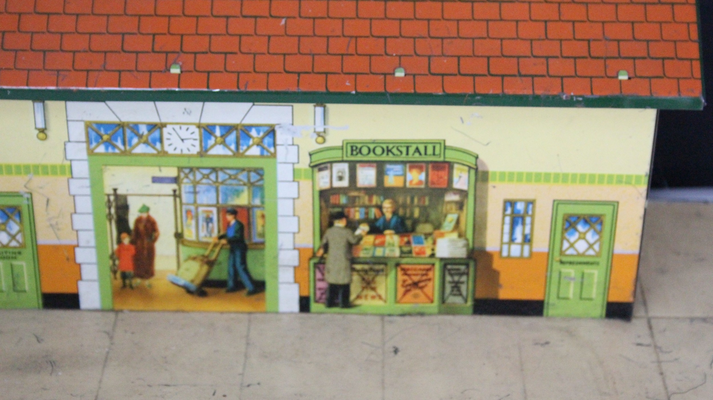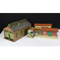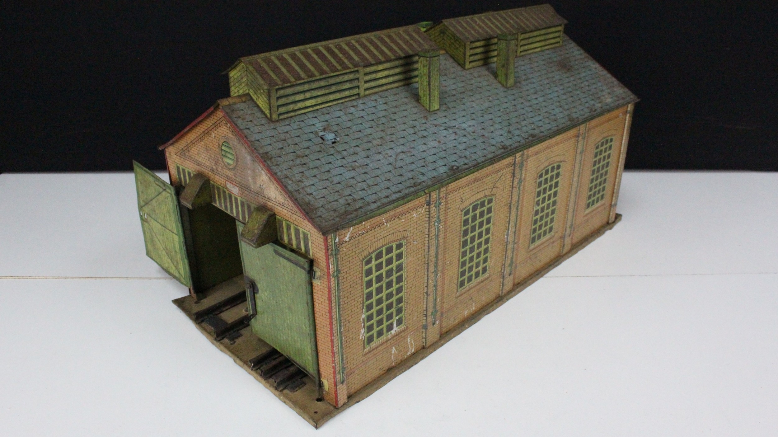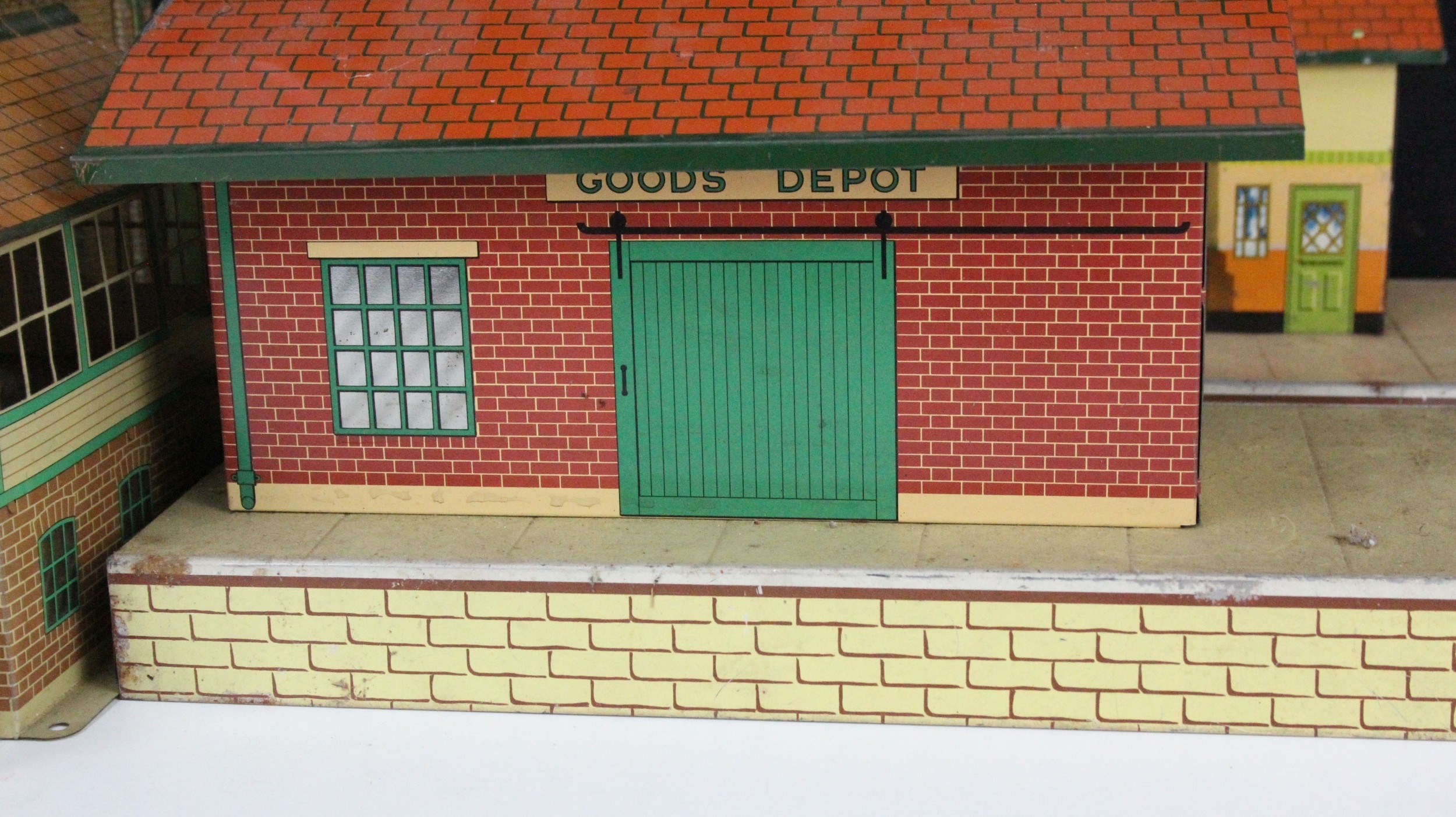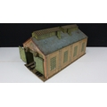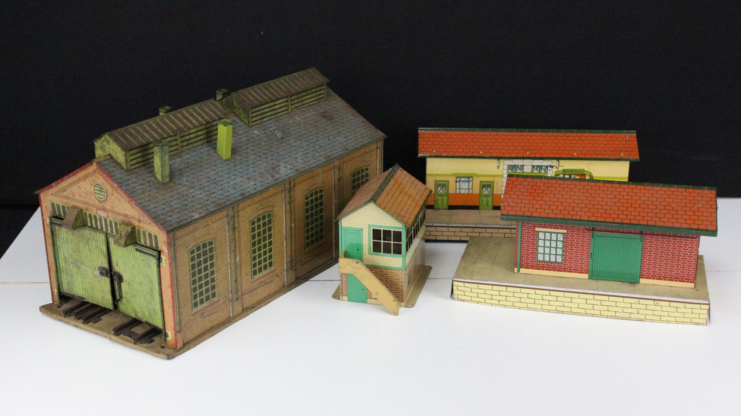 Four Hornby O gauge tin plate trackside buildings to include two track engine shed, Goods Depot, platform building with bookstall and signal box, showing marks and grubby in places