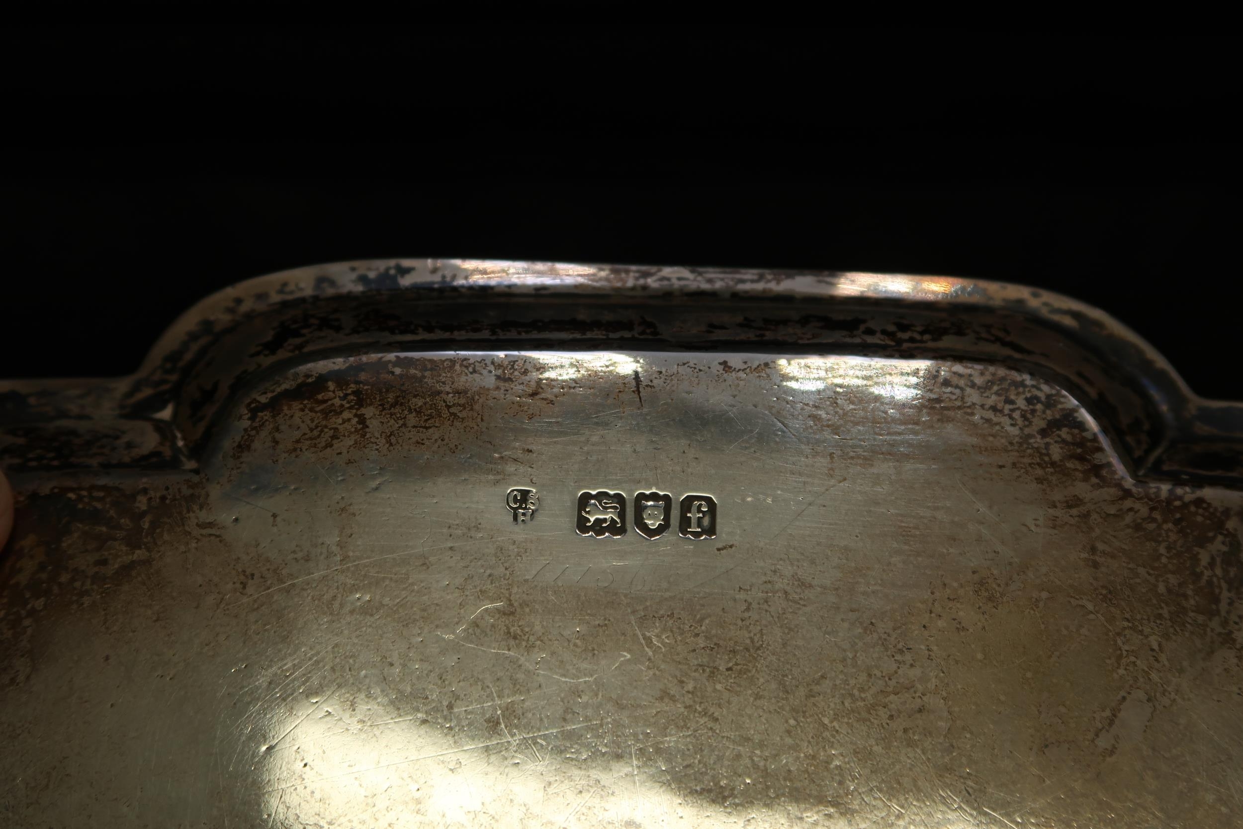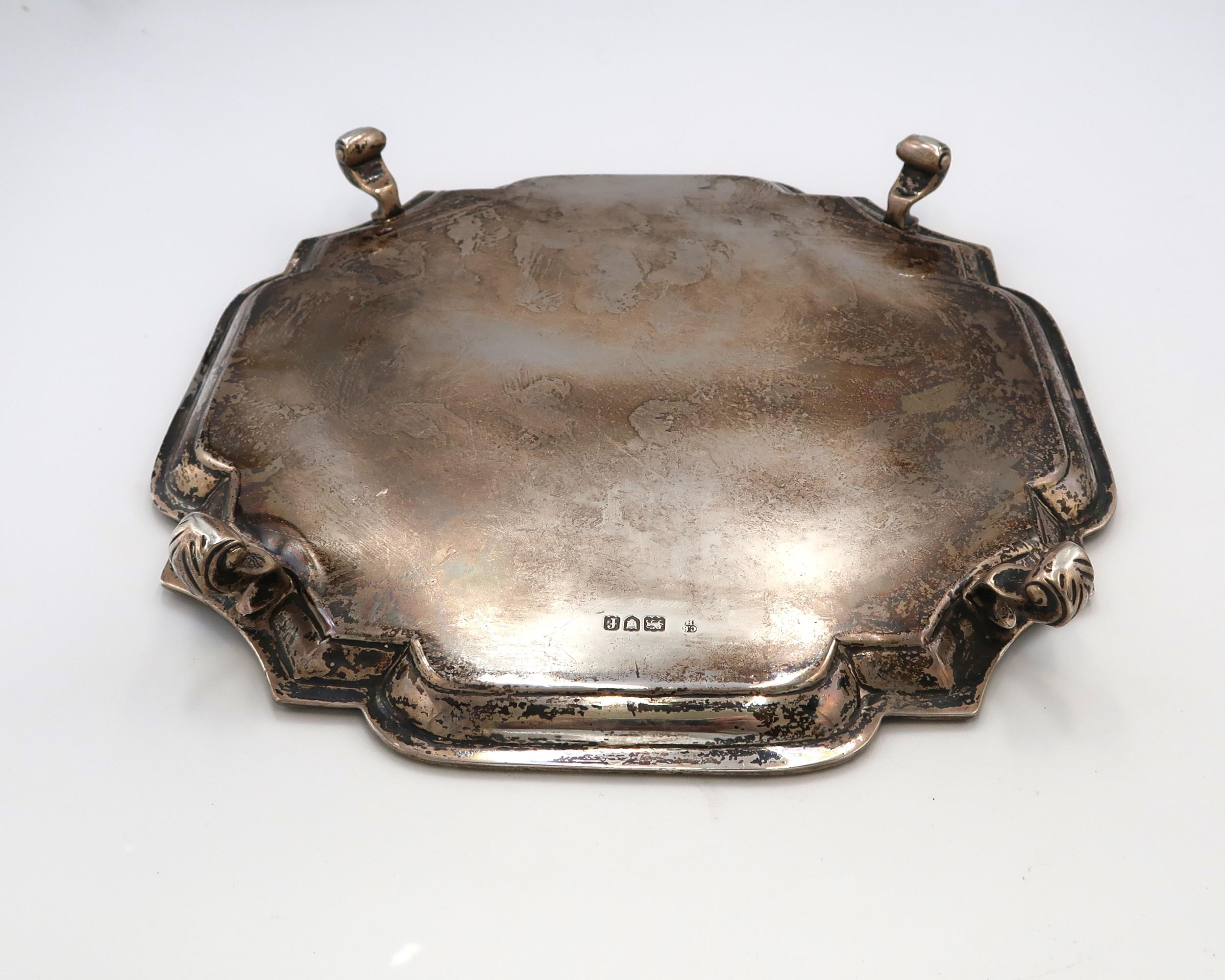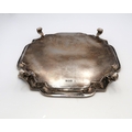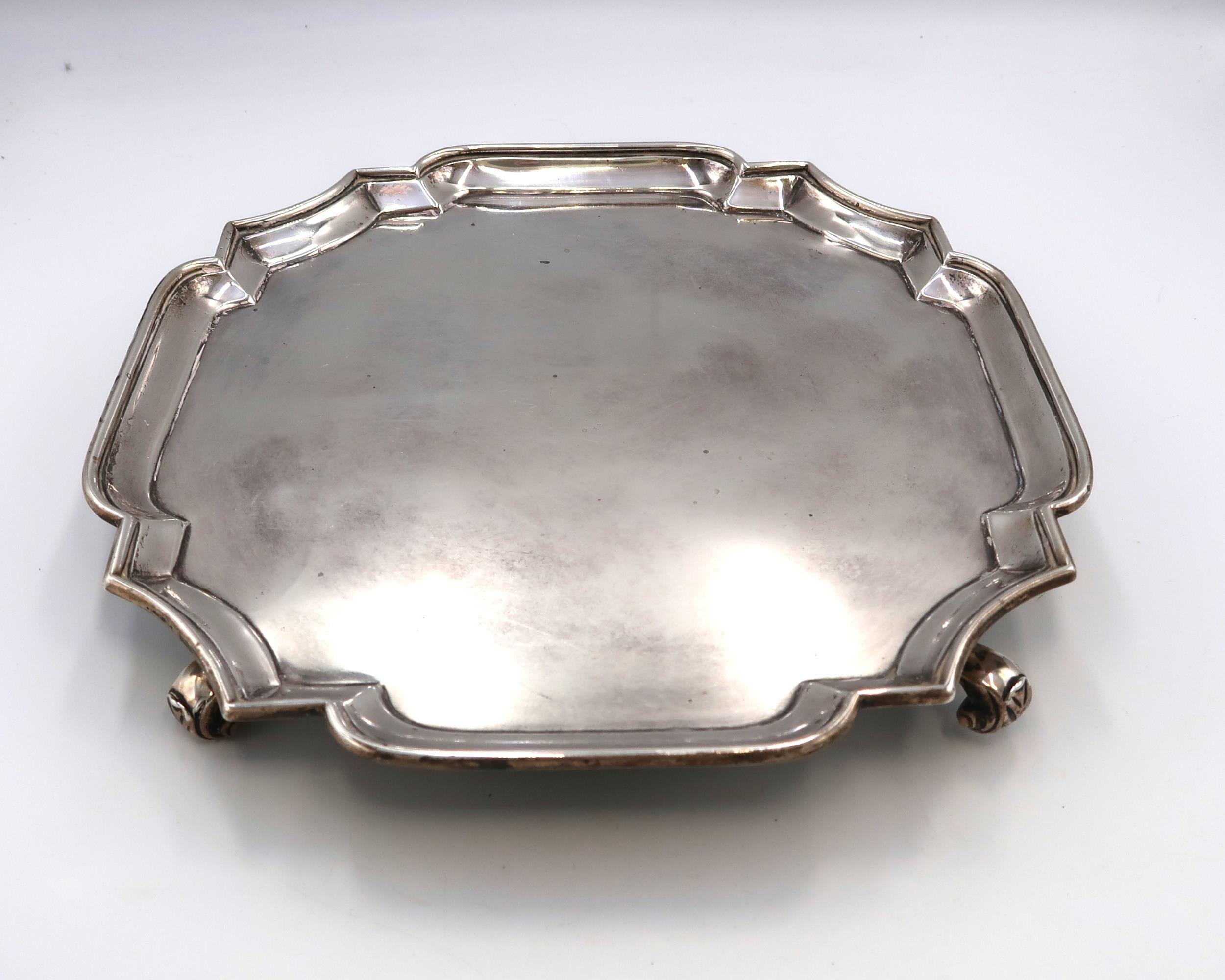 A late Victorian silver salver, with pie-crust rim, raised on four scroll feet, Charles Stuart Harris, London 1901, 25.5 by 25.5 by 3.5cm high, 20.32toz.