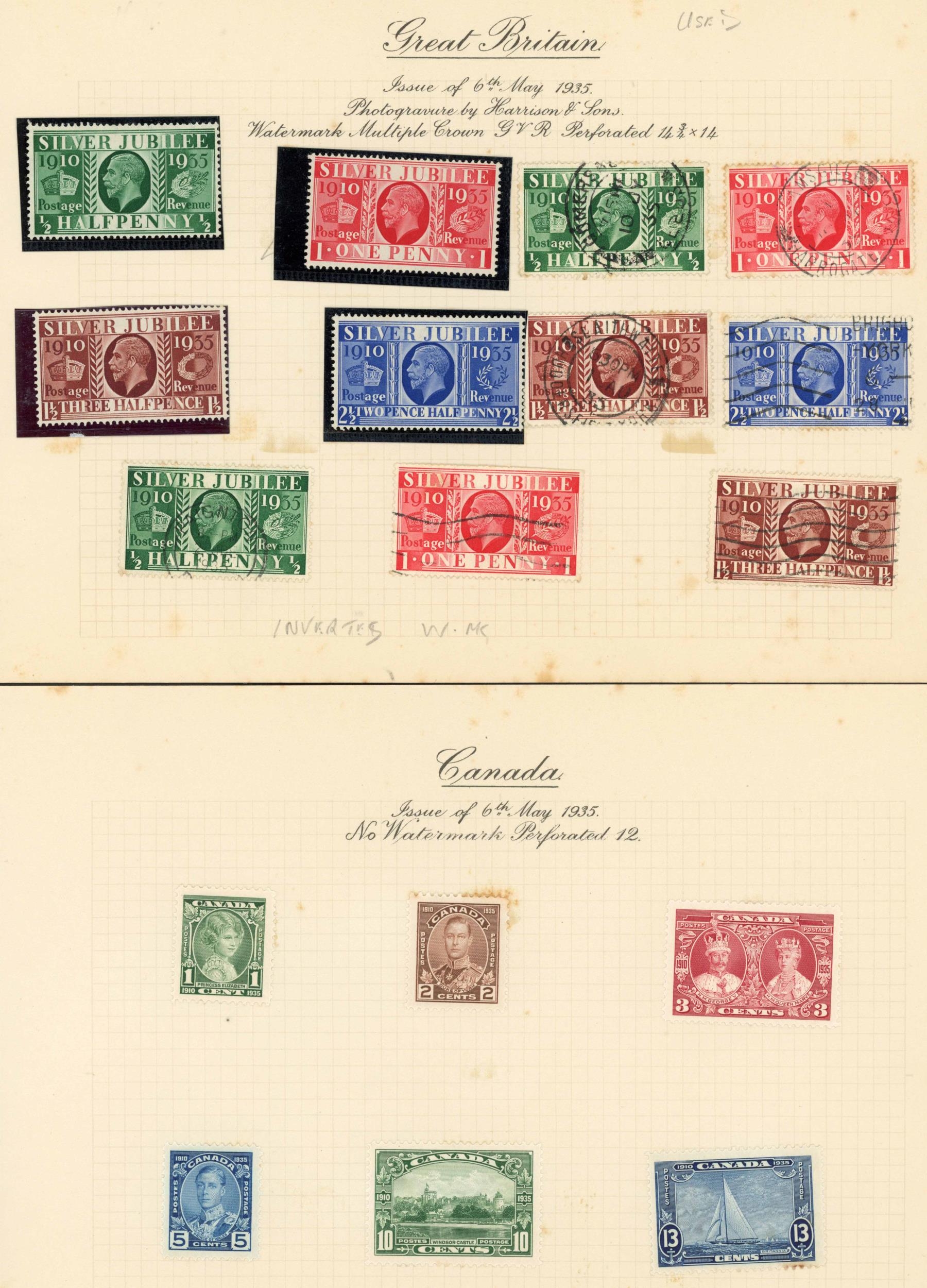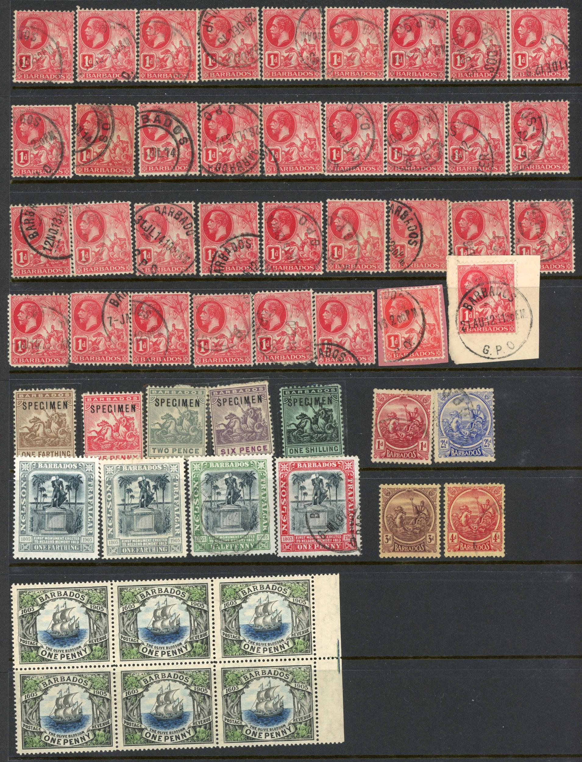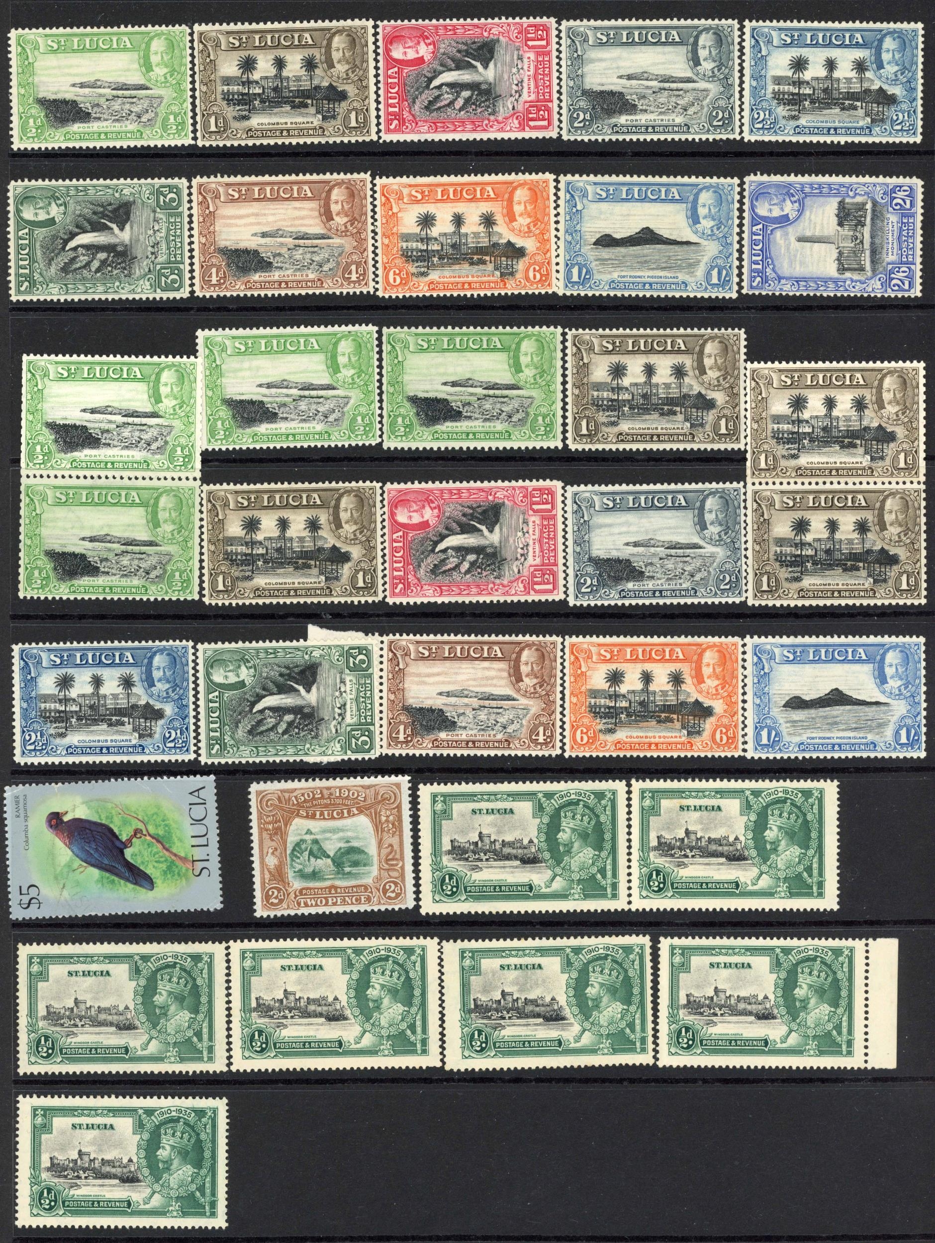BRITISH WEST INDIES KGV SELECTION - ANTIGUA, BARBADOS, ST. LUCIA: Includes mint 1936 pictorials (c.25) to 1/- value., Antigua KGV 'War Stamp' ½d & 1d issues in corner plate blocks of four (3 blocks) plus 3d (2) & 1/- defins. Also Barbados KGV duplicated 1d scarlet group, 1905 'Olive Blossom' block of six and a small group of KGV defins inc. 'Specimen' vals. to 1/-. Lot also inc. small range of 1935 KGV Silver Jubilee issues in a contemporary but remaindered album holding a few complete mint or used sets inc. India, Cook Is, Nauru, N. Rhodesia, Straits Setts., etc. (total c.104 stamps)Cross Reference: BARBADOS, SPECIMENS