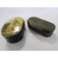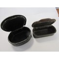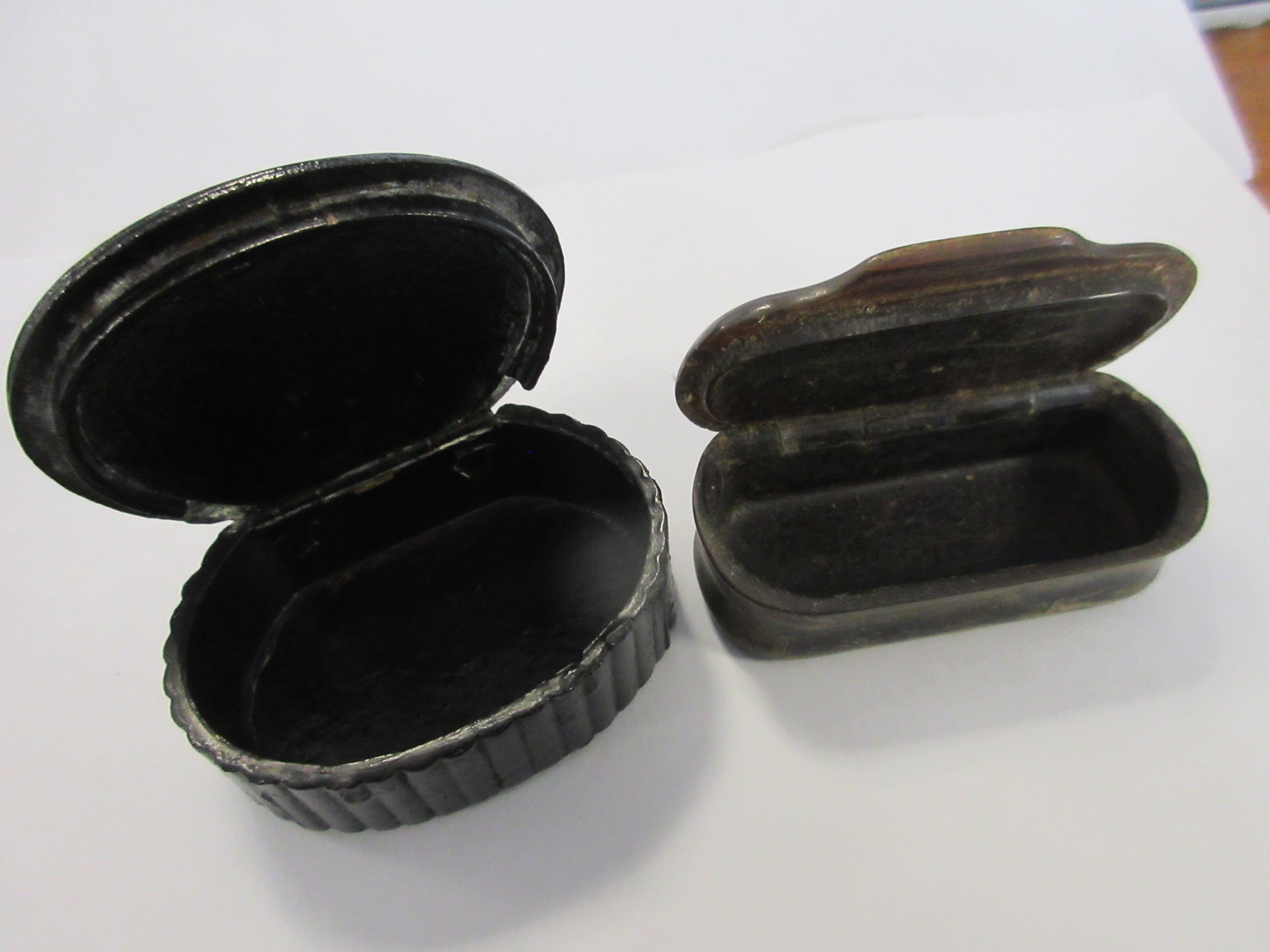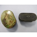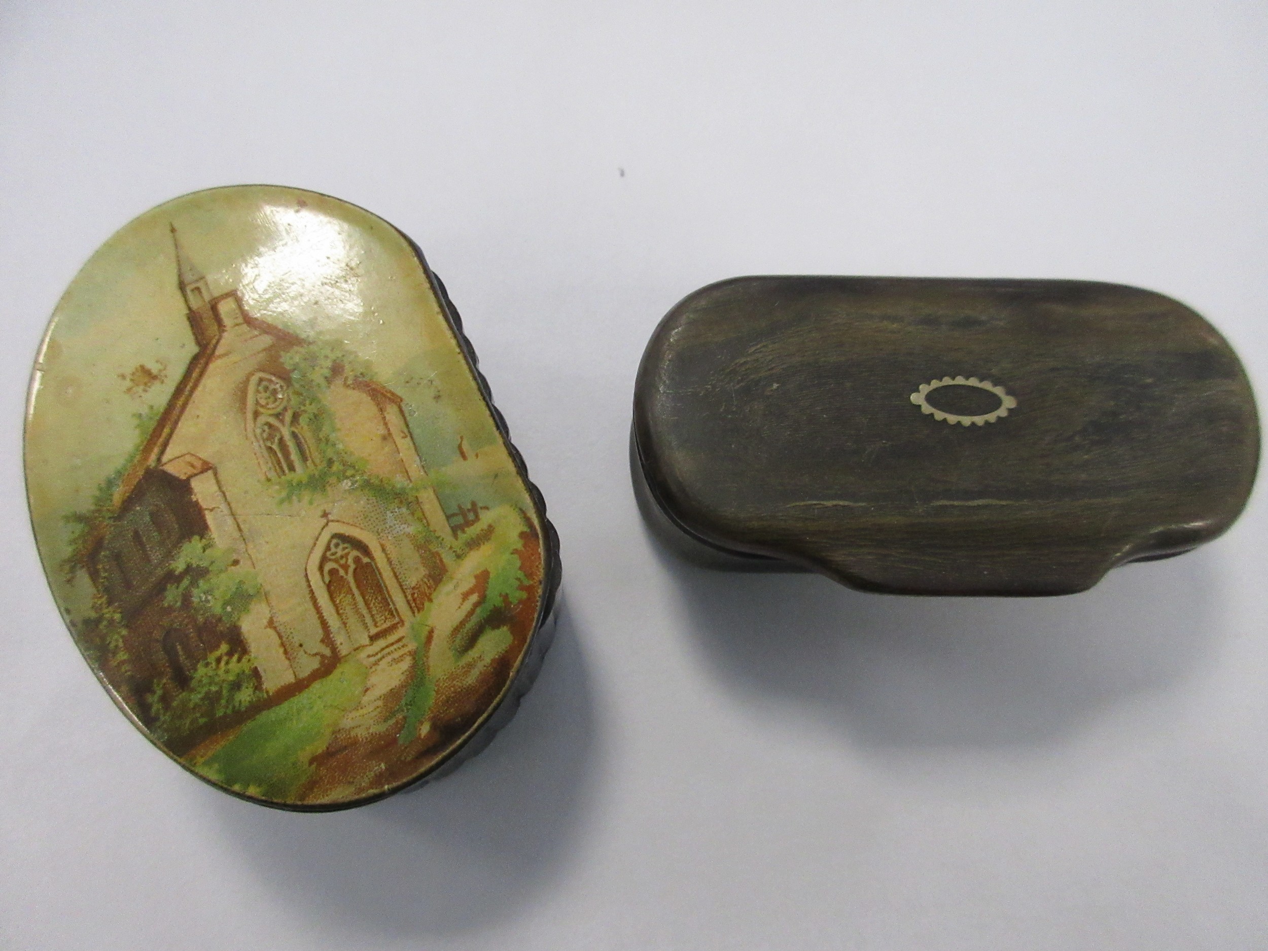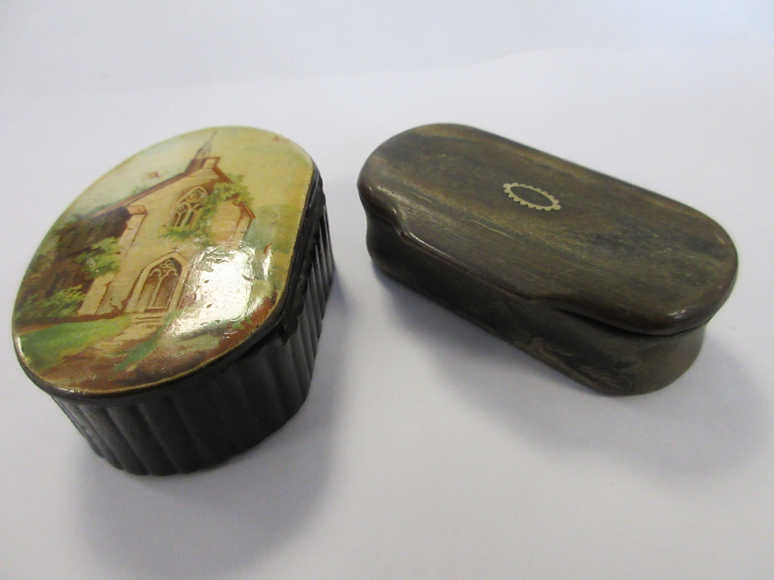 A pair of antique snuff boxes: one carved in horn with patterned white metal inlay ring to lid, the other of laquer with painted pastoral scene of a church to the lid. Both in good order