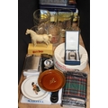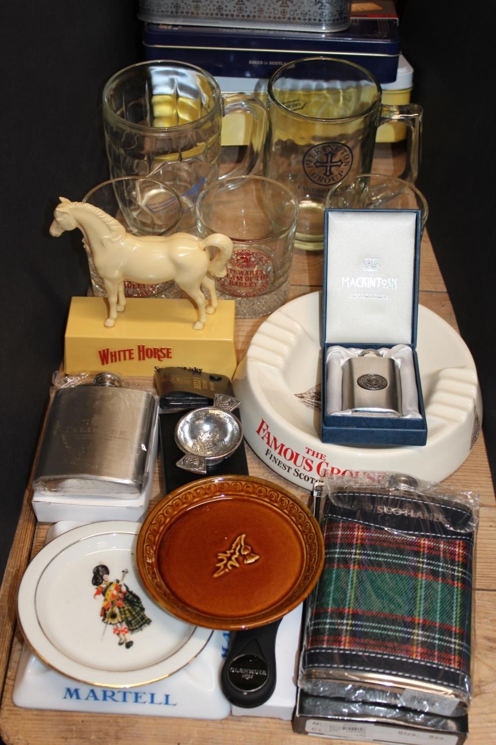 Whisky and alcohol advertising items to include a White Horse Scotch Whisky mascot, a White Label Scotch Whisky dish, a Famous Grouse ashtray, a Tallisker hip flask , a Martell ashtray, Stewarts Cream of the Barley glasses, whisky tins, etc.
