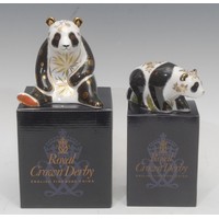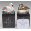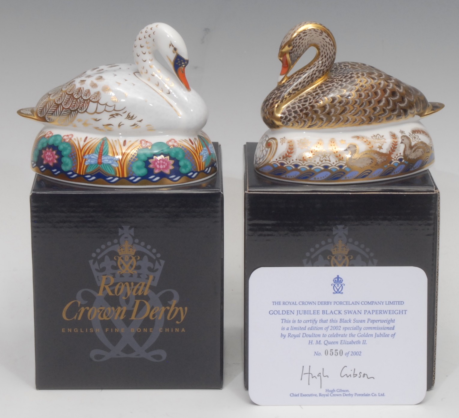 A Royal Crown Derby paperweight, Golden Jubilee Black Swan, commissioned by Royal Doulton to celebrate the Golden Jubilee of H.M. Queen Elizabeth II, limited edition 550/2002, gold stopper, 10cm high, printed mark in red, certificate, boxed; another, Swan, gold stopper, 10cm high, printed mark in red, boxed (2)