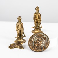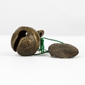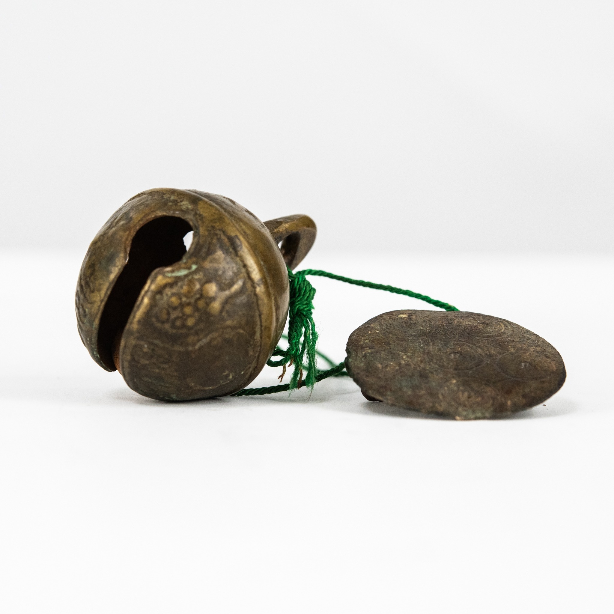 ANCIENT BRONZE DISC SHAPED BUCKLE, engraved with six circles each with a pin hole pierced centre, 1 3/8in (3.5cm) and an ANTIQUE CAST BRONZE GLOBULAR BELL, embossed with bunches of grapes and the numeral 8, 1 3/8in (3.5cm)