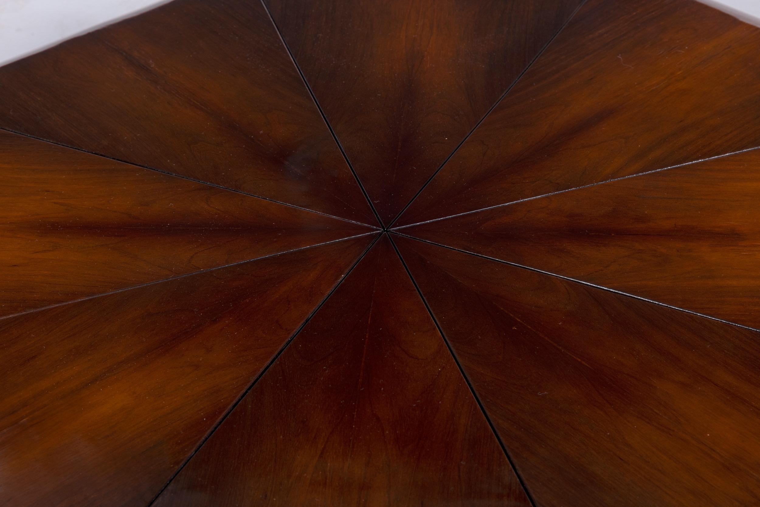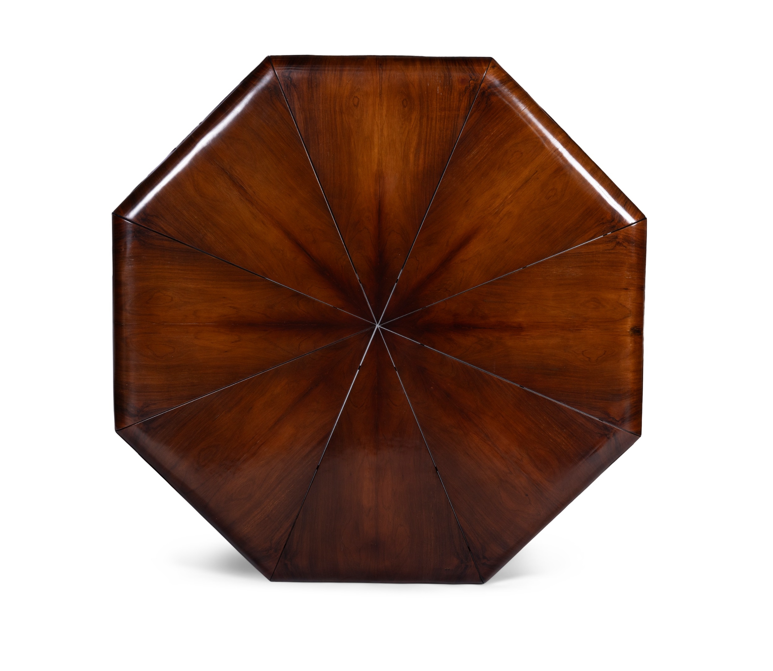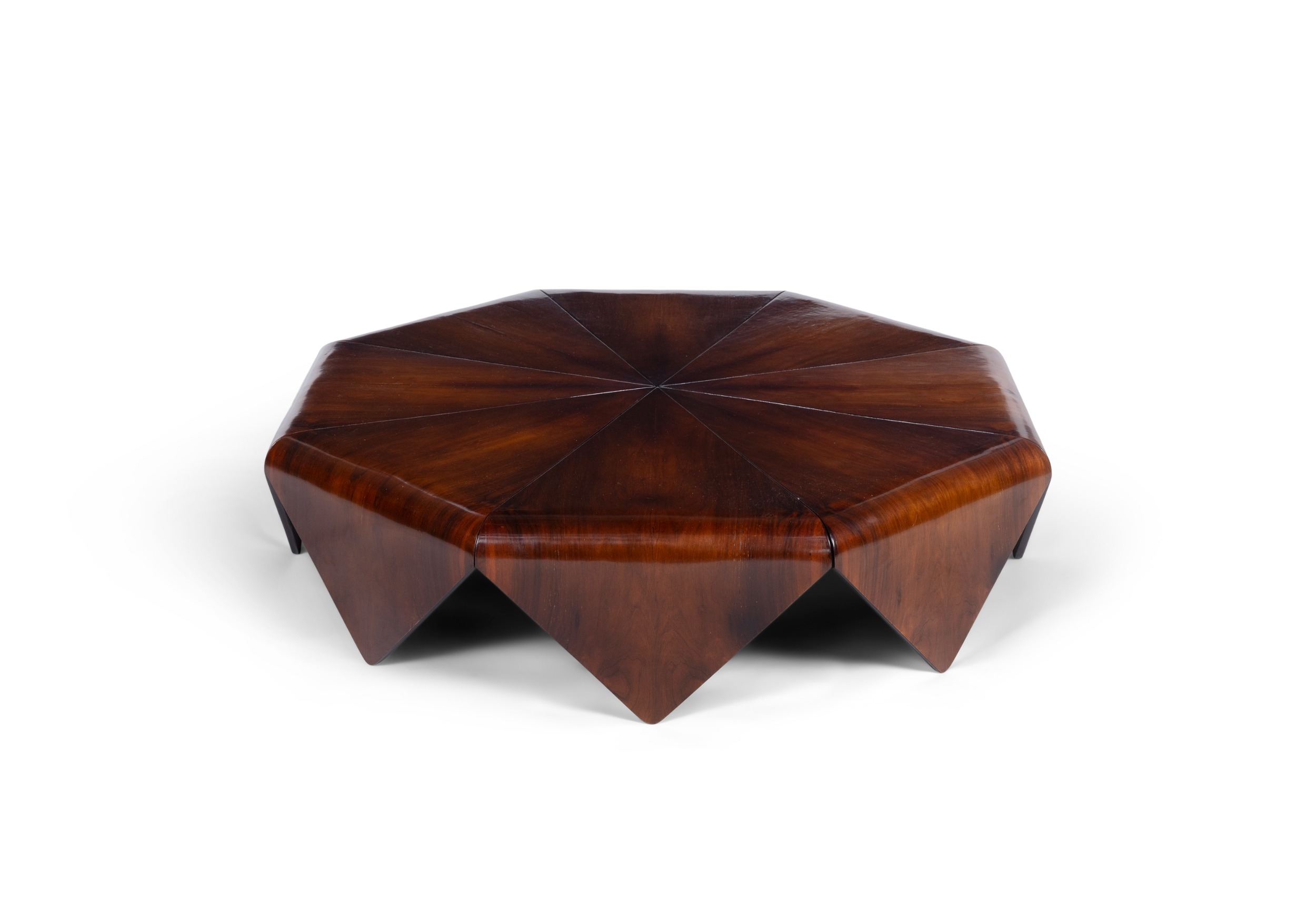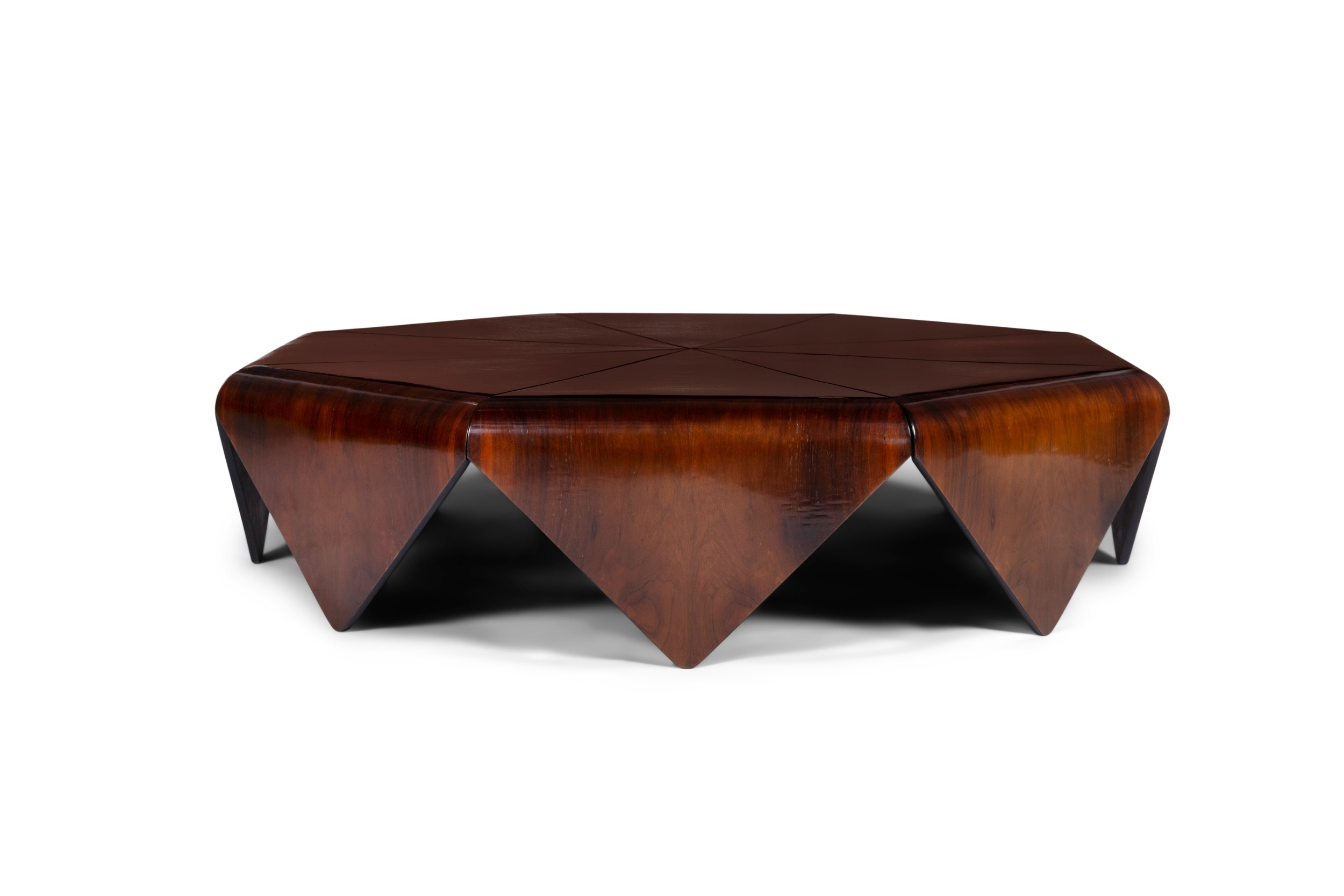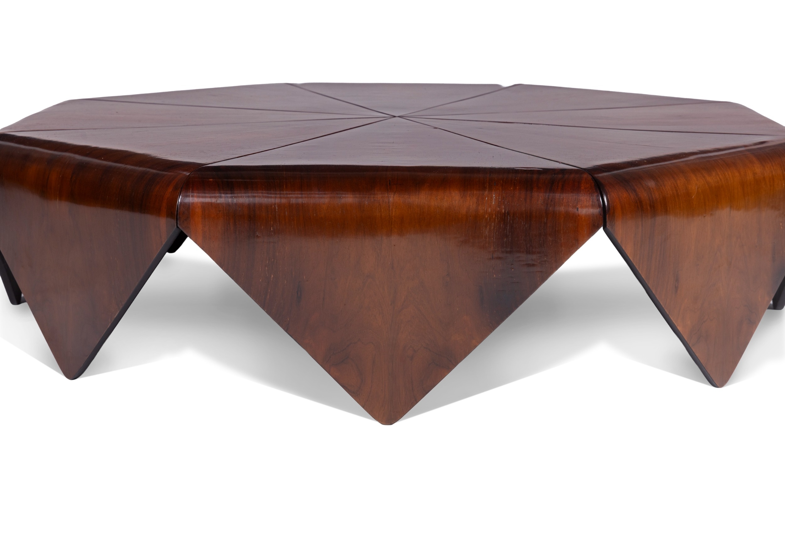 JORGE ZALSZUPIN (1922-2020) ‘Jacaranda’ coffee table by Jorge Zalszupin. Brazil, c.1960. With maker's label. 130 × 130 × 28cm (h). Jorge Zalszupin (1922–2020) stands among the great architects/designers of Brazilian modernism, a figure whose work balances sensuous organic form with rigorous structural clarity. Born in Warsaw, he trained in Romania, and arrived in Brazil in the late 1940s, where he founded L’Atelier in 1959 in São Paulo. There he brought together architecture, engineering and artisanal craft to produce furniture of the highest quality: elegant woods (particularly Brazilian rosewood/jacaranda) and was strongly influenced by the Scandinavian designers of the time. Among Zalszupin’s signature pieces, include the Petalas coffee table, first designed around 1959-1962. The Petalas design evokes flower petals, with an octagonal layout composed of petal-like segments. The organic imagery reflects a desire to interpret geometry through nature, a poetic take on structural constraint. The larger version uses eight petals; smaller variants have four. The Petalas table captures many of Zalszupin’s core concerns: minimal ornament, excellence in material, structural innovation, and an approach to modernism that isn’t cold but lyrical. It is considered one of his most iconic works. It also epitomises mid-century Brazilian design’s embrace of local woods and craftsmanship combined with modernist ideals.