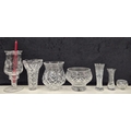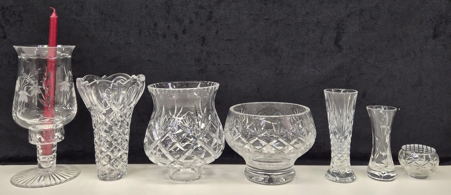 7 pieces of crystal decor. To include candleholder, vases & rose bowl. Makers include Edinburgh Crystal. Tallest 23cm.