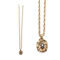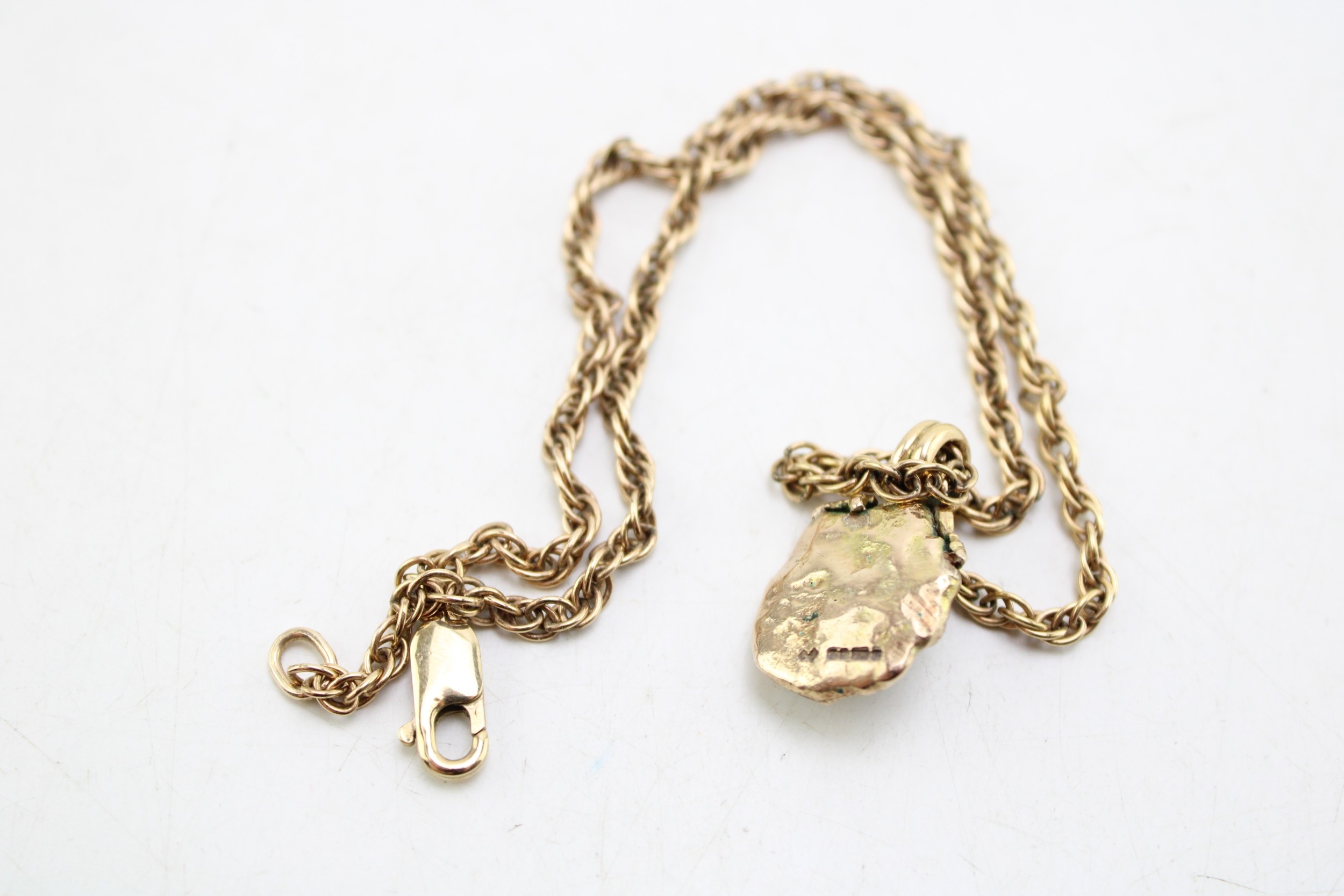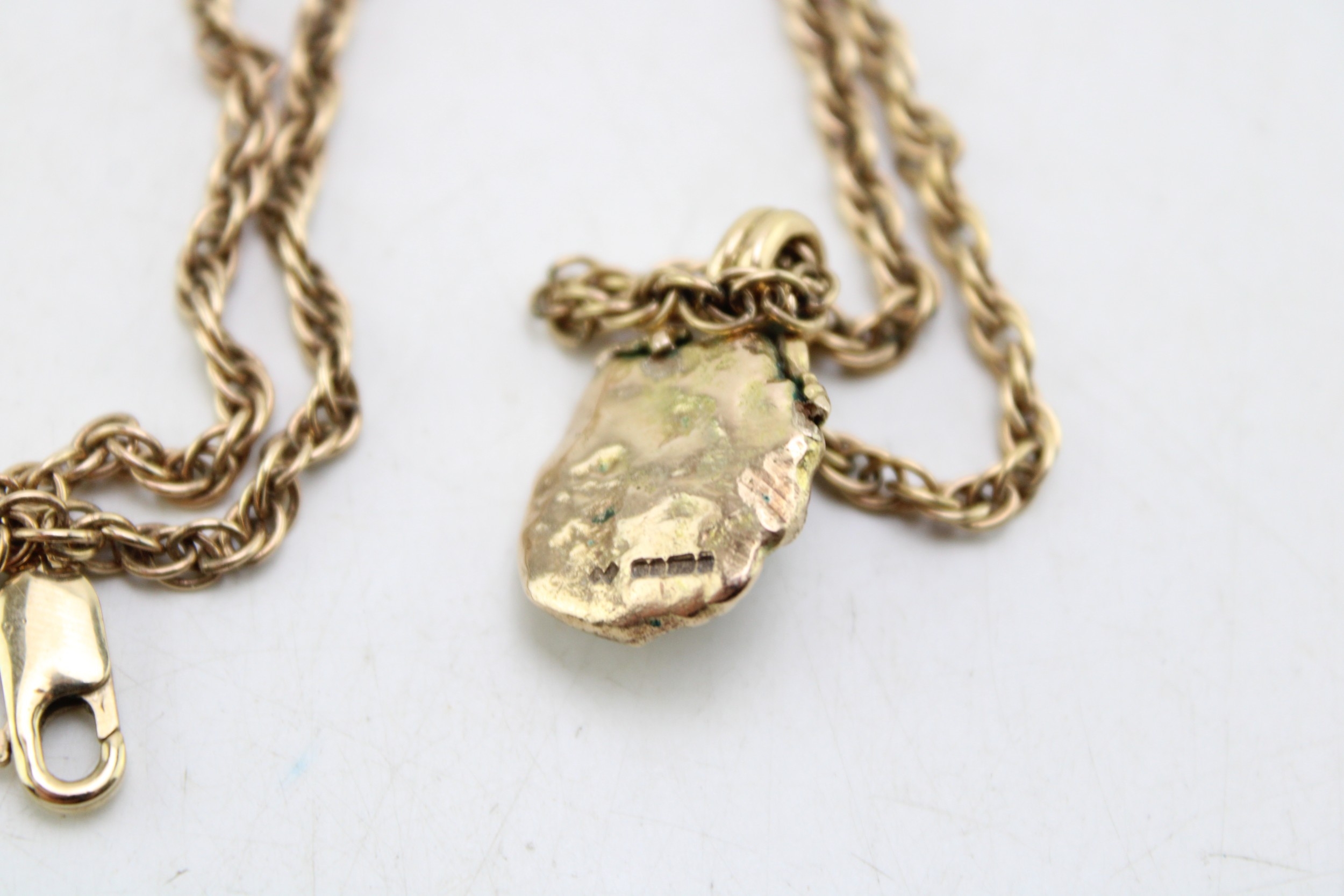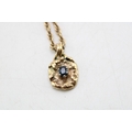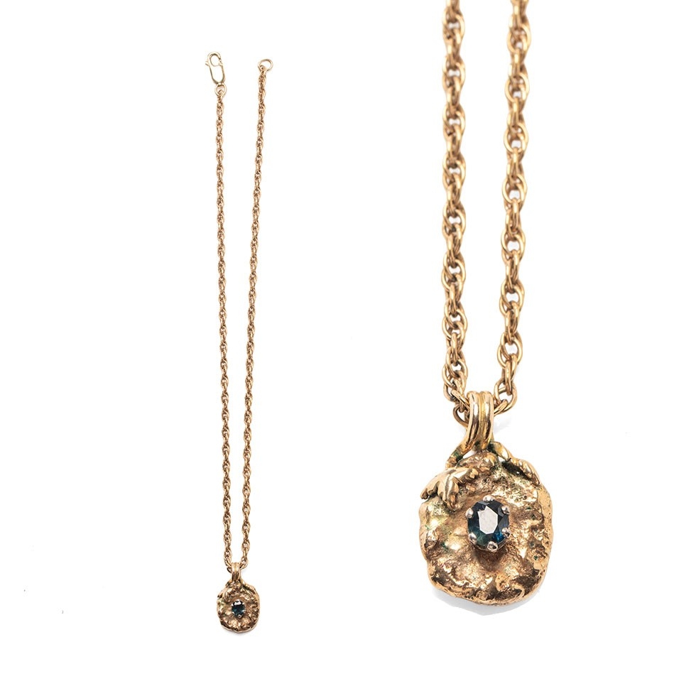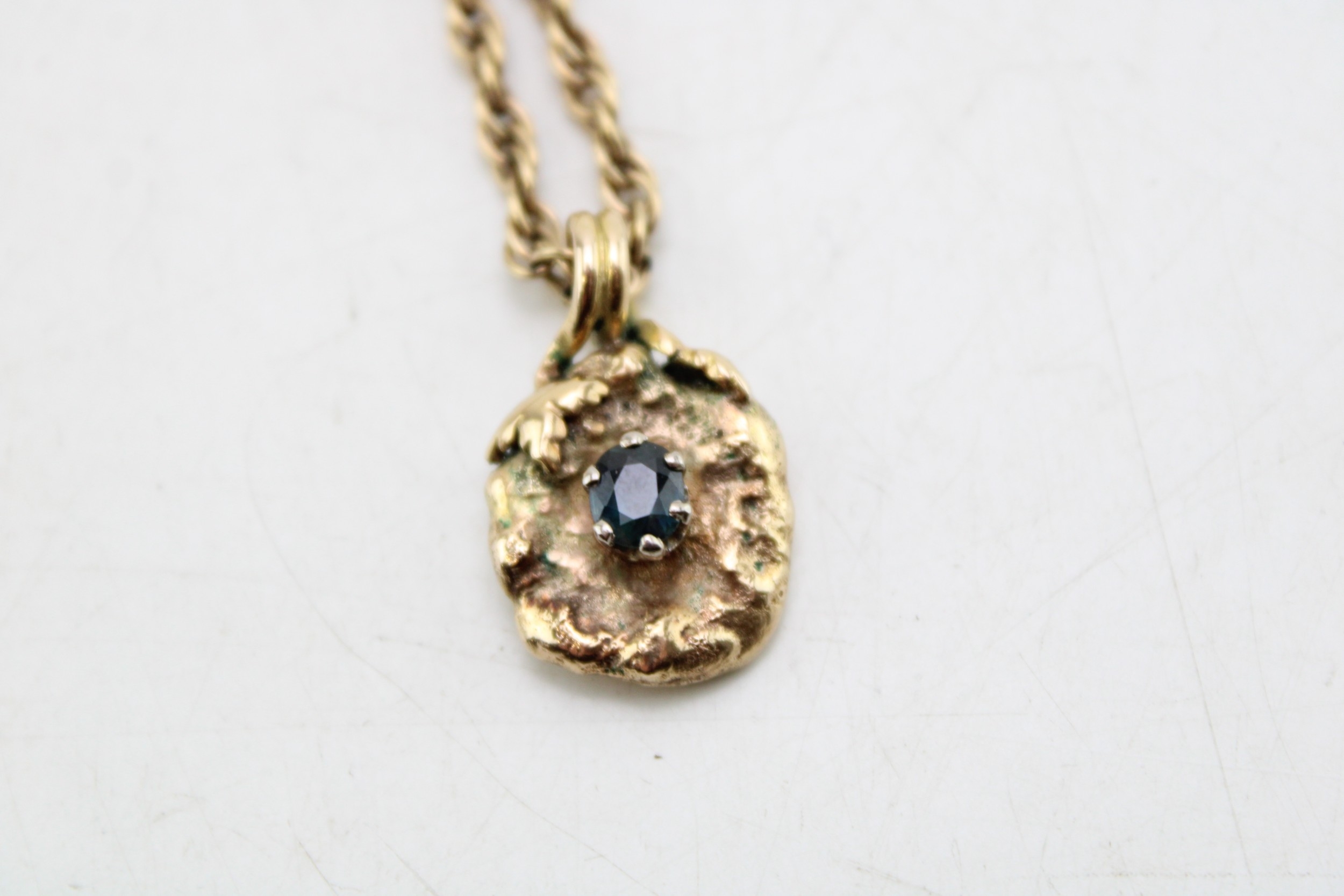 A 9ct gold and sapphire brutalist pendant of organic nugget flower form with pair of leaves to the top and scrolling bale, the central oval cut dark sapphire of approximately 6.0 by 4.6mm, on 9ct gold twist chain, chain length 38cm, combined weight 16.9g.