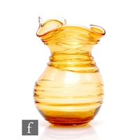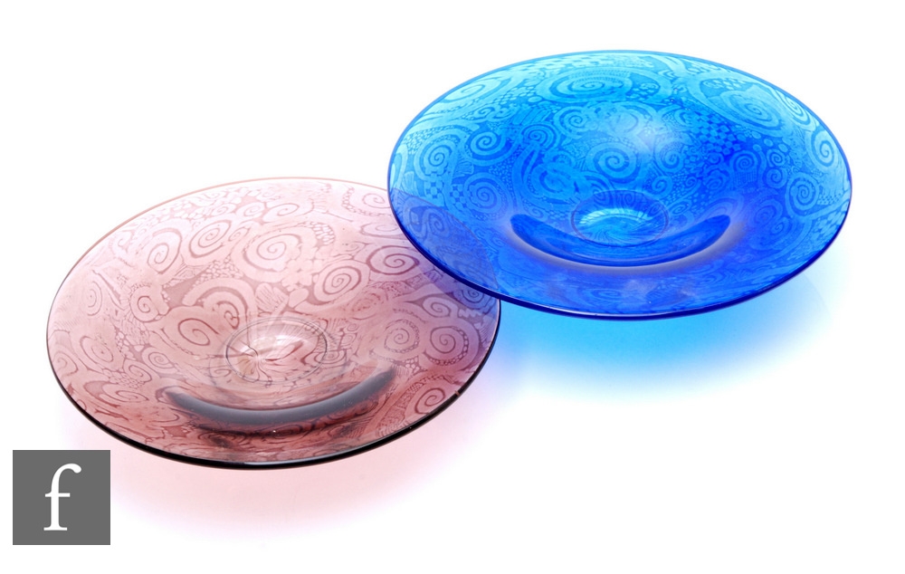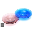Jonathon Harris - Ironbridge - A contemporary studio cased glass pedestal bowl, of shallow dished form, blue patterned tapestry style core, clear cases, engraved signature and marks, diameter, 27cm, together with an amethyst glass example, possible trial pieces. (2)