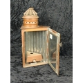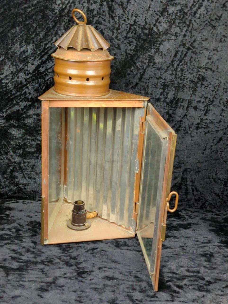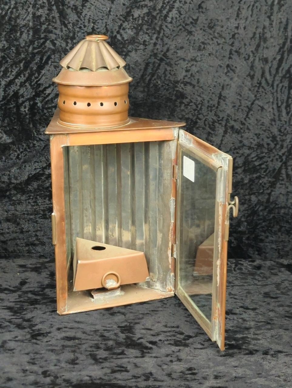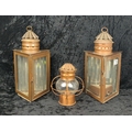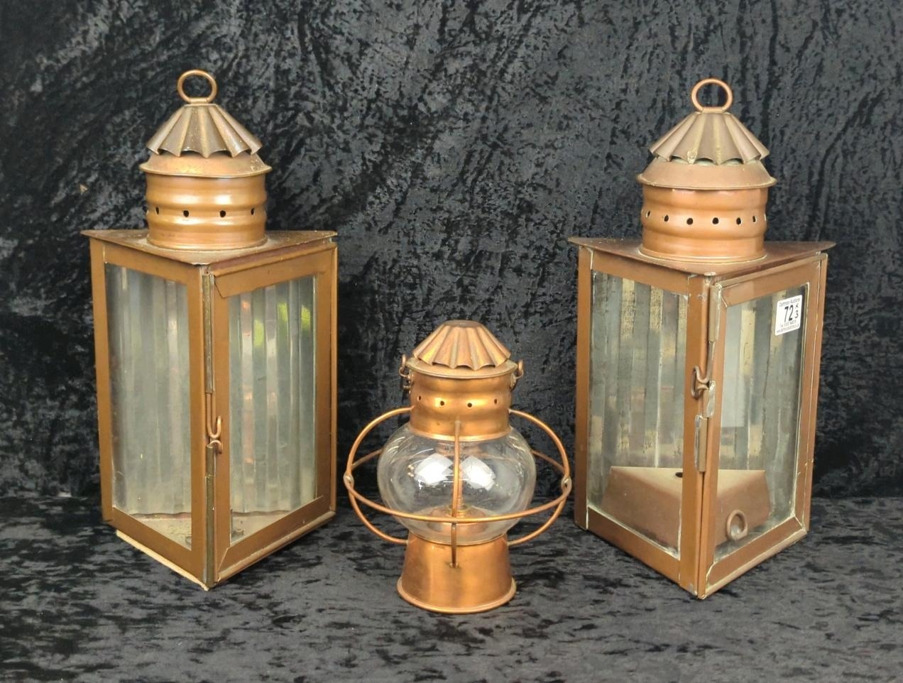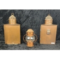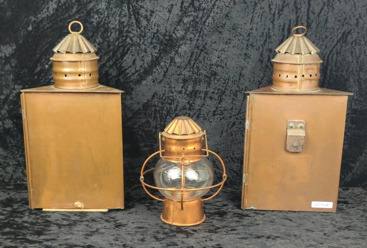 Two antique copper and glass triangular signal lanterns, one converted historically to electric, plus a vintage hanging copper oil lantern. Tallest approx H33cm.