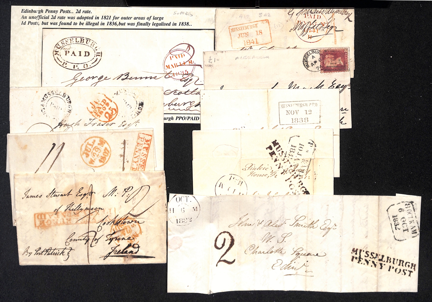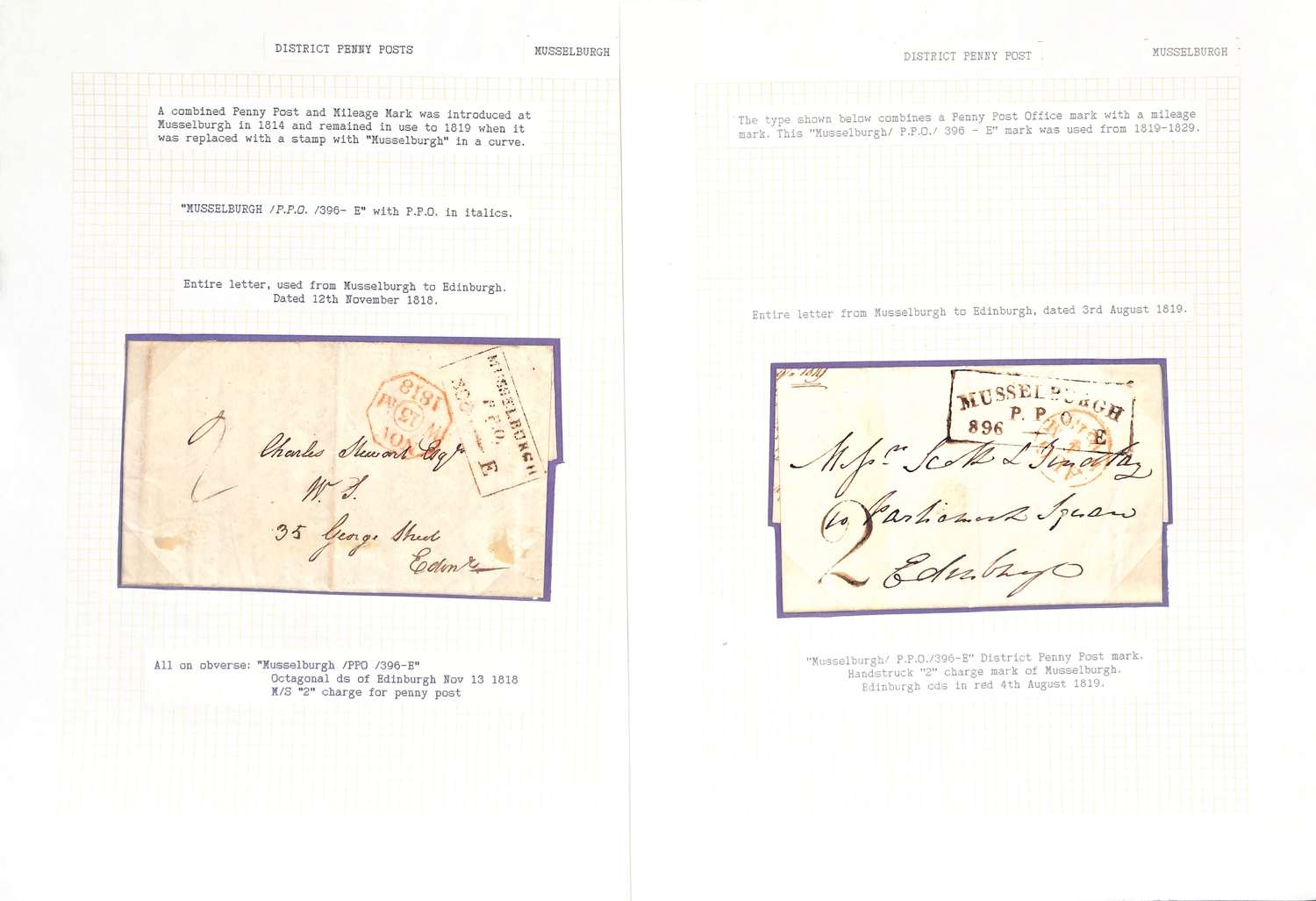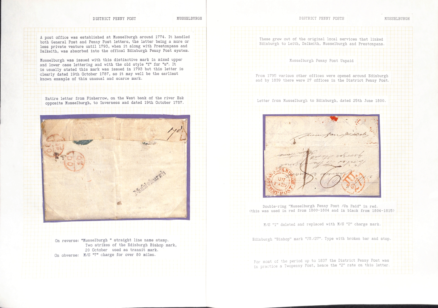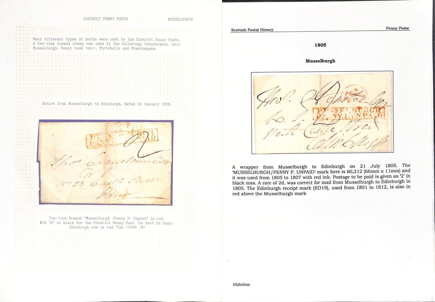Musselburgh. 1787-1890 Entire letters, covers and cards including fine 1787 "Mufsleburgh", various Penny Posts (15) with circular Paid and Unpaid, boxed Unpaid (3) and oval Paid (3) handstamps, boxed datestamp with P.P.O removed, etc. (25).