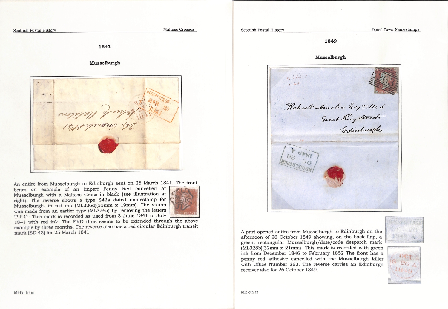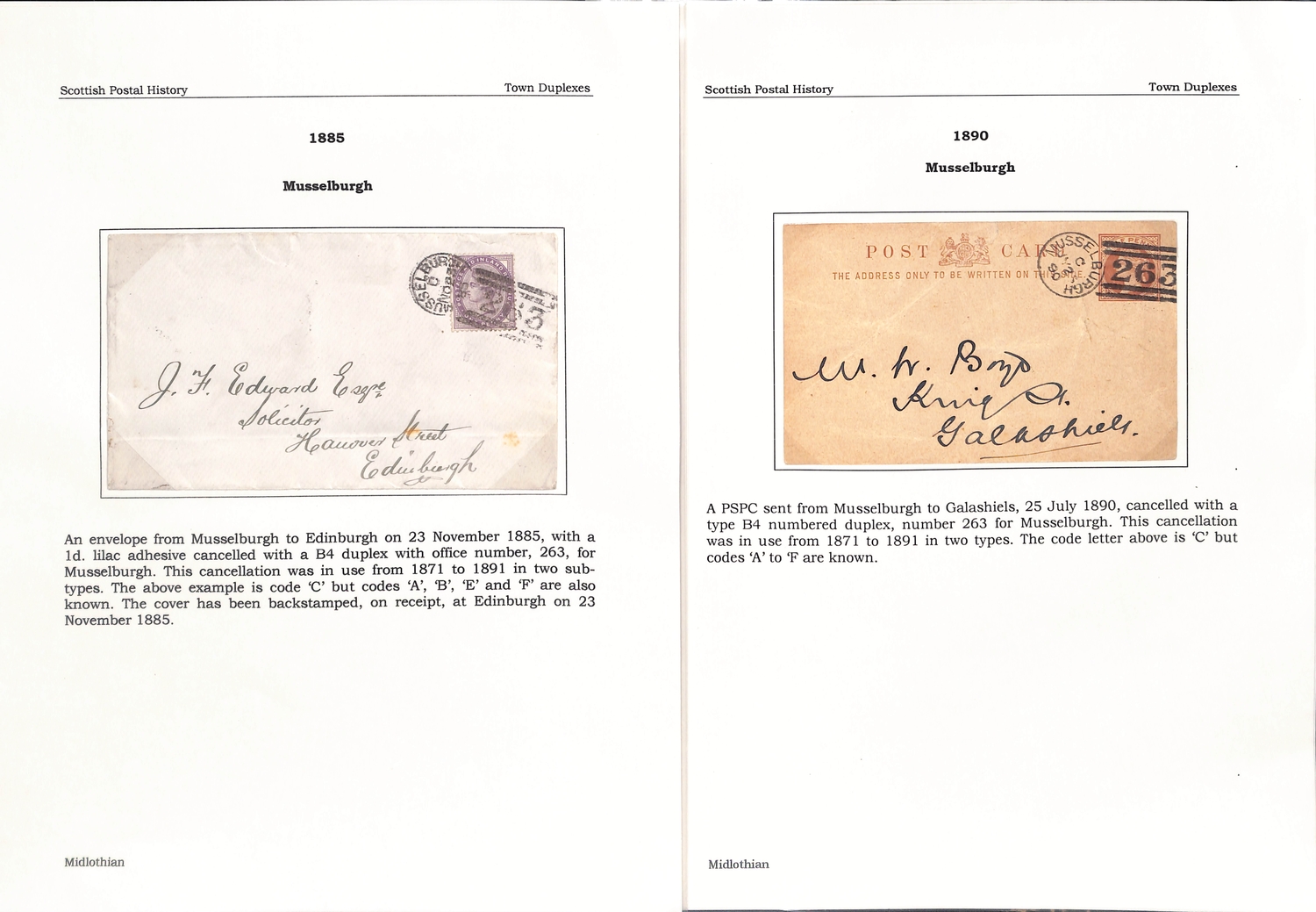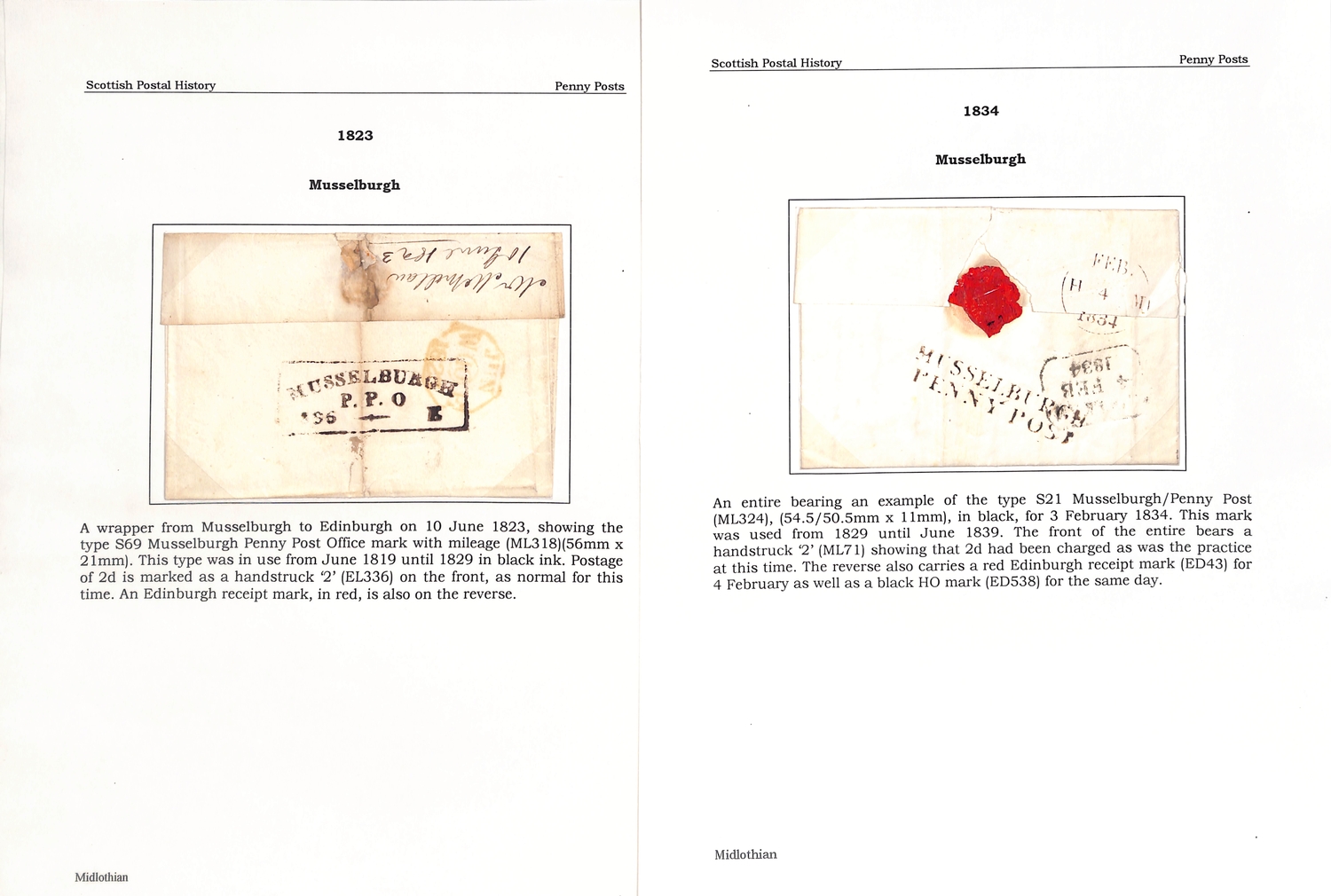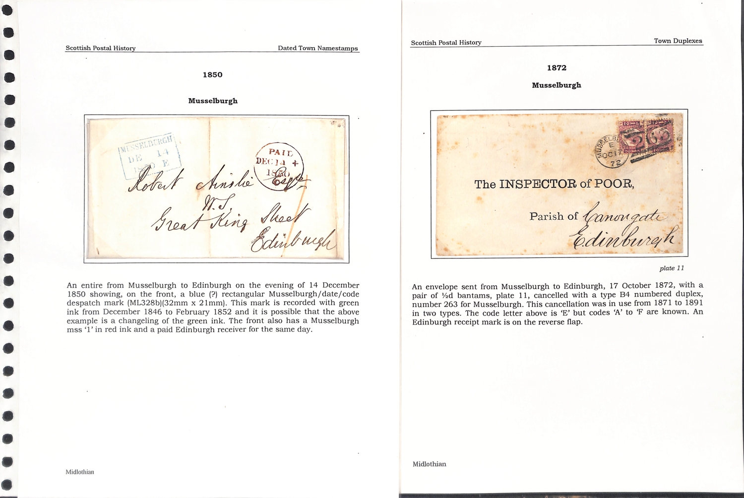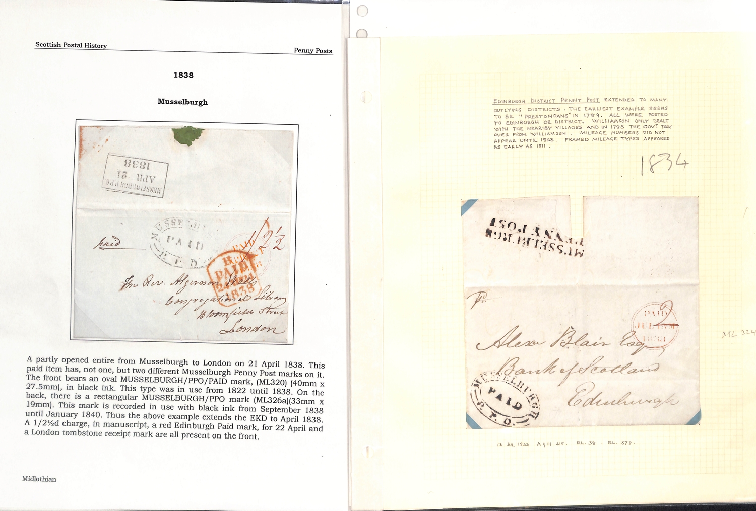 Musselburgh. 1787-1890 Entire letters, covers and cards including fine 1787 "Mufsleburgh", various Penny Posts (15) with circular Paid and Unpaid, boxed Unpaid (3) and oval Paid (3) handstamps, boxed datestamp with P.P.O removed, etc. (25).