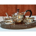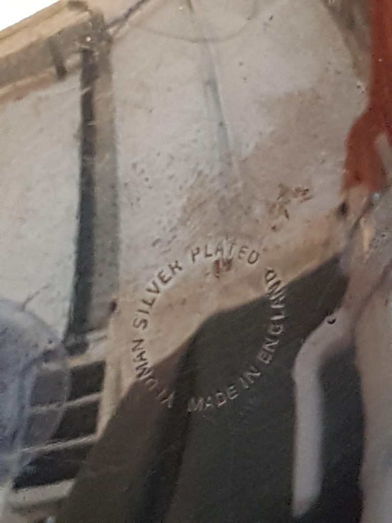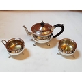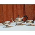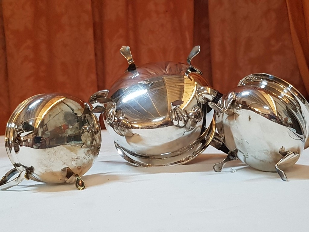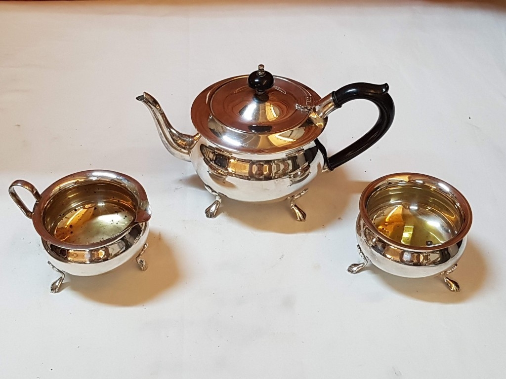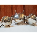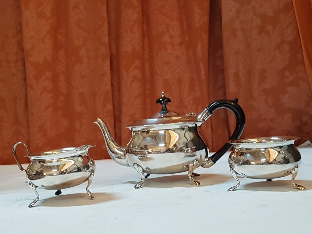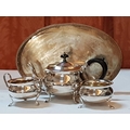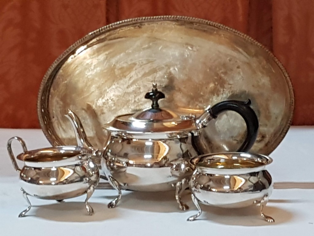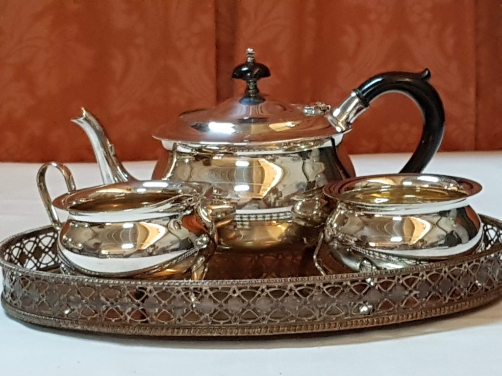 Early 20th century Yeoman silver plated – Made in England. Teapot with bakelite handle & knob, sugar bowl and milk jug on silver plated galleried tray. (Yeoman was established 1897 and had supplied Harrods, Asprey, Garrard & Royal Palaces ) 4 pcs – teapot – 23cm x 13 x 14, sugar bowl & jug – 9cm. tray – 29cm x 20