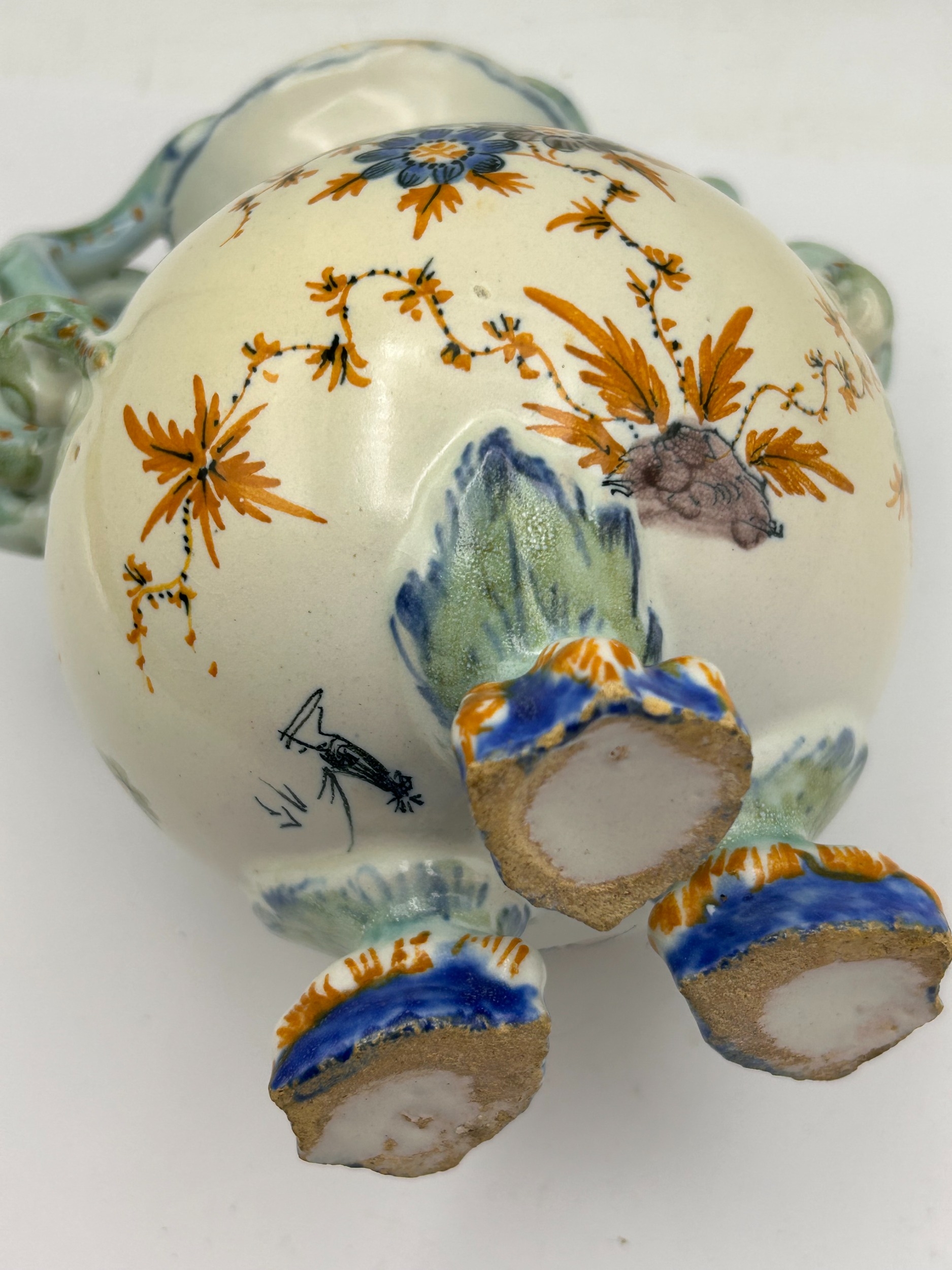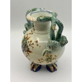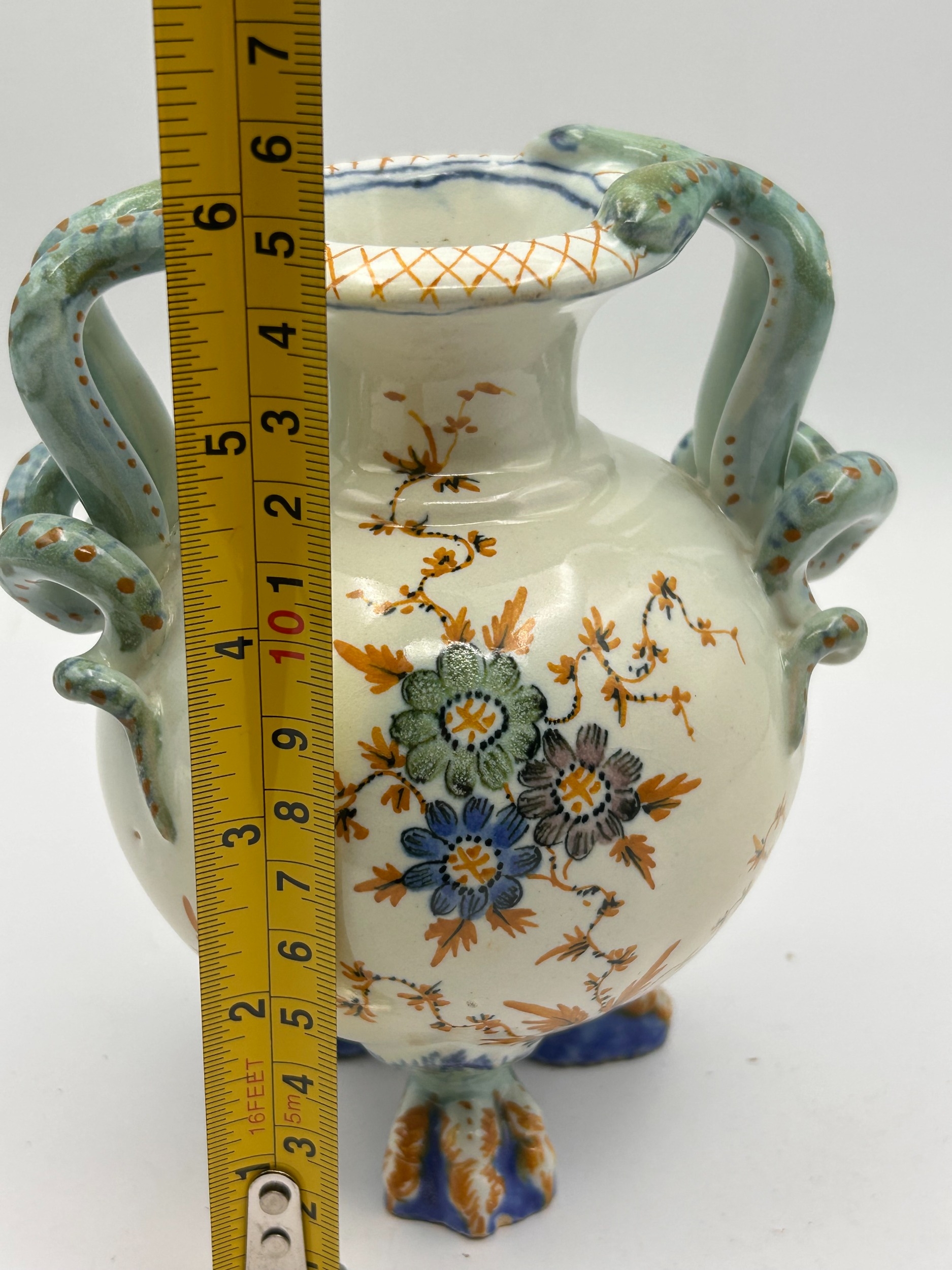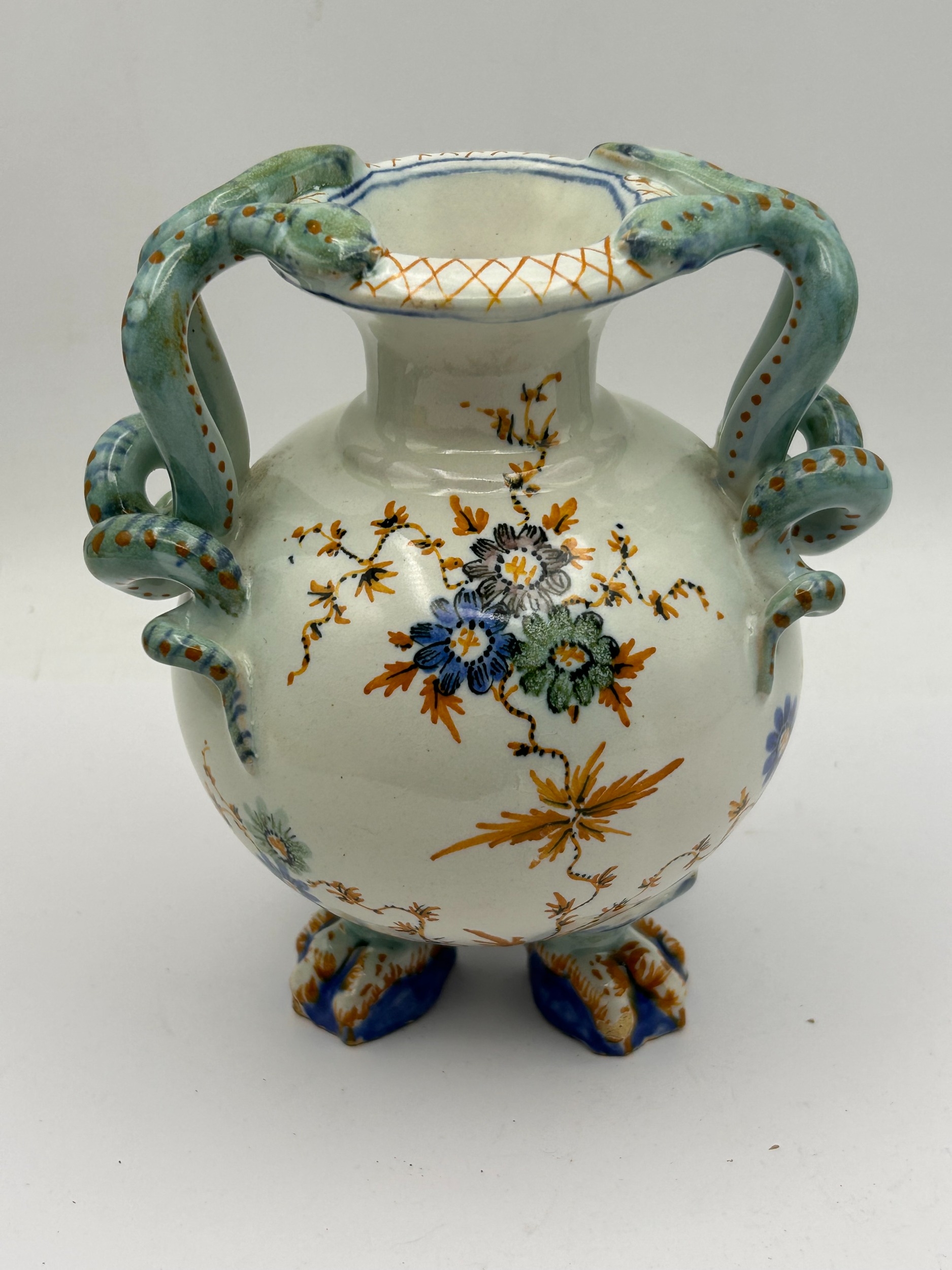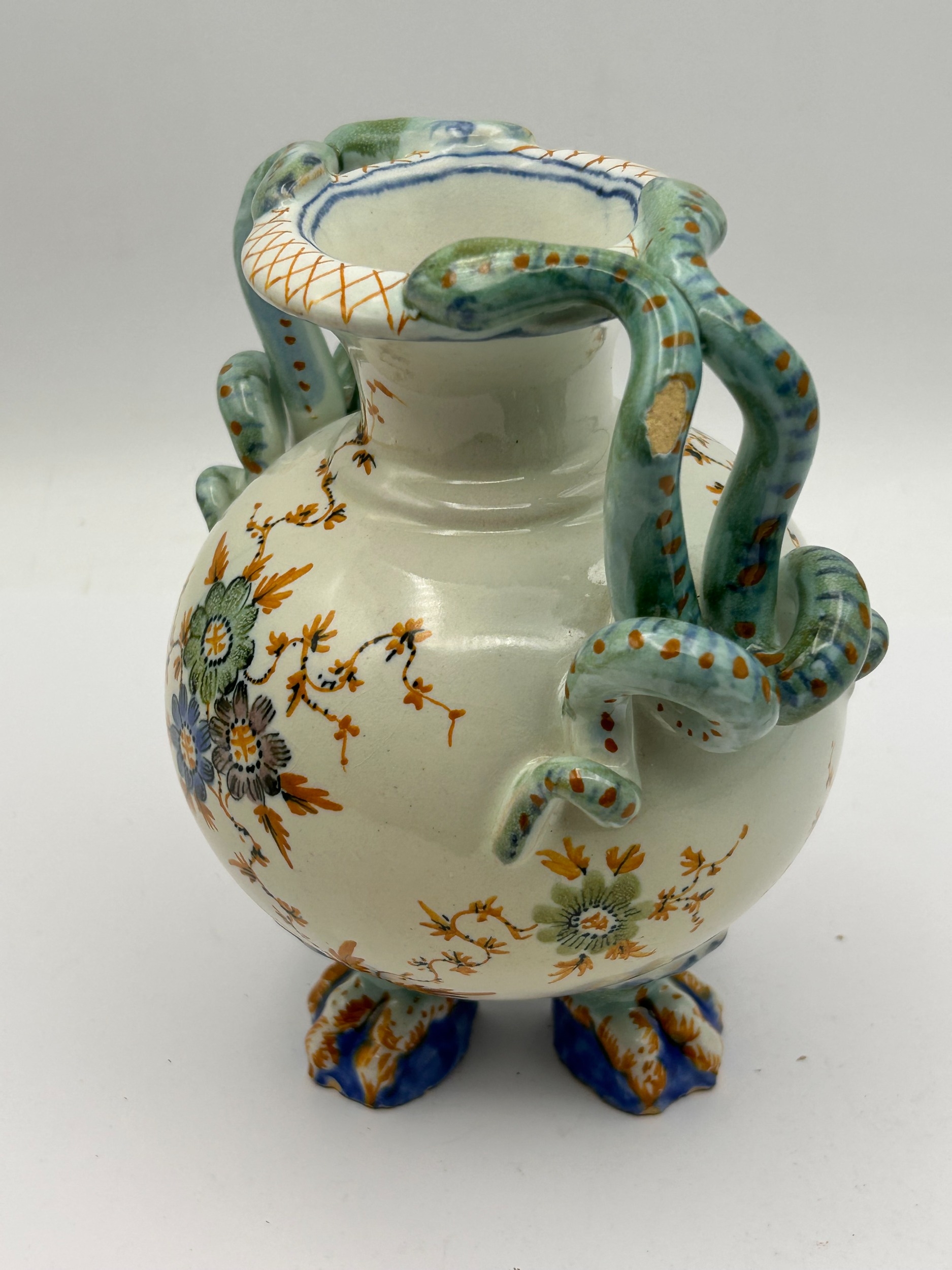 A single polychrome glazed earthenware vase featuring a globular body and a narrow neck. The vessel stands on three molded zoomorphic claw feet decorated in blue and orange glazes. The vase is characterized by twin molded handles shaped as scaled serpents or lizards, rendered primarily in turquoise-green with orange spotting, which wrap around the shoulders and terminate by biting the rim. The main body is decorated with hand-painted floral sprays and trailing vines utilizing blue, orange, green, and purple enamel colors set against a white ground. The underside of the vessel bears a small, indistinct hand-painted black mark located near one of the feet.