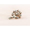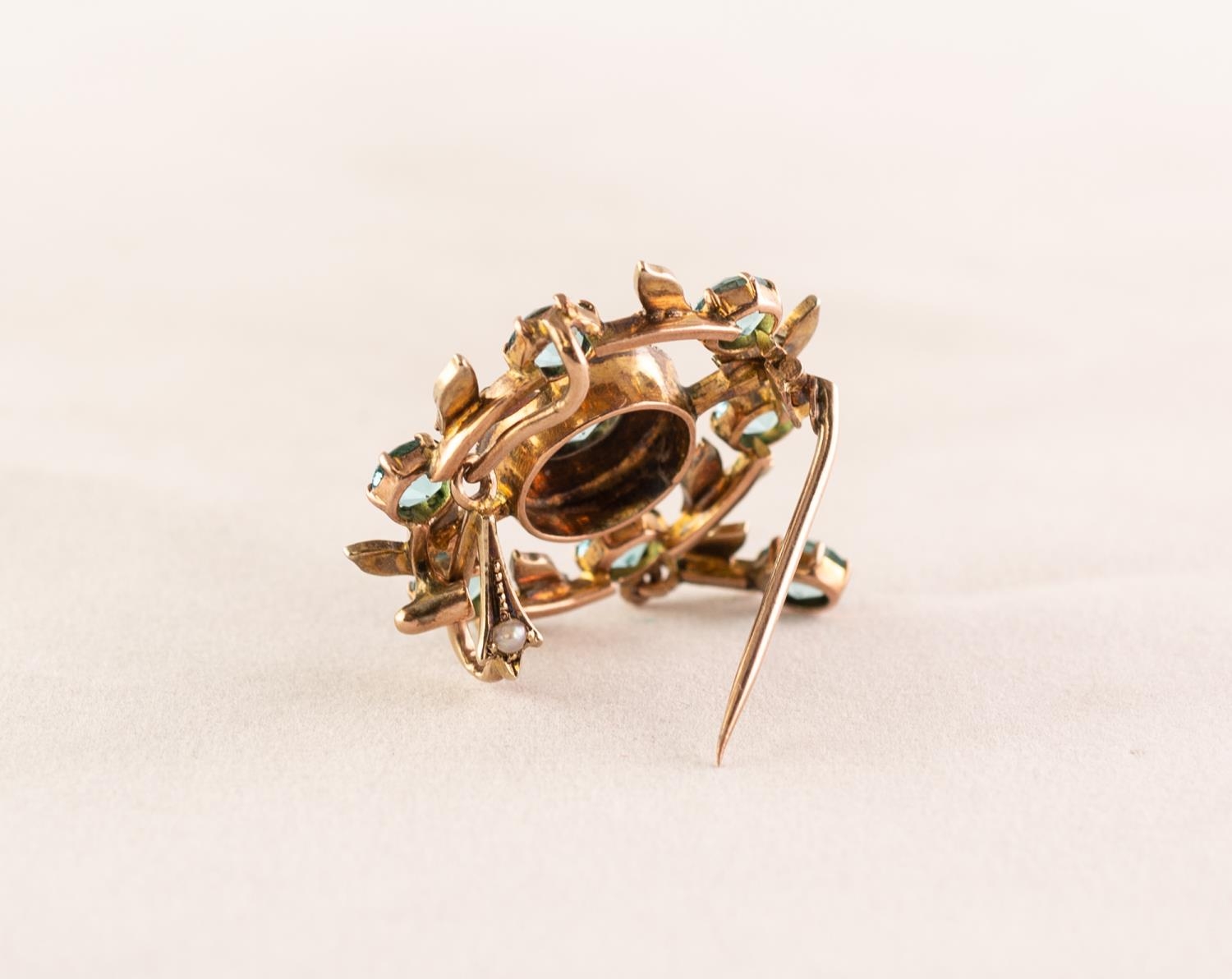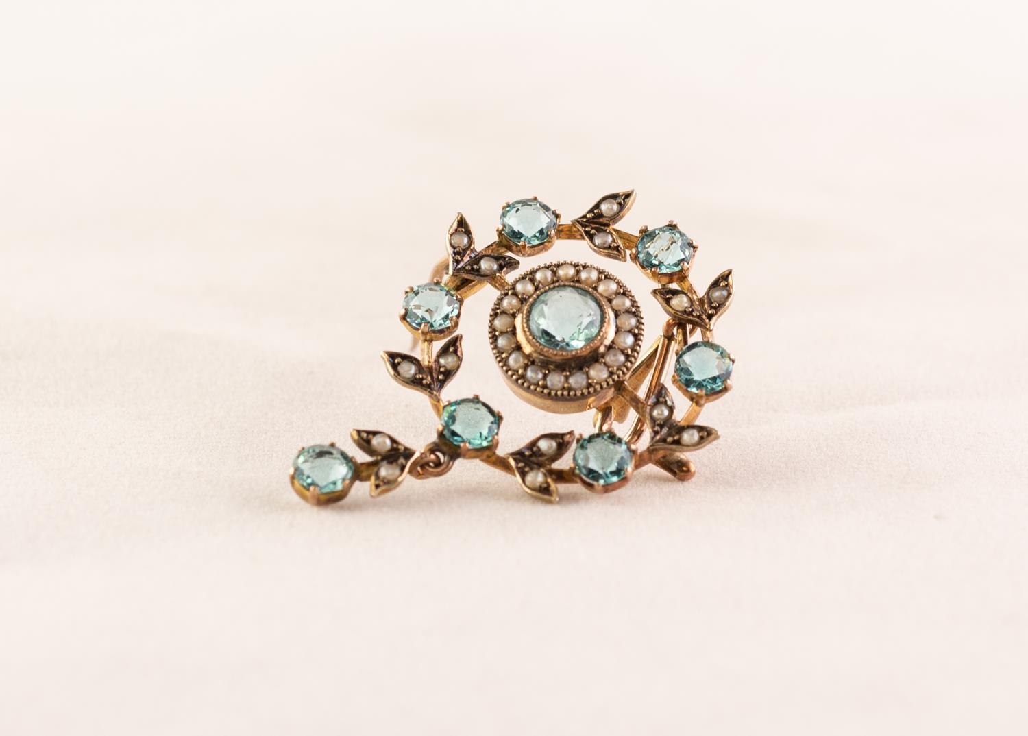 9ct GOLD EDWARDIAN STYLE CIRCULAR OPENWORK BROOCH/PENDANT set with possibly aquamarine and seed pearls, 5.8 gms gross