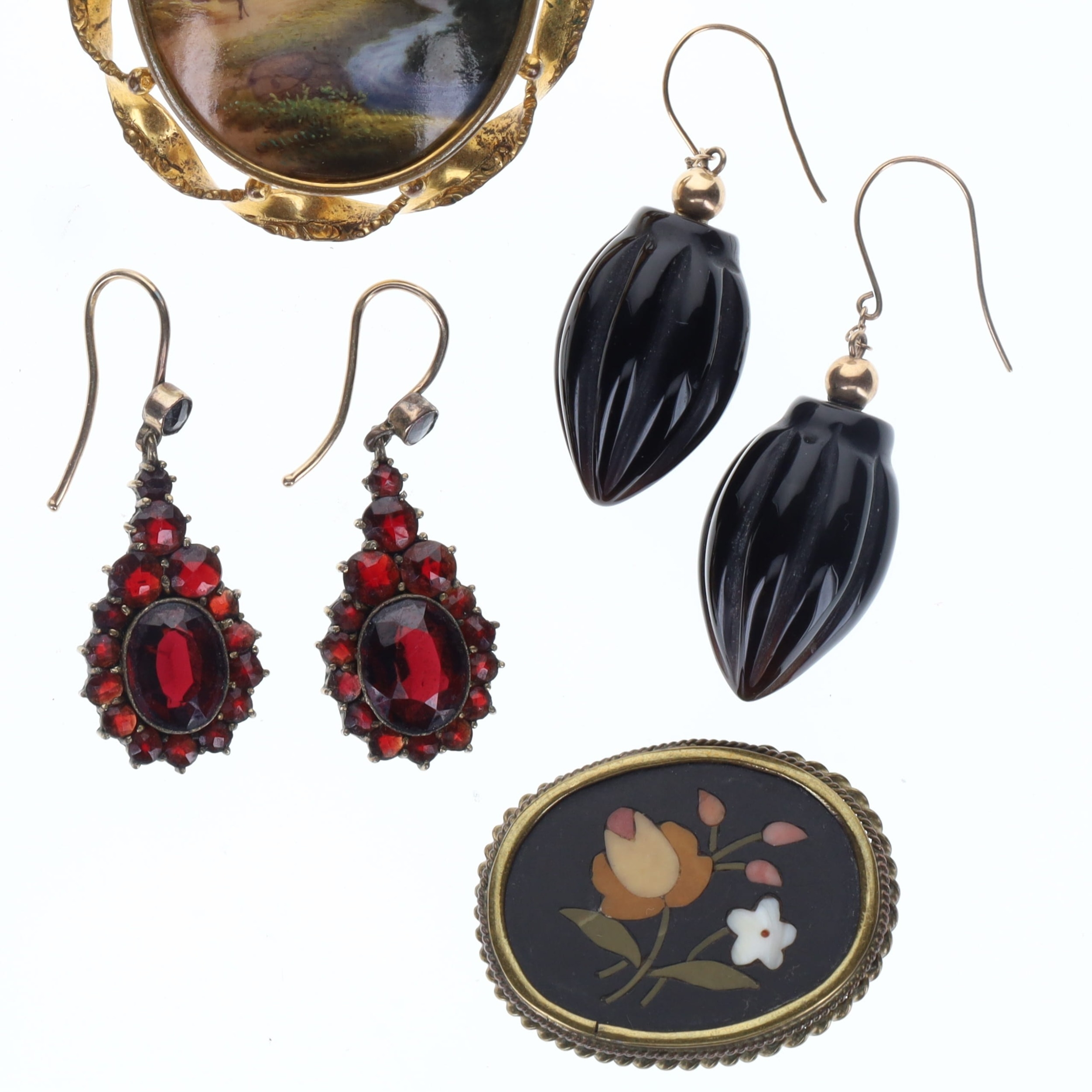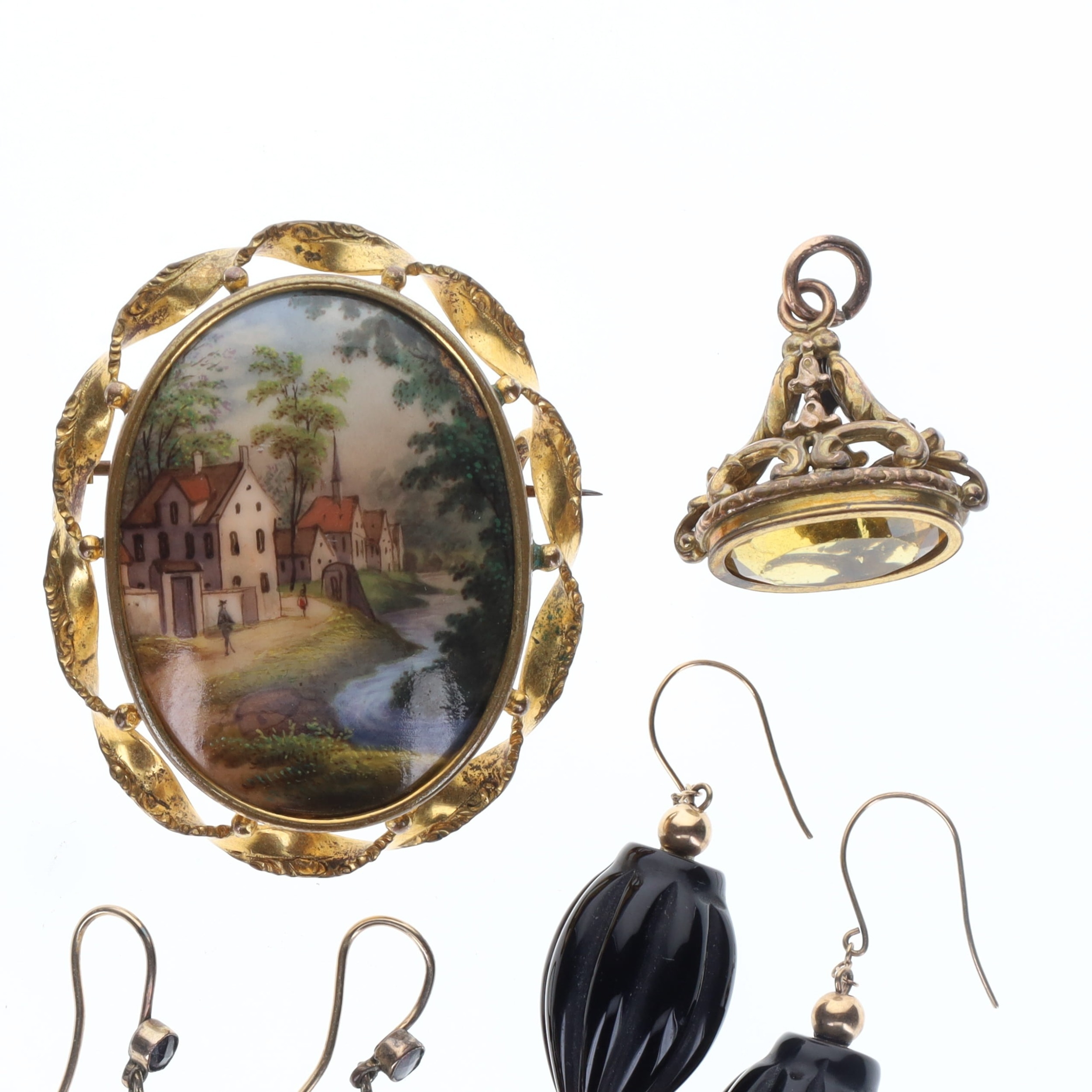 Antique Jewellery Collection inc. Mourning, Pietra Dura, Gold. The earring posts have tested as gold. There are areas of plate wear, with some possible chips to edge of the cross. The locket hinge is loose but attached. All stones are intact and clasps are in working order. Weighs in total 71.8.