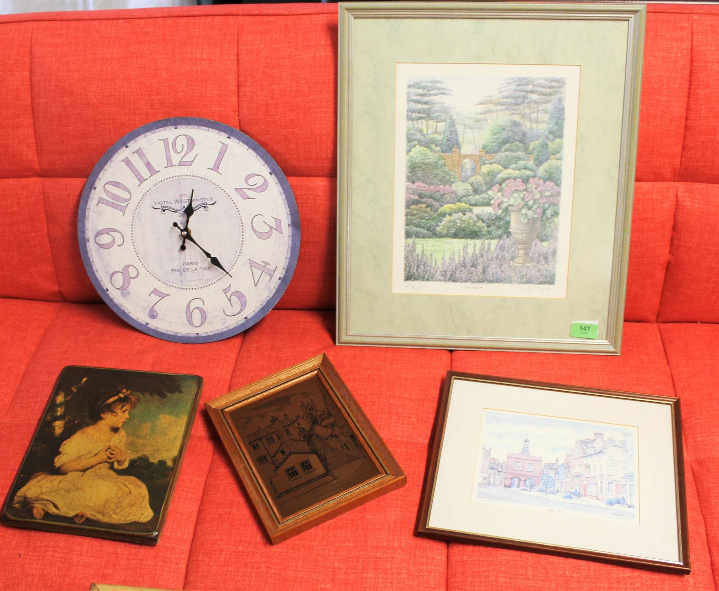 Framed and Mounted Limited Edition (45/200) Clear Pencil Etching by Arthur Byrne Plus Three Others, Plus a Wall Clock