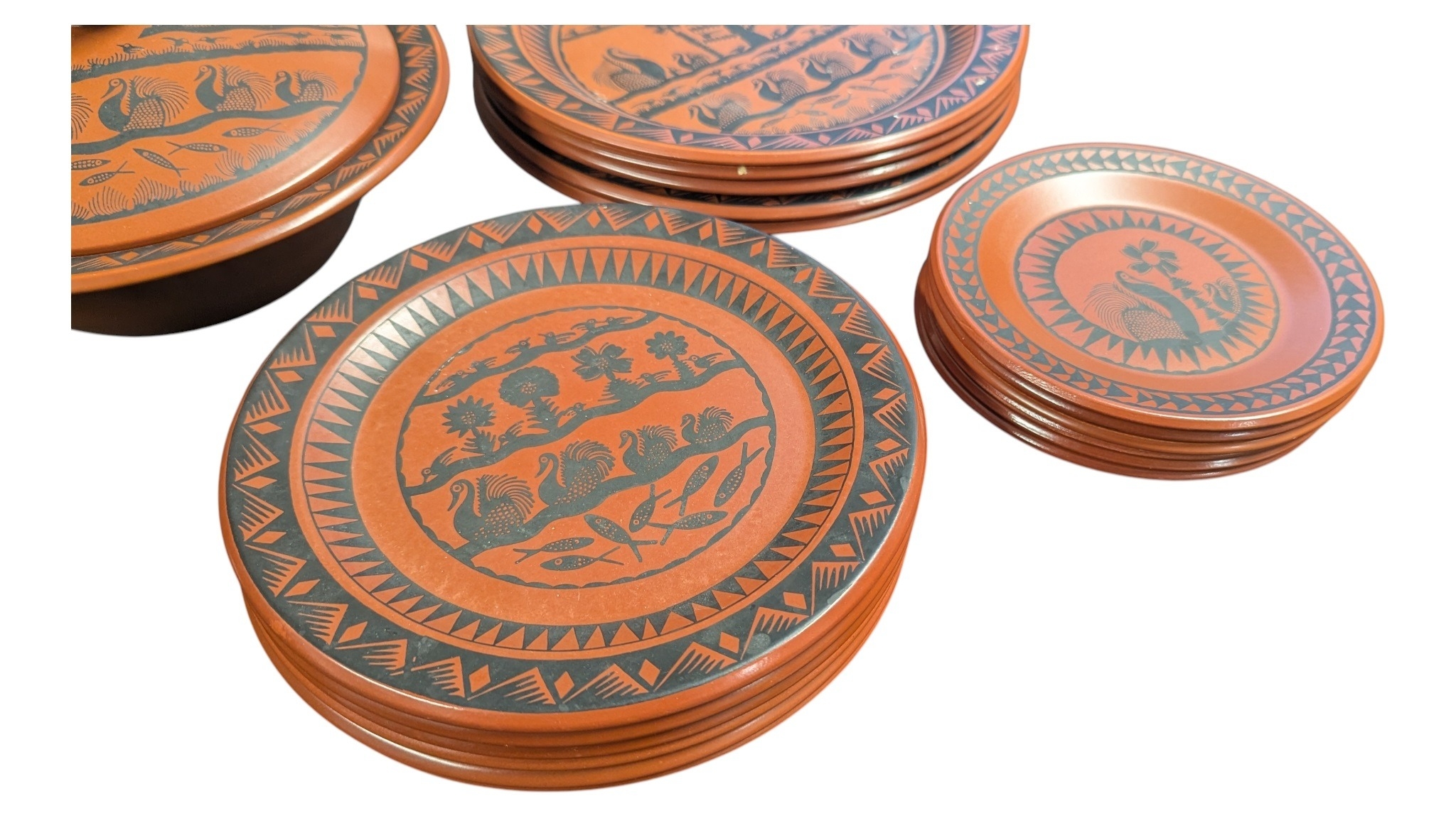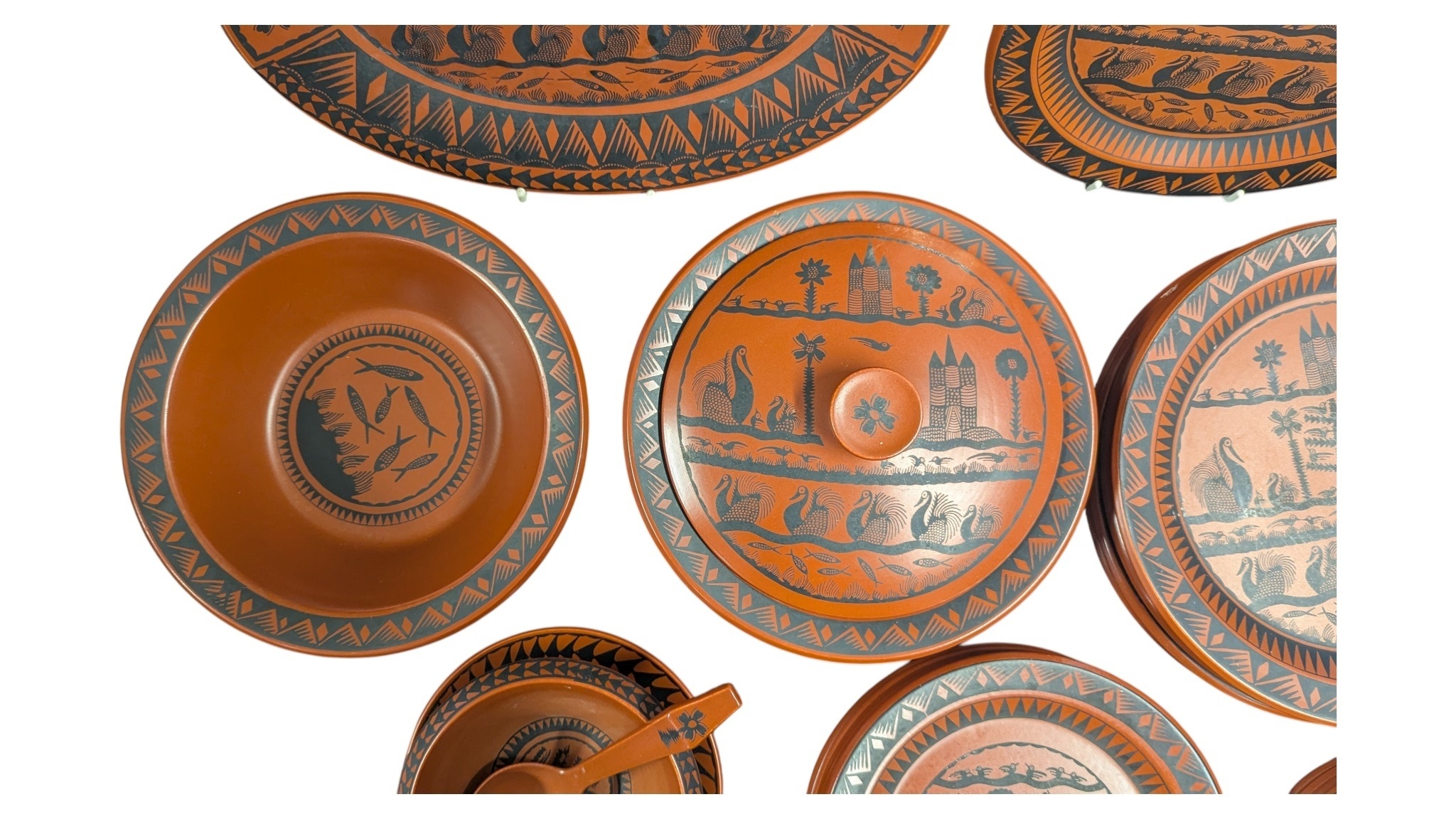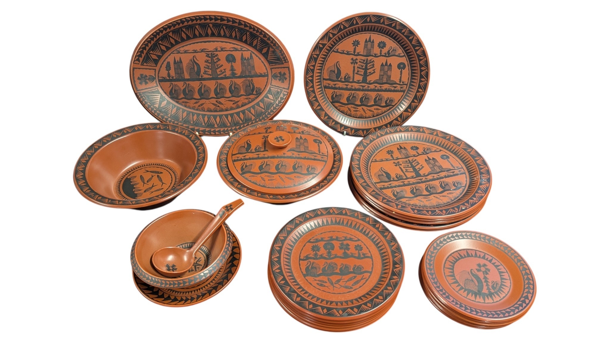 Scottie Wilson for Royal Worcester - 1960s ceramic dinner service in the Birds and Fishes pattern. Featuring black print on a terracotta coloured ground. Comprising of dinner plates, small plates, side plates, serving plate, serving bowls (one lidded), and a bowl with a spoons and saucer. All marked to the bases.