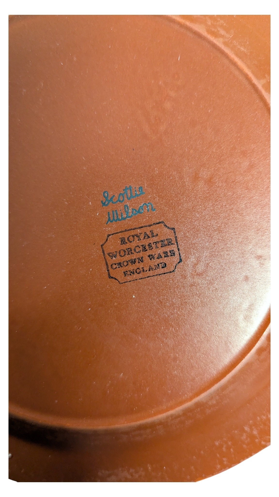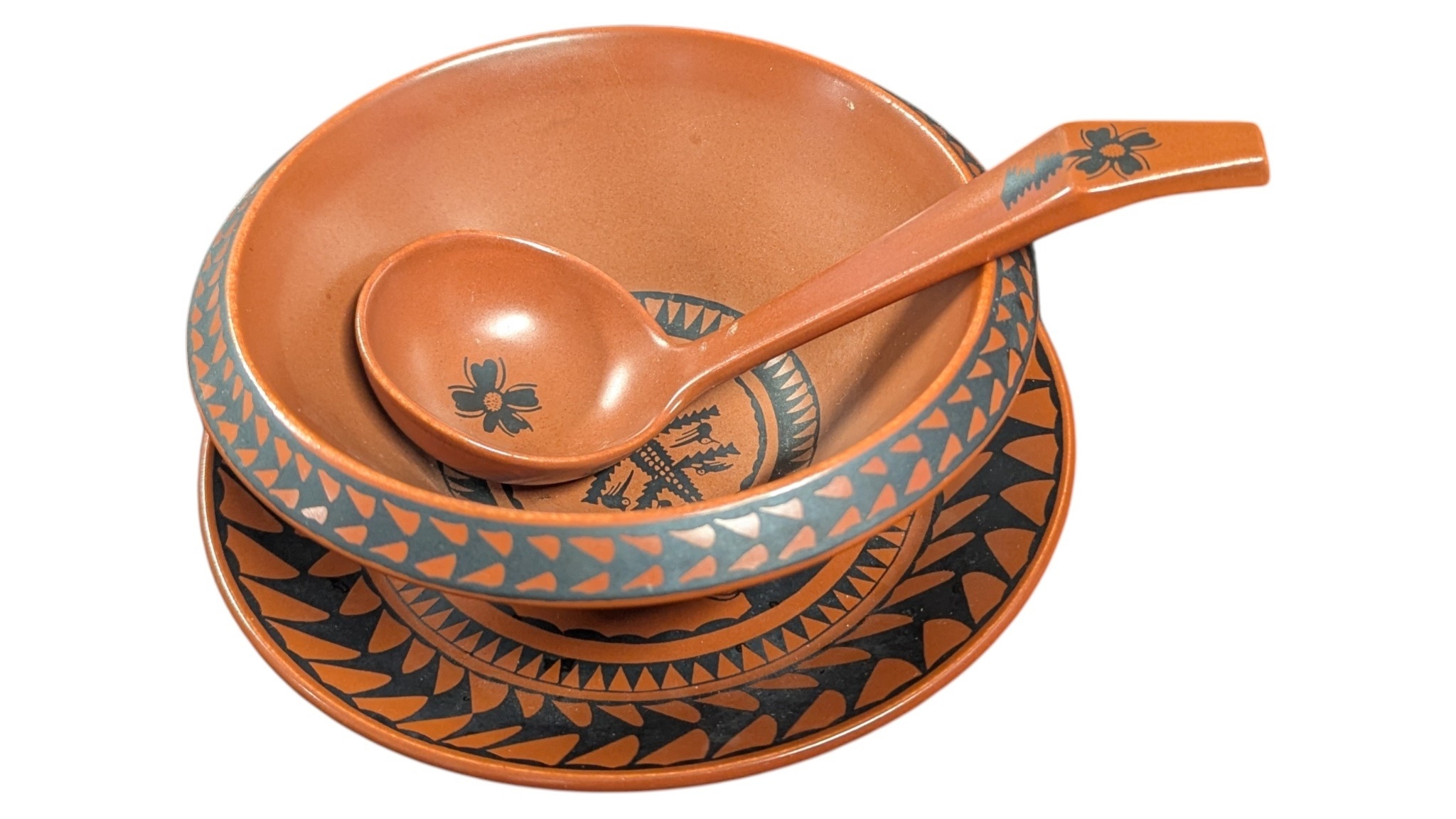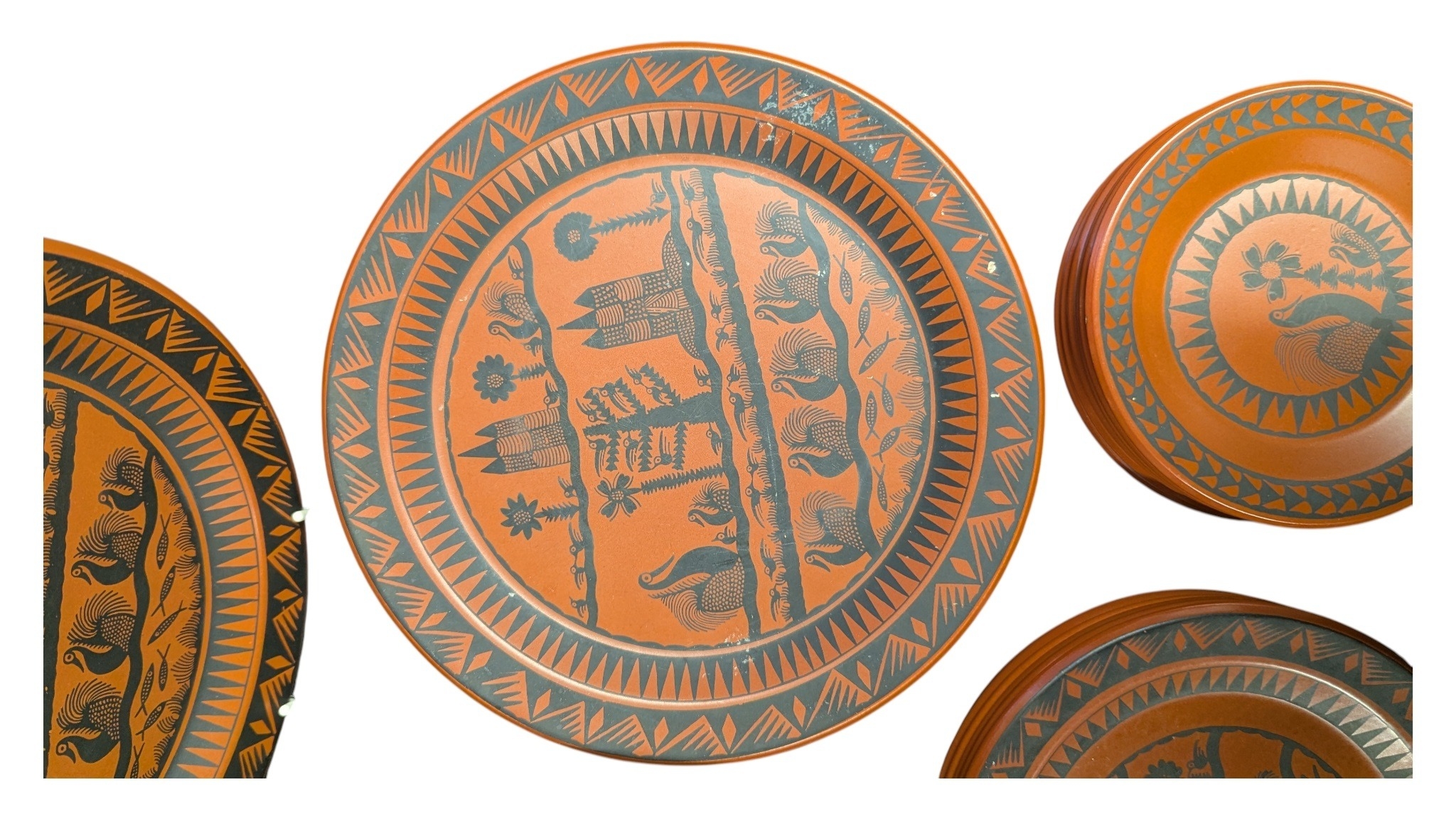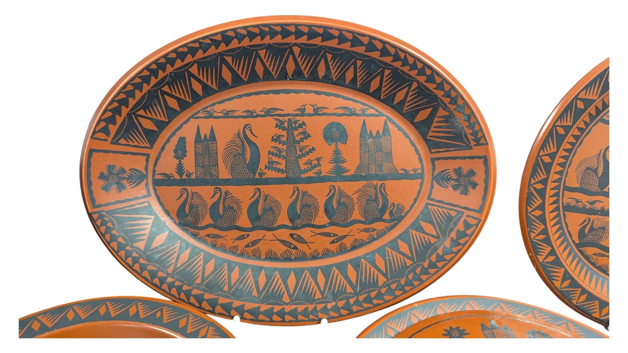 Scottie Wilson for Royal Worcester - 1960s ceramic dinner service in the Birds and Fishes pattern. Featuring black print on a terracotta coloured ground. Comprising of dinner plates, small plates, side plates, serving plate, serving bowls (one lidded), and a bowl with a spoons and saucer. All marked to the bases.