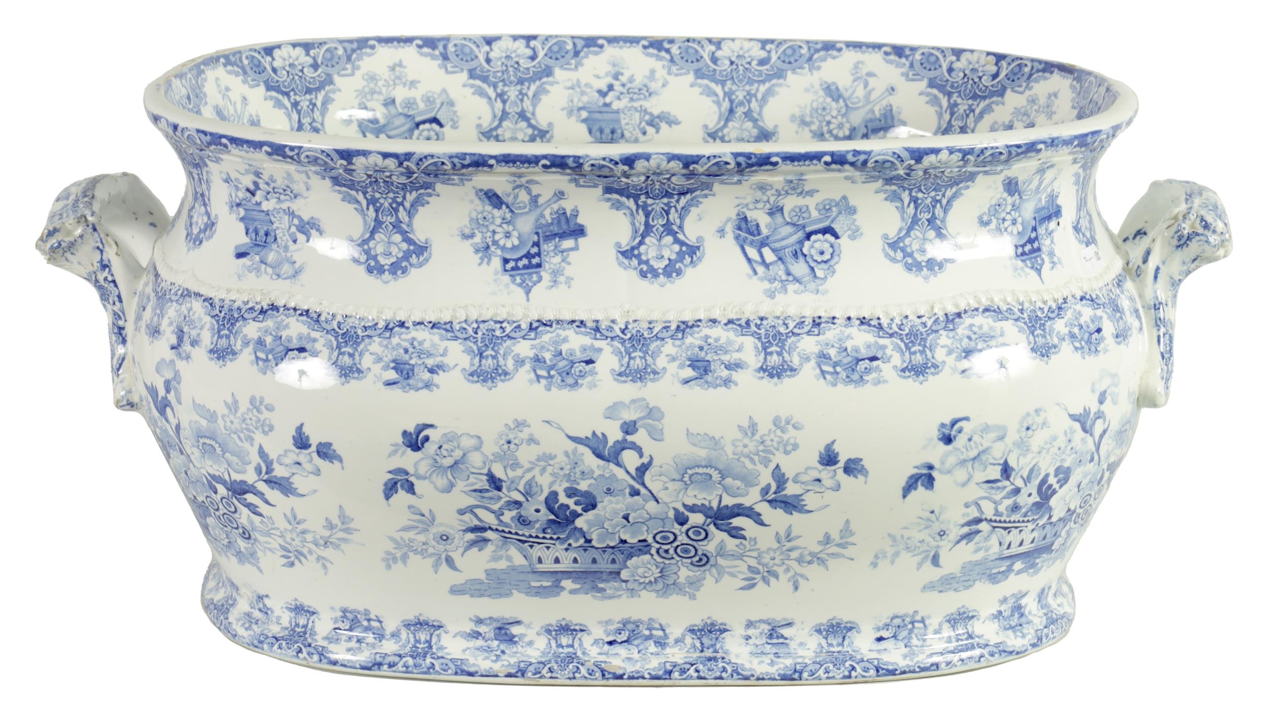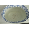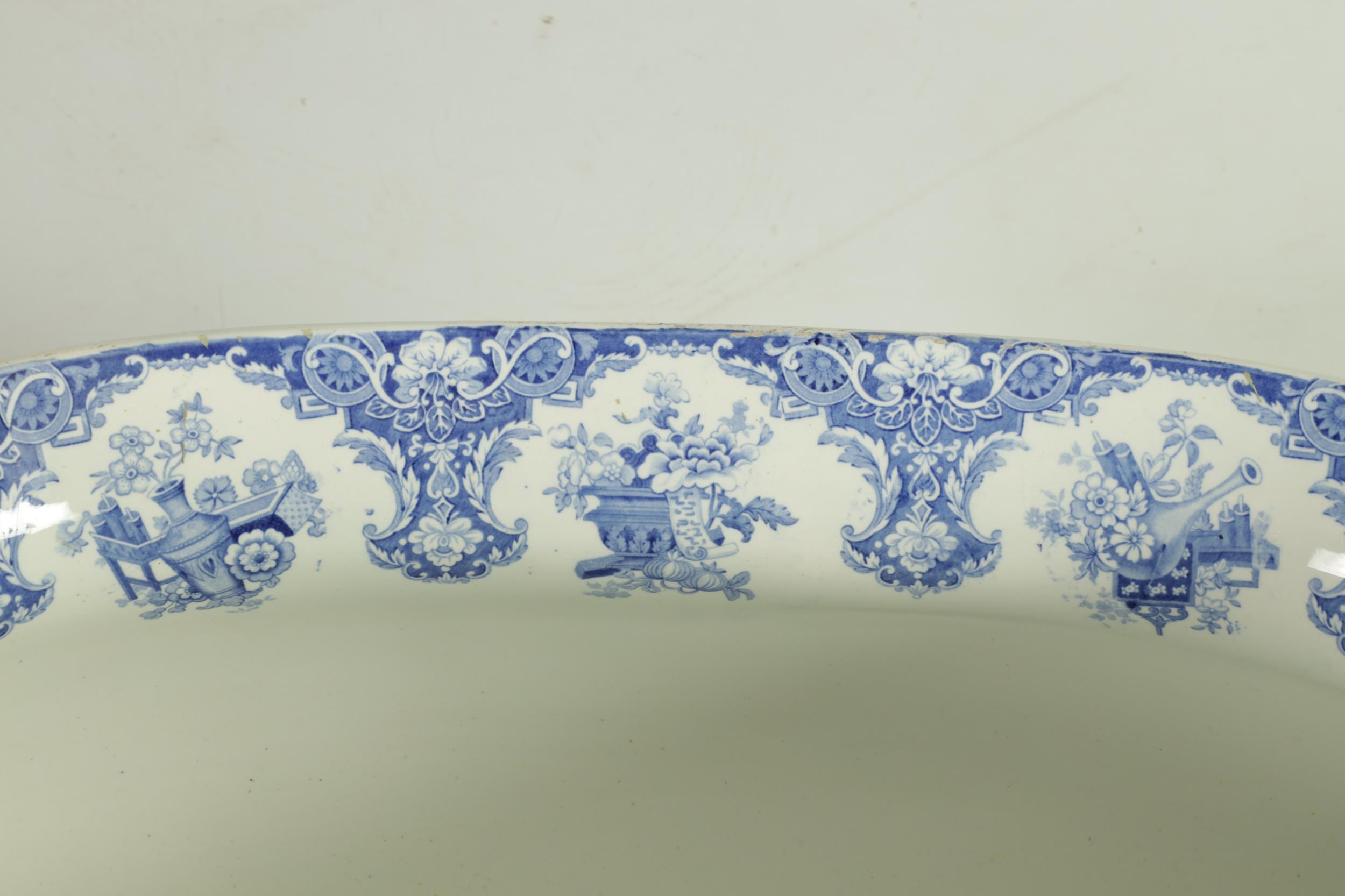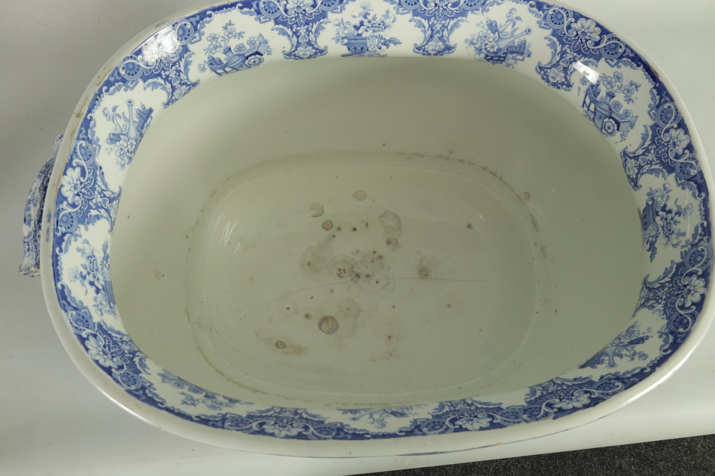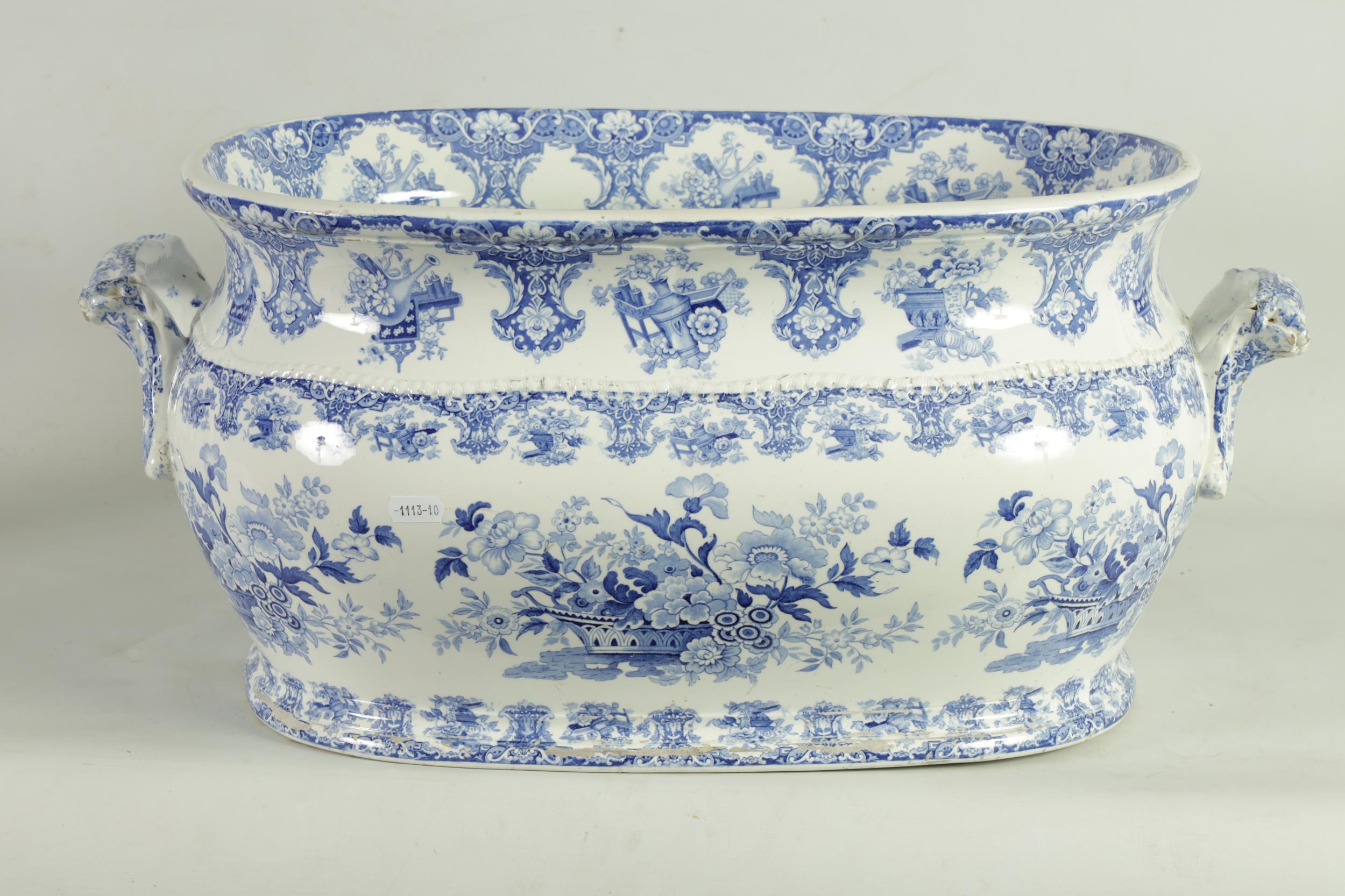 A LARGE EARLY 19TH CENTURY BLUE AND WHITE GLAZED POTTERY FOOT BATH with floral decoration, underside marked 'Canton Groups' (58cm wide)