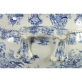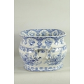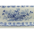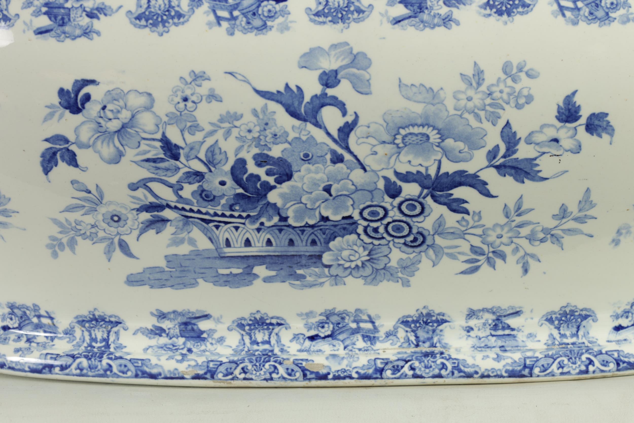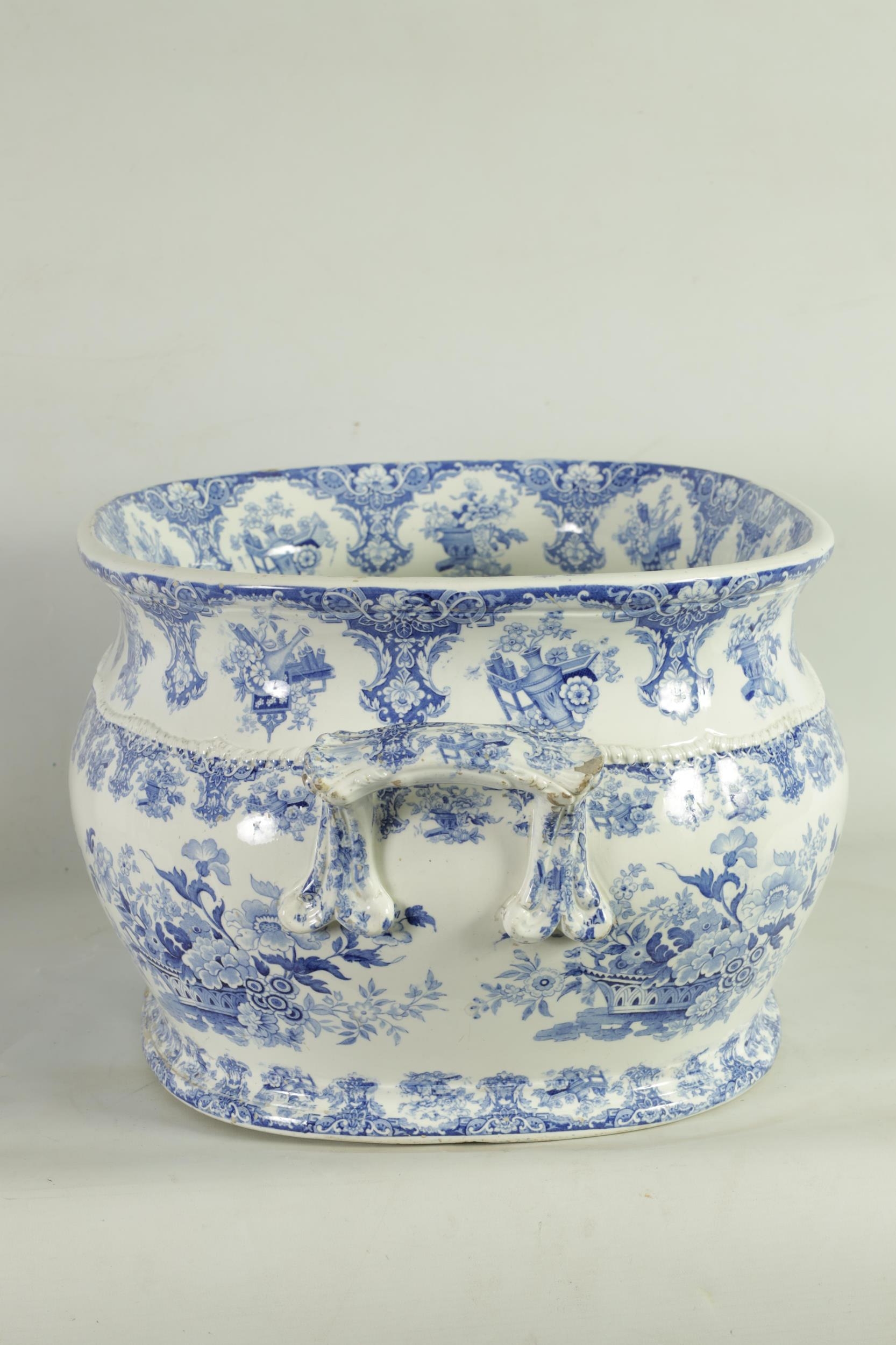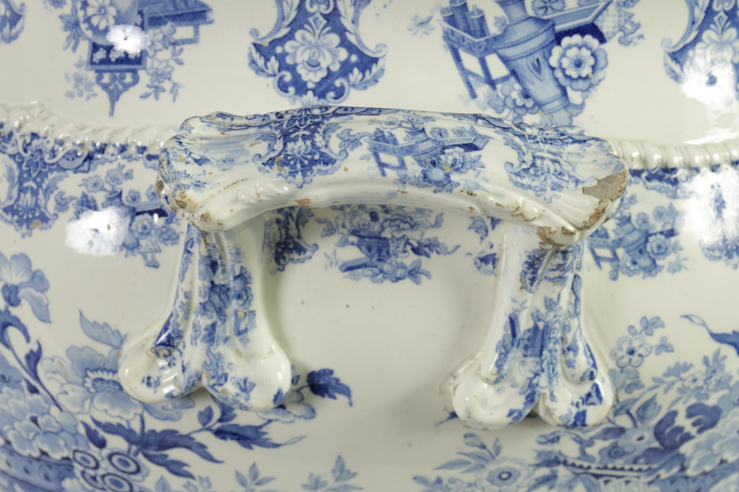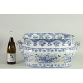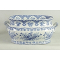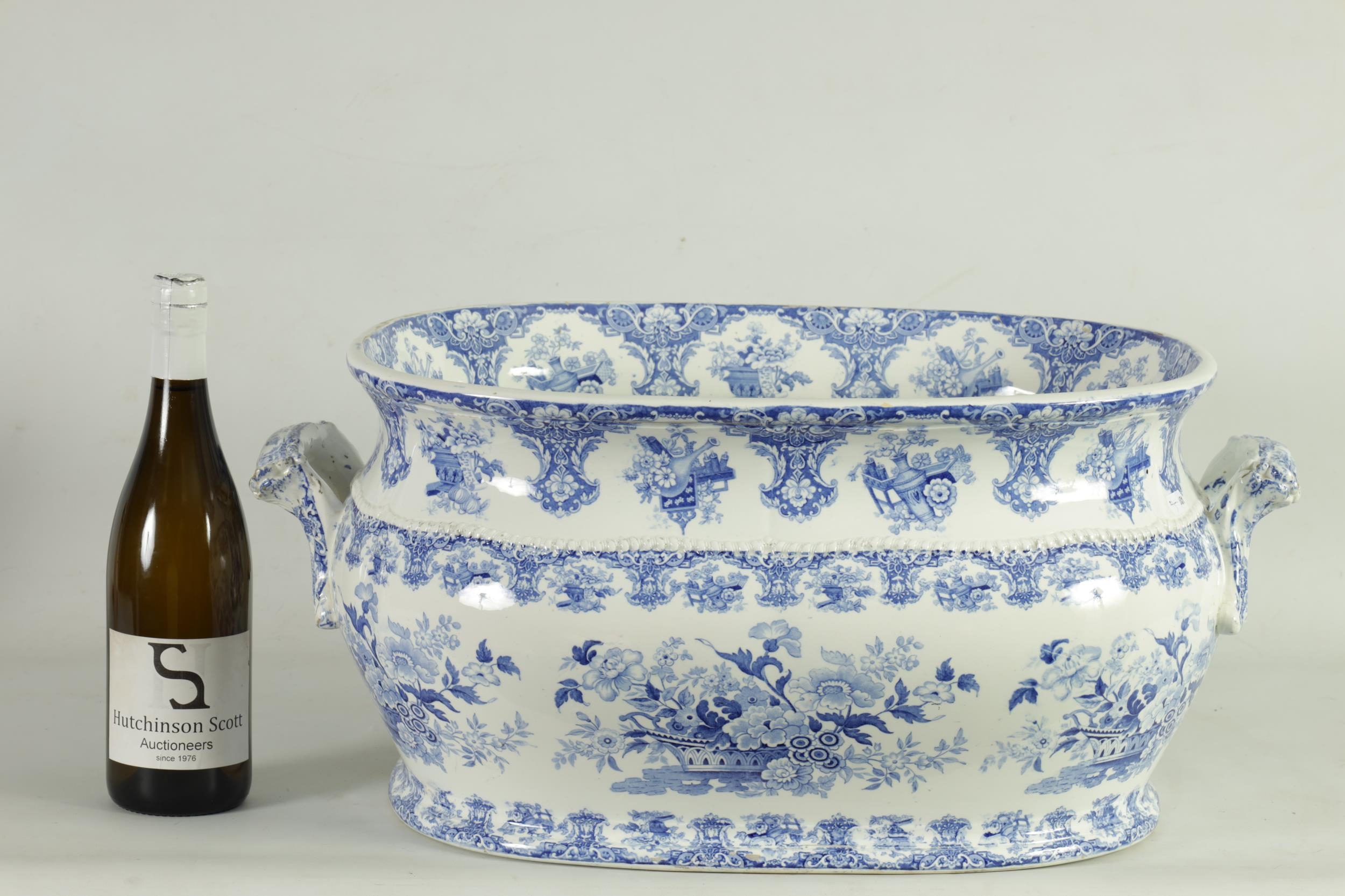 A LARGE EARLY 19TH CENTURY BLUE AND WHITE GLAZED POTTERY FOOT BATH with floral decoration, underside marked 'Canton Groups' (58cm wide)