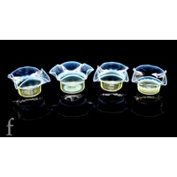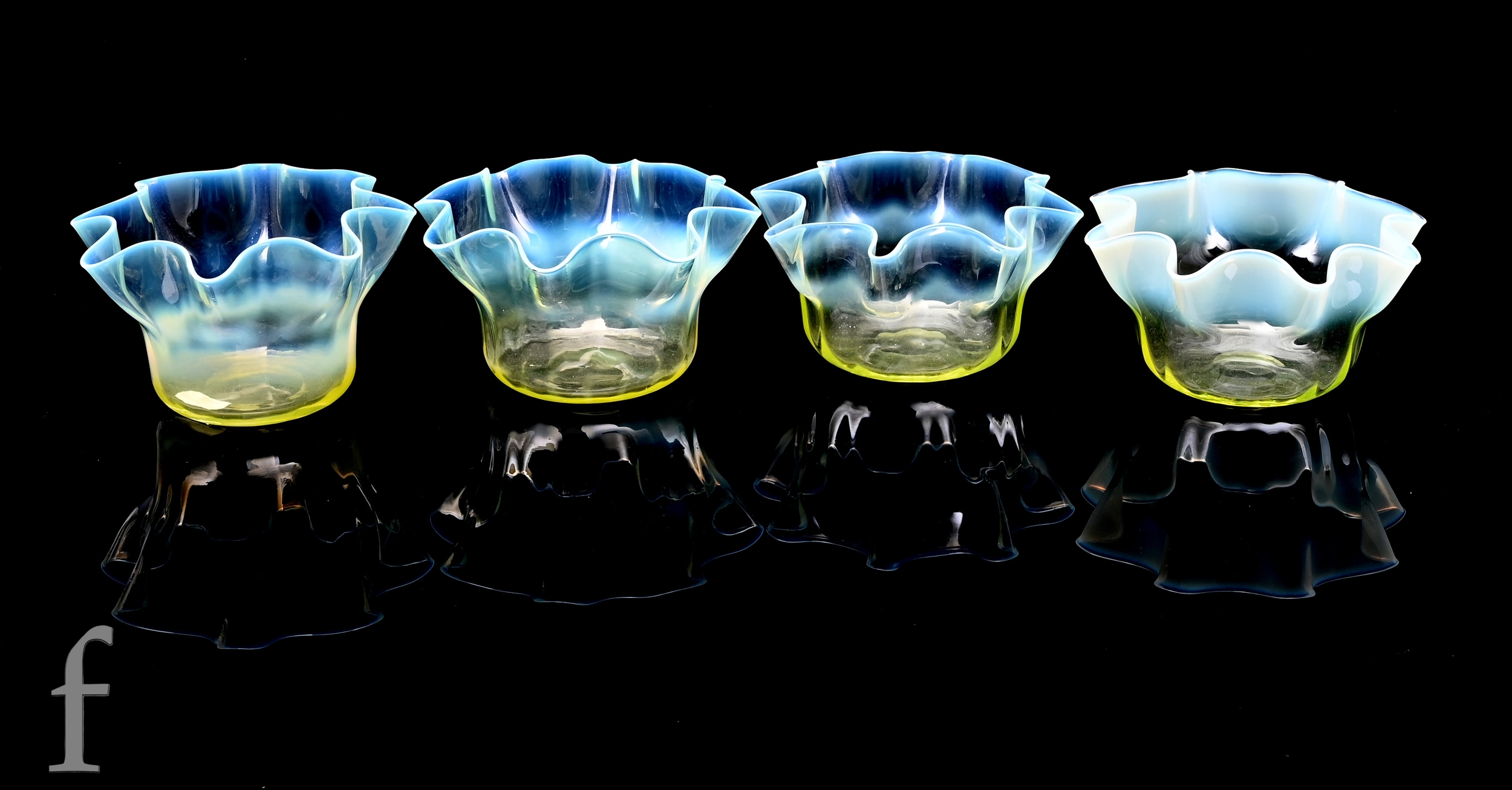 A group of early 20th Century Arts & Crafts straw opal bowls of circular section with frill rim designed by Harry Powell for James Powell & Sons for Whitefriars all with graduated opalescence, width 13.5cm. (4)