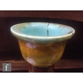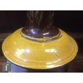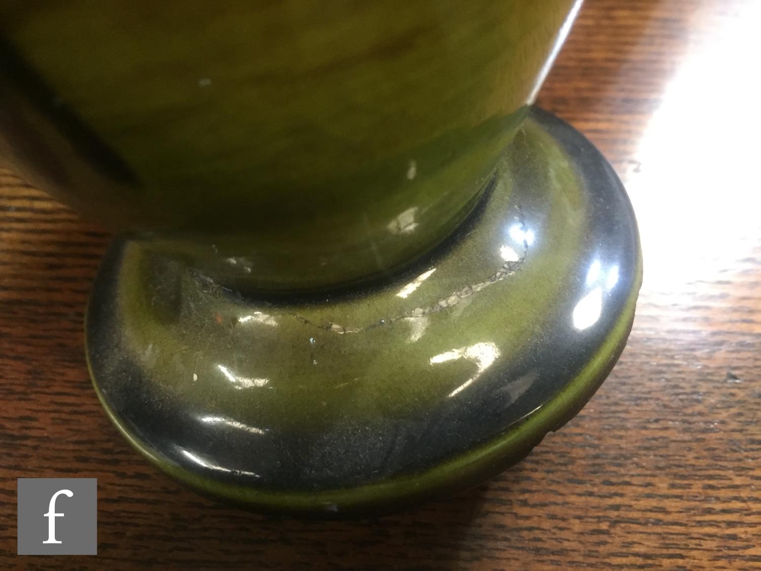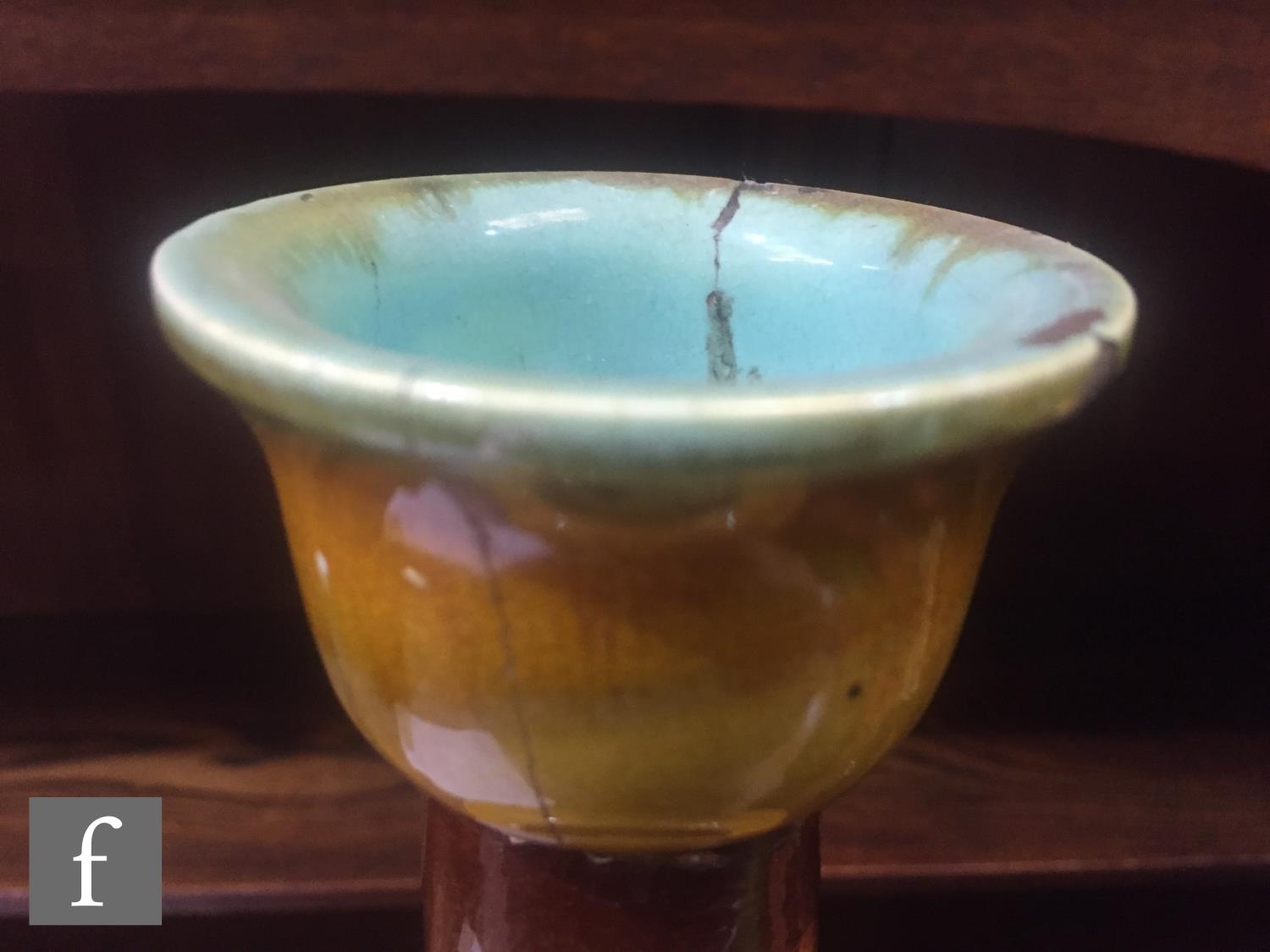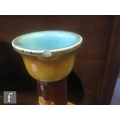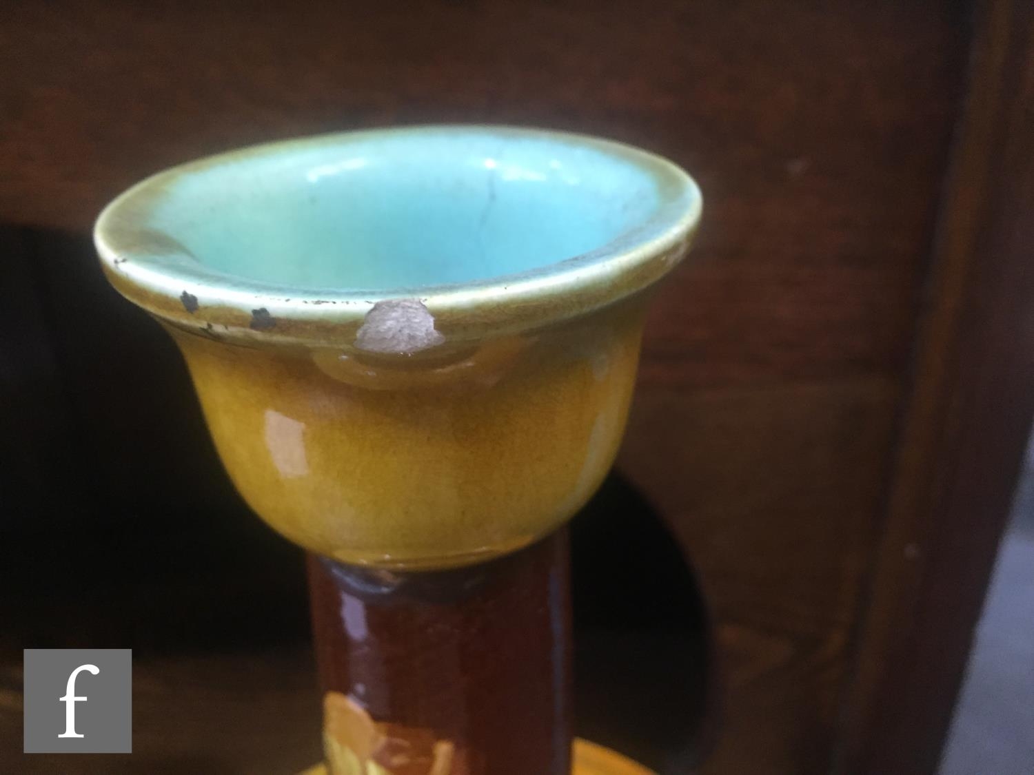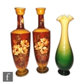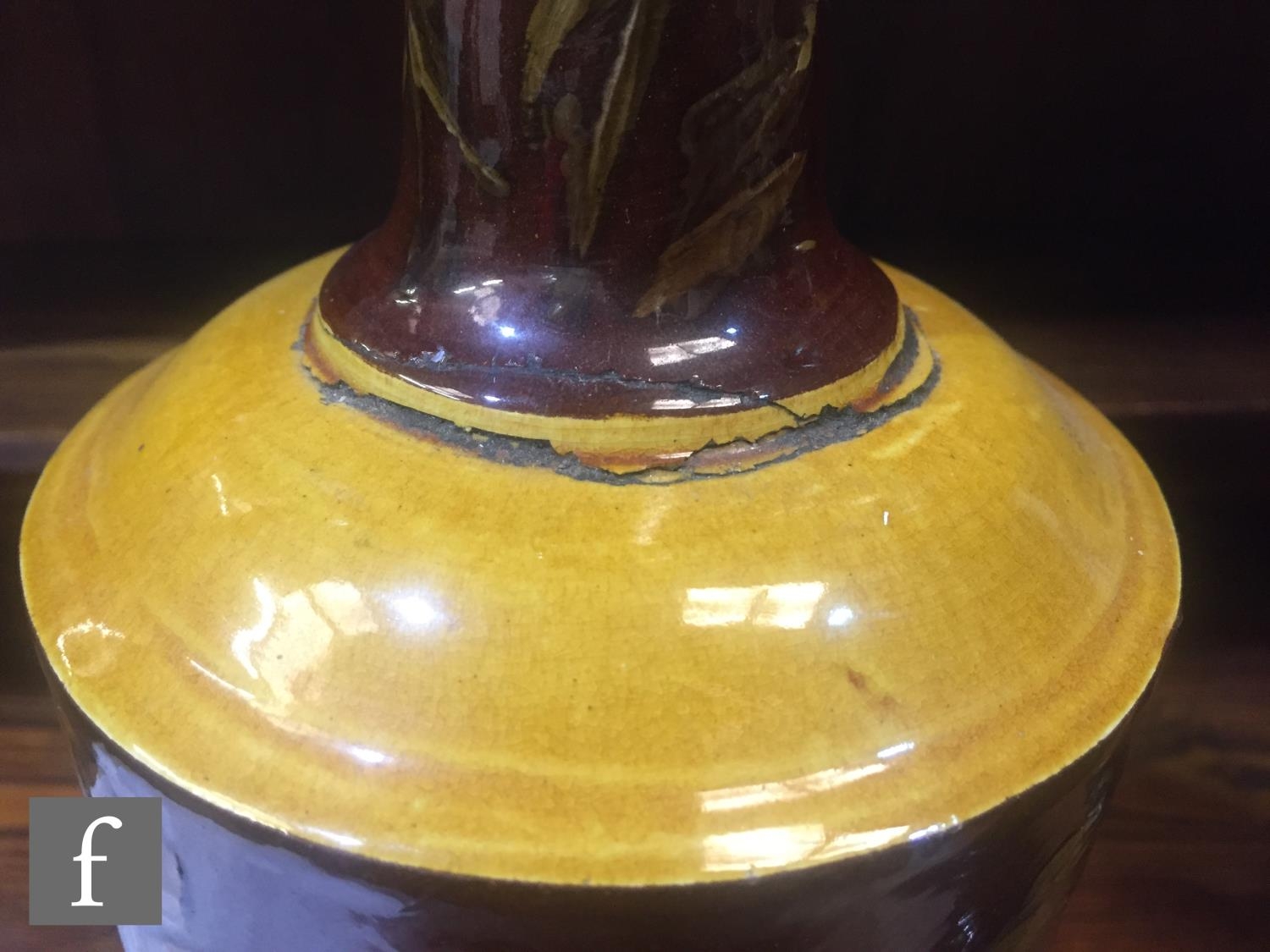 A pair of late 19th Century Bretby Pottery vases, each of slender ovoid form, rising from a stepped circular base, the body decorated with flowers and foliage before a treacle and ochre glazed ground, height 45cm, both A/F together with a 19th Century vase in the manner of Christopher Dresser, the pear shaped vase, with upper frilled rim, with graduated yellow to green ground, unmarked, 40cm, S/D. (3)