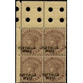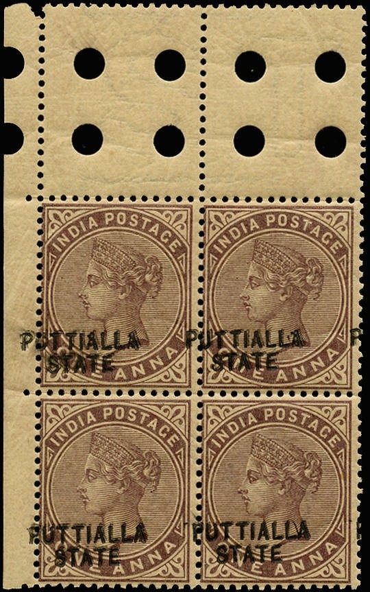 1885 1a brown-purple, type 2 opt in black, error opt DOUBLE, upper left corner block of 4 with interpane margin at top, mint, unmounted o.g. The overprint shifted to the left so that 'PUTTIALLA' appears as 'UTTIALLA P' on each stamp. Somewhat toned as often, but an interesting and very rare positional piece. Probably only one pane existed. BPA cert (2019), SG 11, £1300++