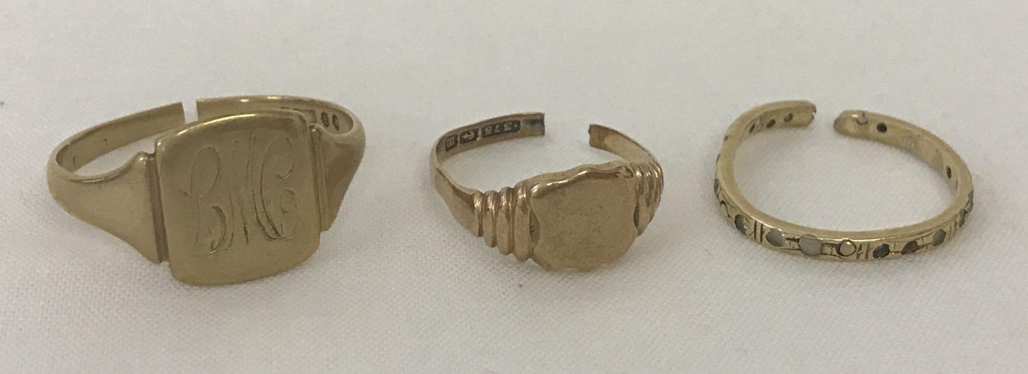 3 scrap 9ct gold rings. All rings have been cut through. 2 signet style rings together with a eternity ring set with small clear stones. Total weight approx. 6.6g