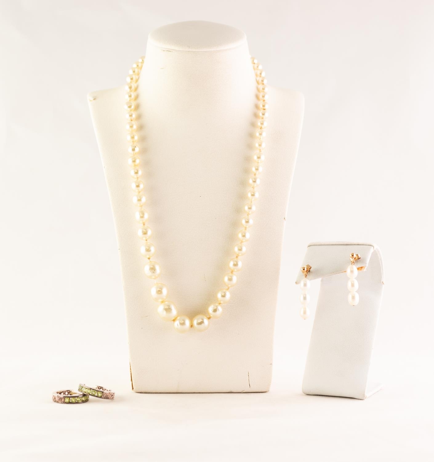 PAIR OF PENDANT EARRINGS each with three 9ct gold set cultured pearls, a pair of silver yellow stone set EARRINGS and a possibly cultured pearl graduated NECKLACE with silver and marcasite clasp