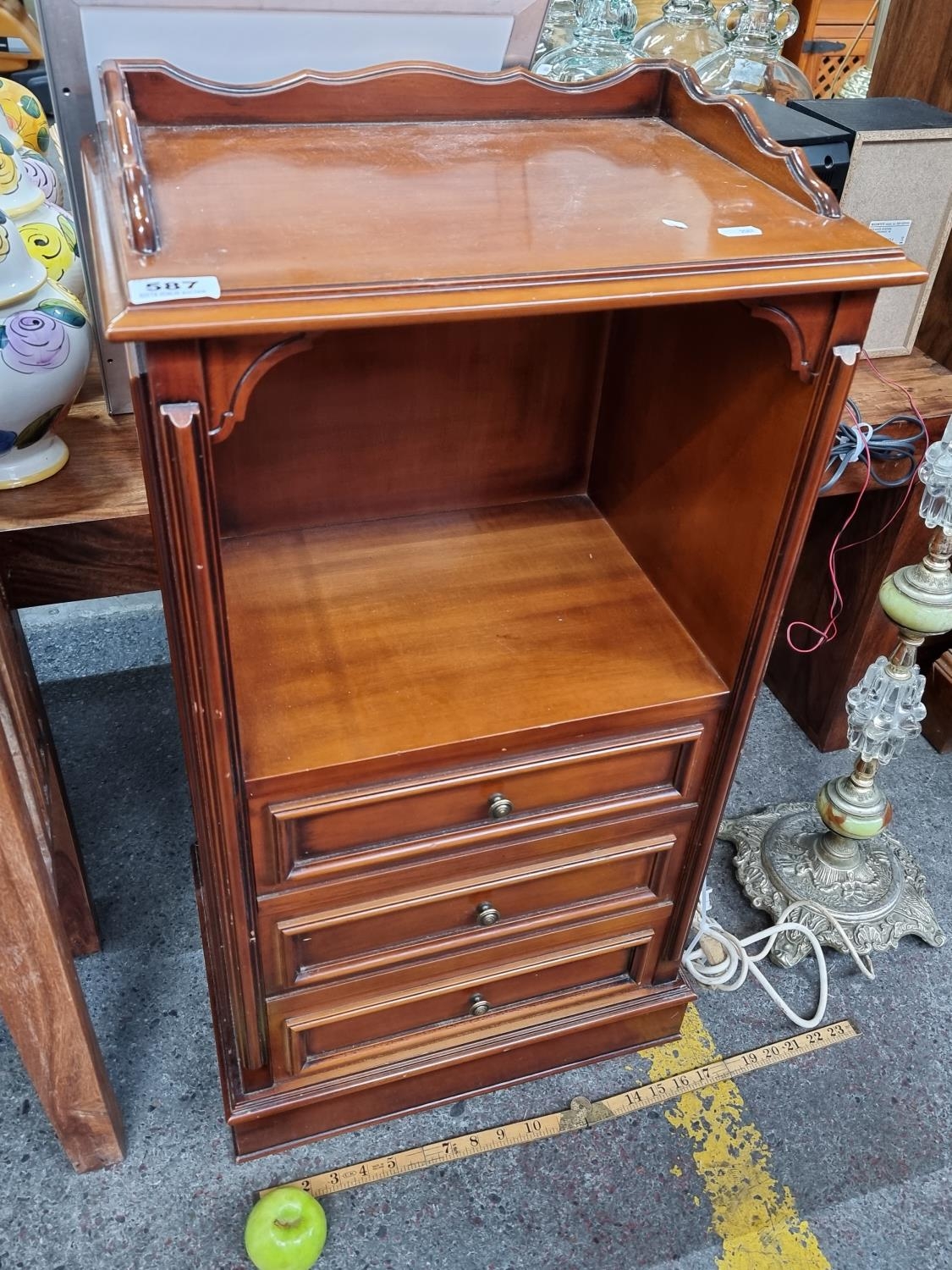 A good sized golden oak locker with three drawers and brass fittings with Gallery back maybe a music cabinet.