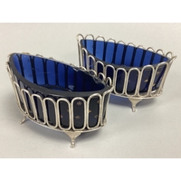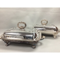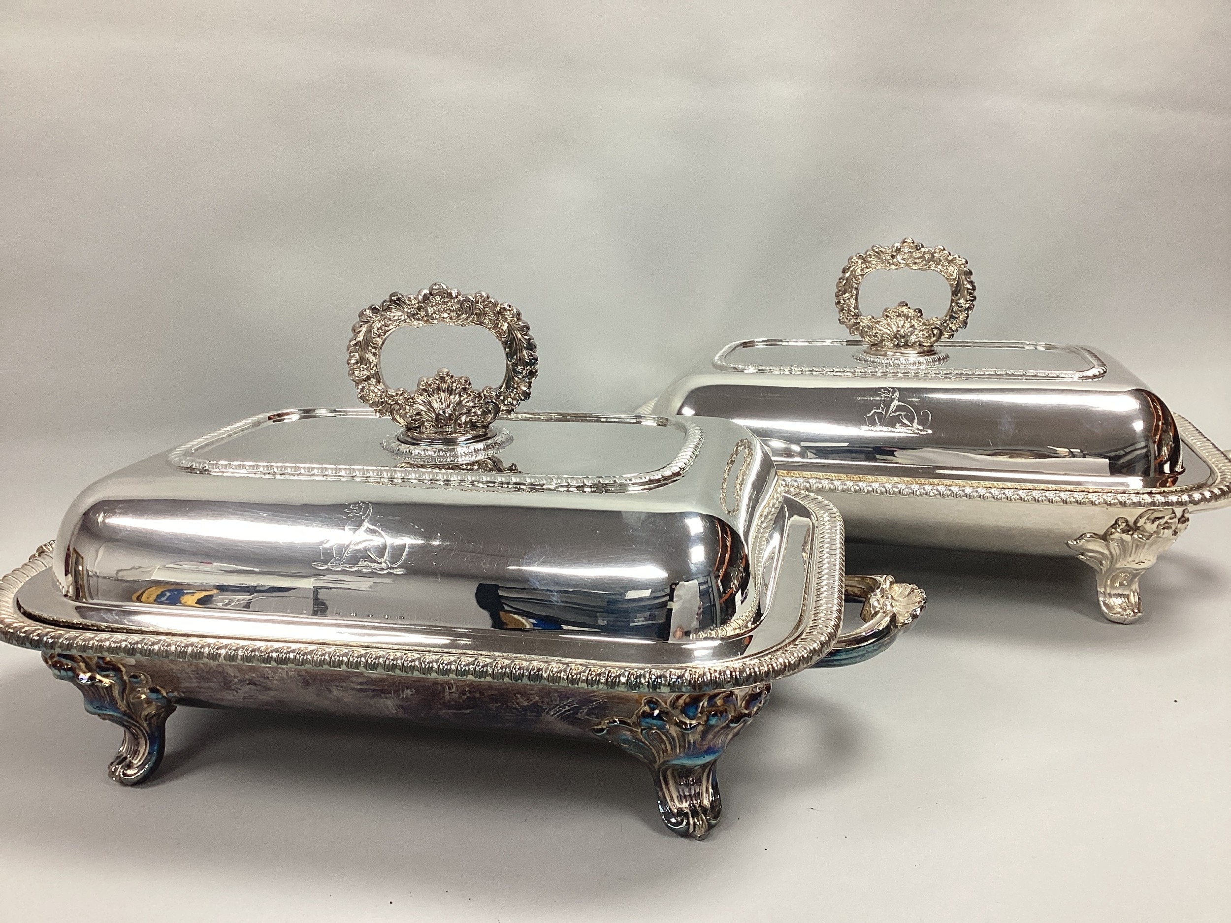 A Pair of Rectangular Twin Handled Plated Lidded Entree Dishes, each with gadrooned decoration and removable foliate scroll handles, raised on four scroll feet, crested, 36cm wide over handles. (2)