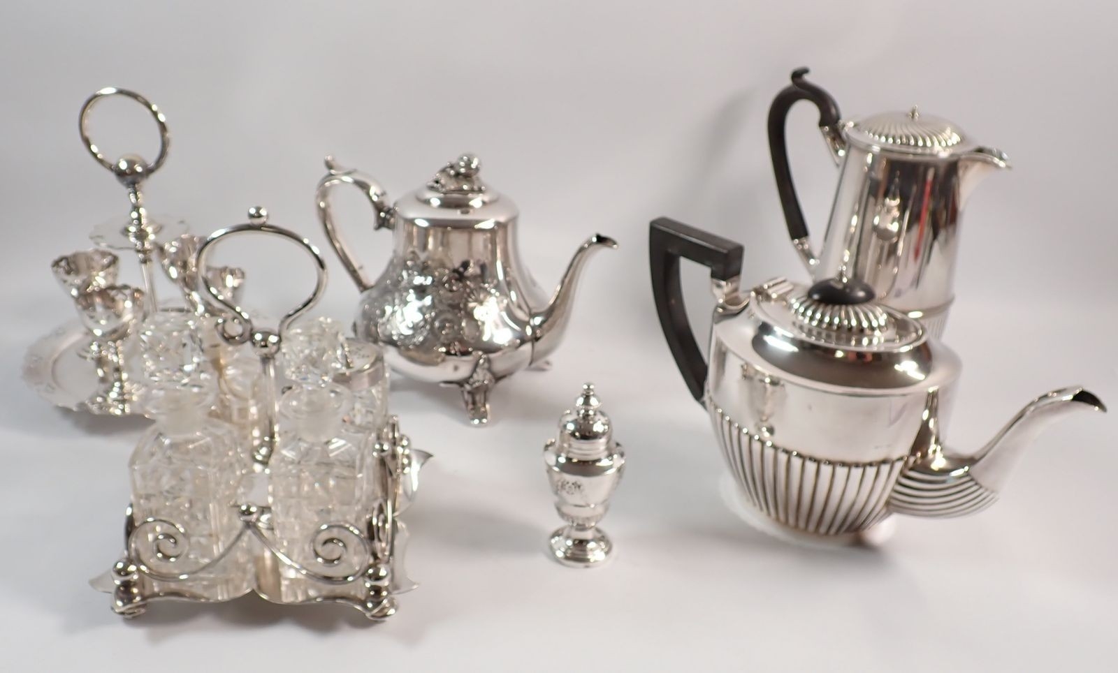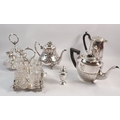 A group of silver plated items including teaware, cruet stand and eggcup stand