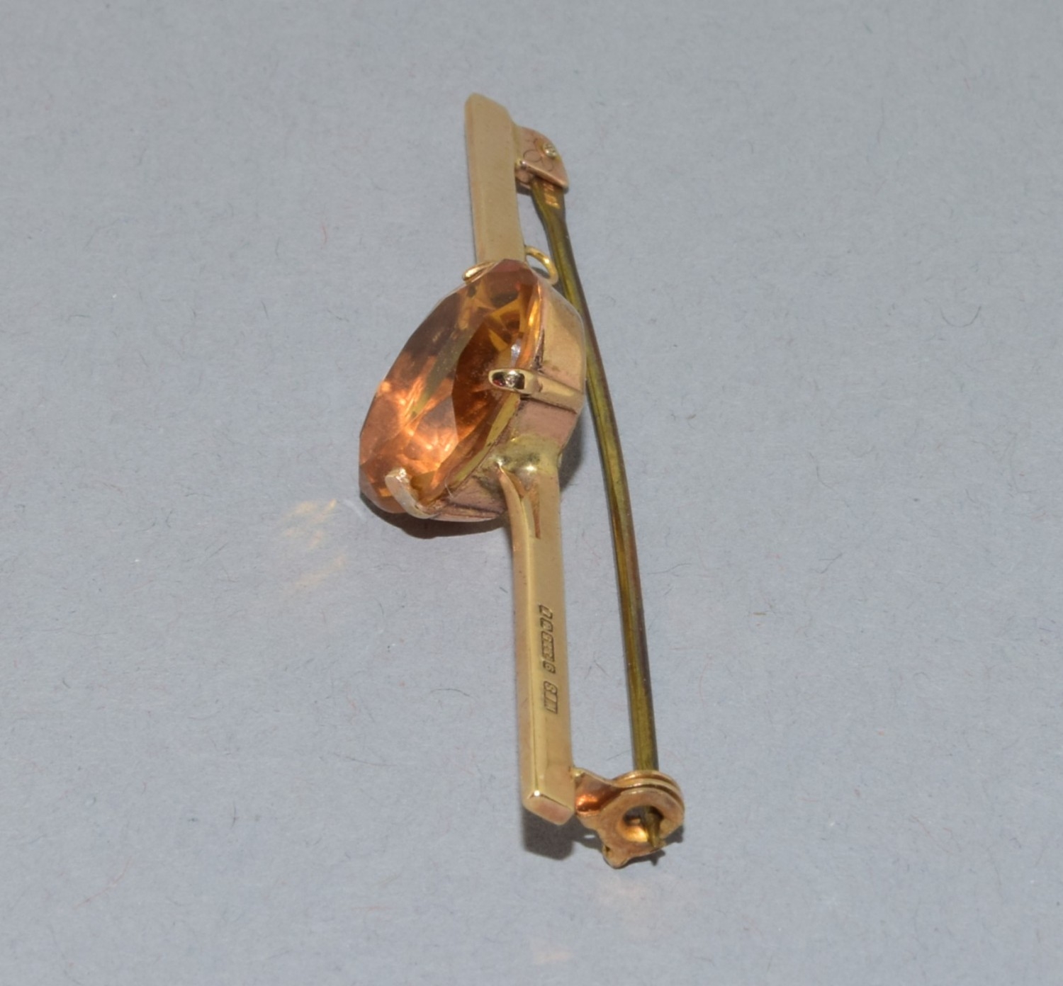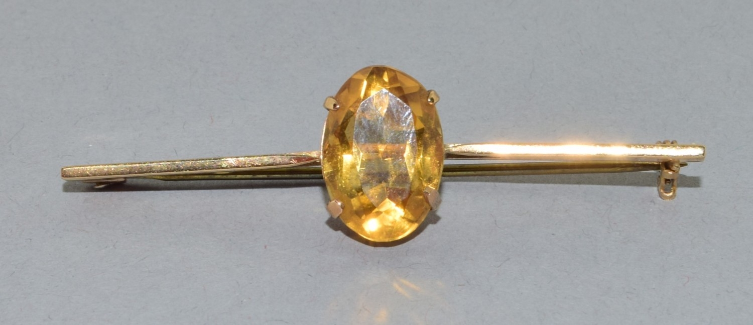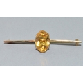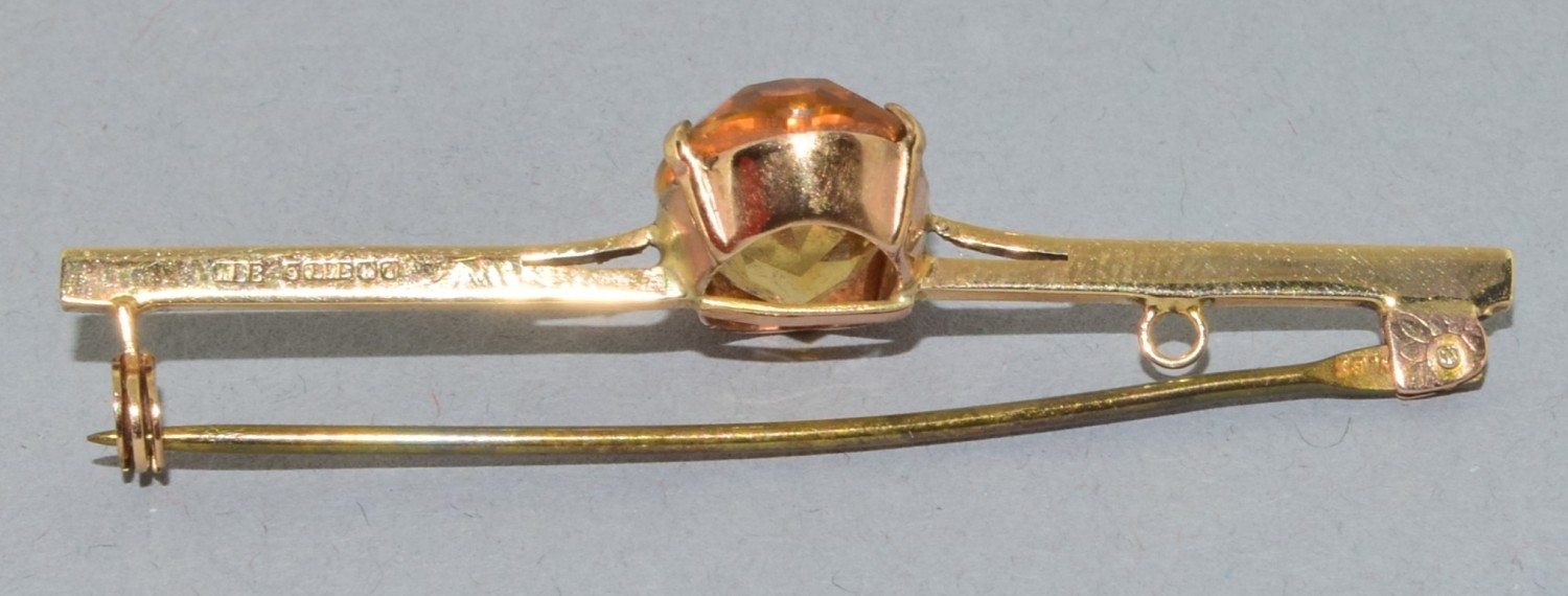 Vintage 9ct gold bar brooch set with a large single Amber stone in its fitted vintage box 3.89grams