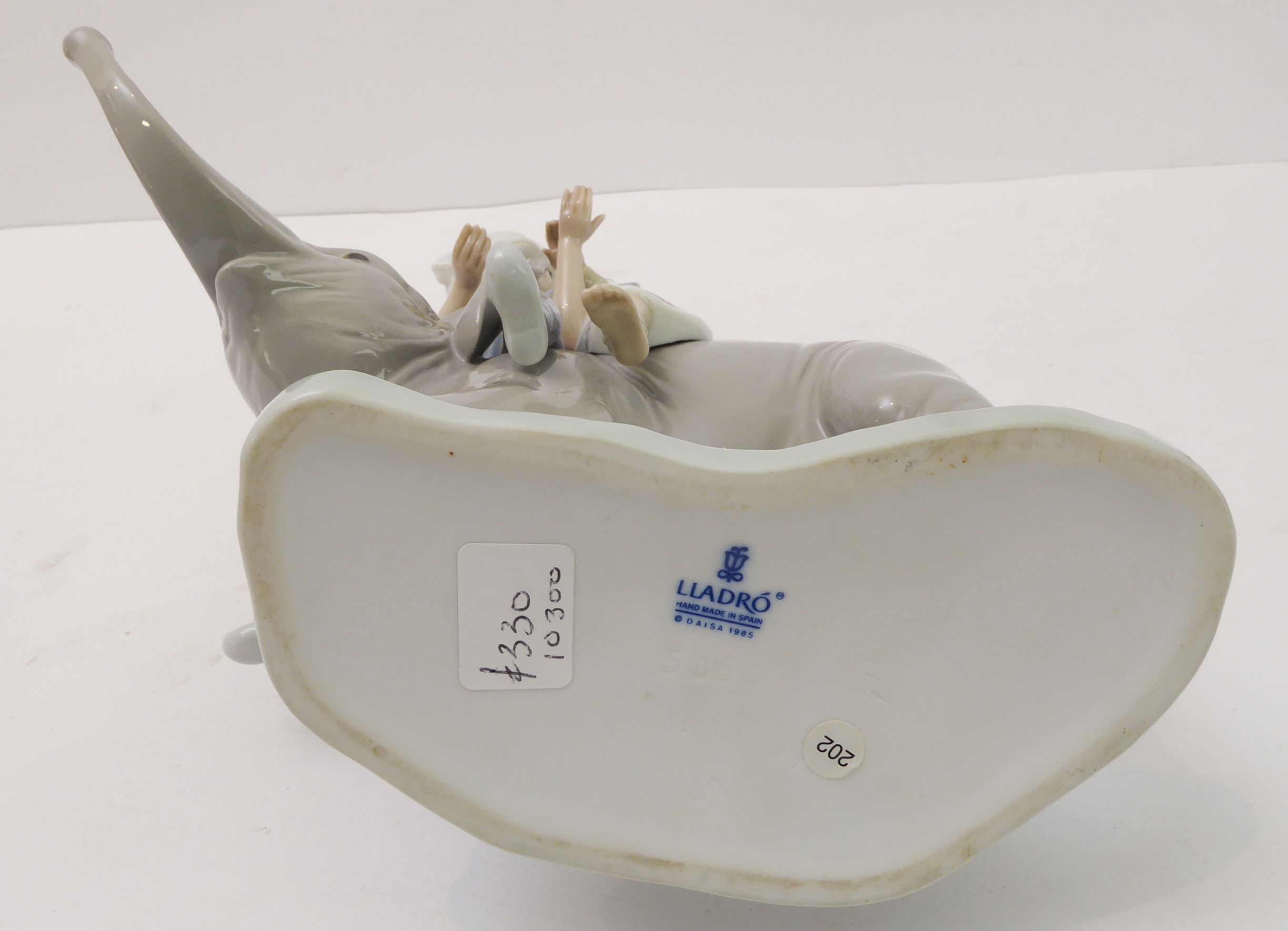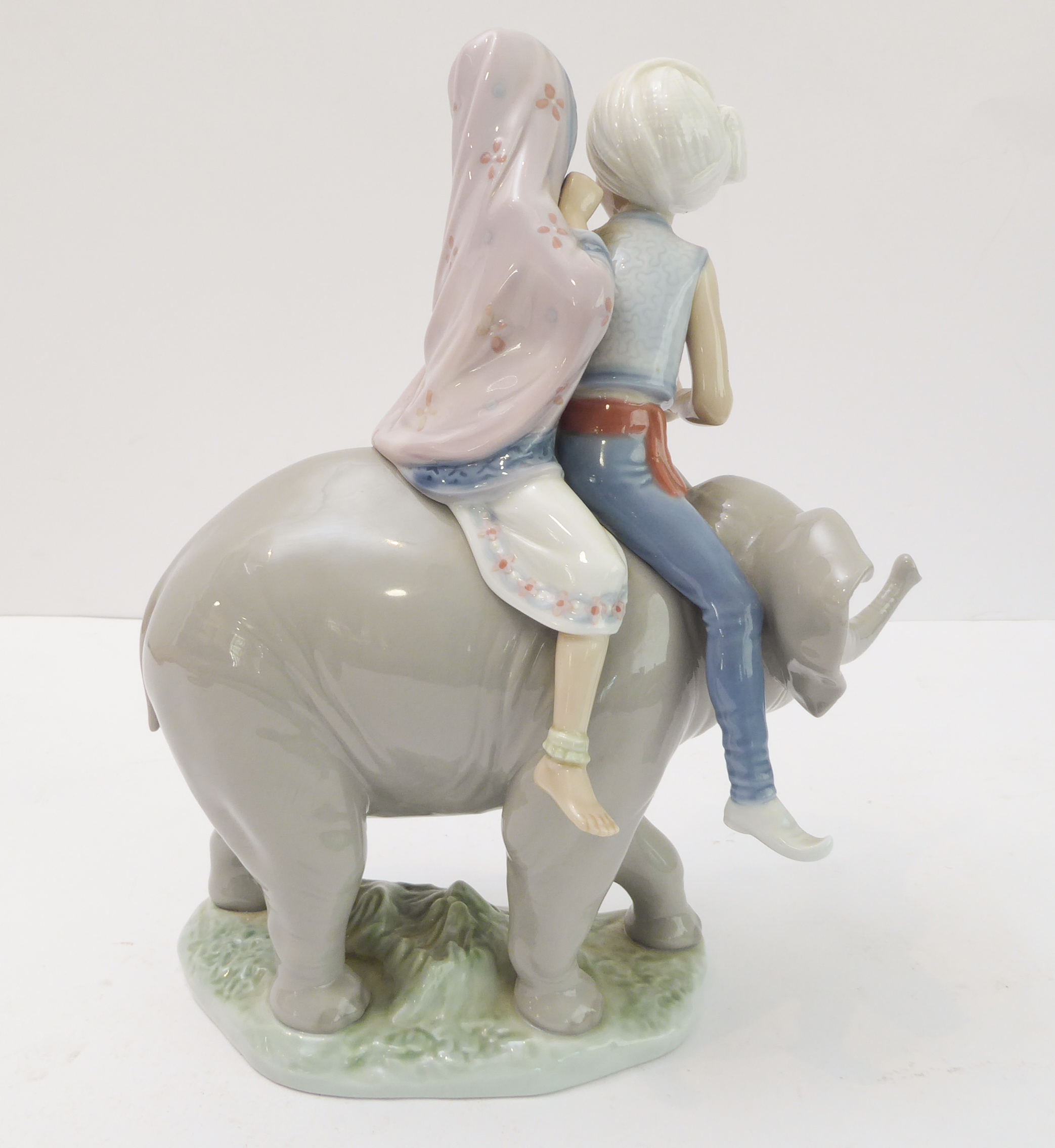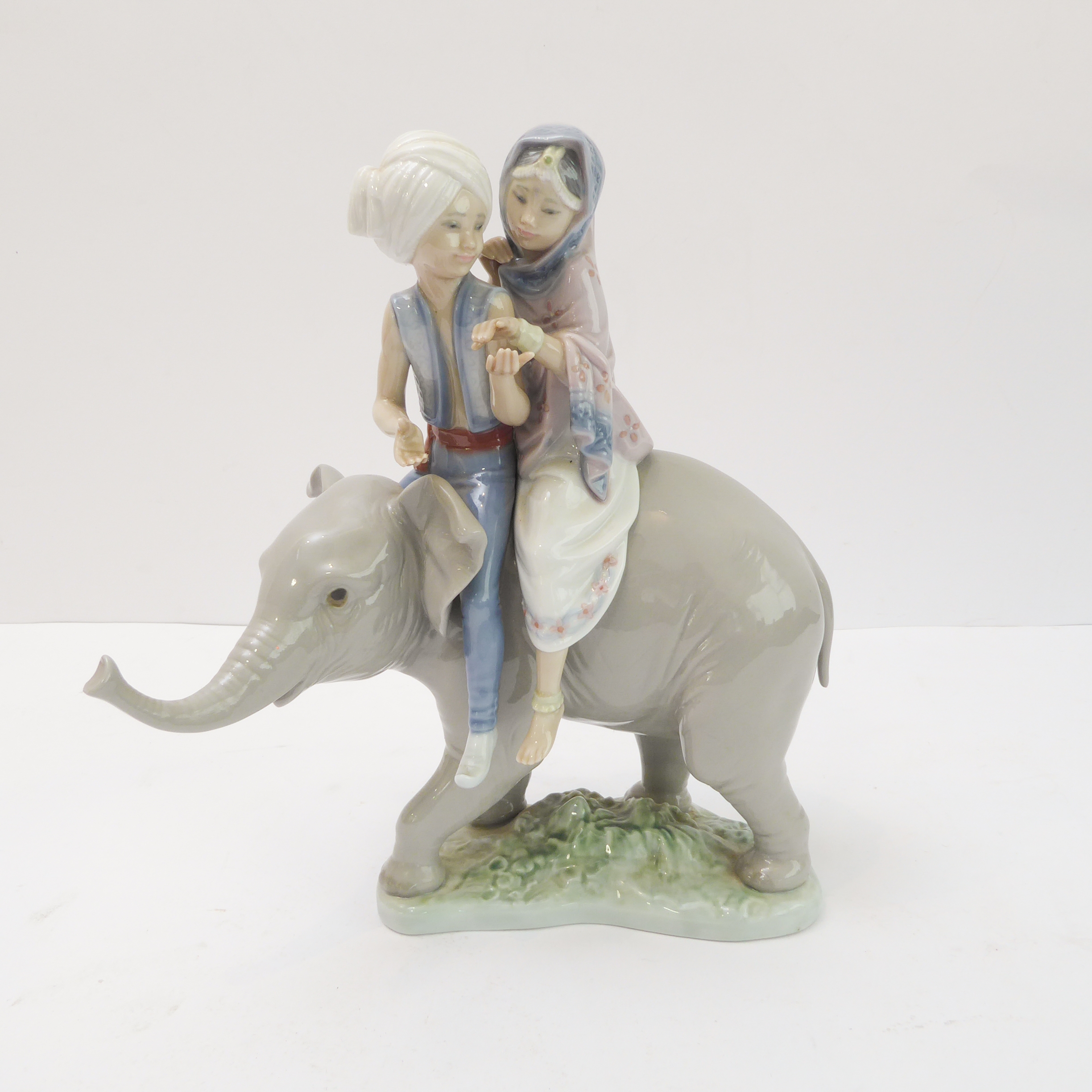 A Lladro porcelain model of two Hindu children riding upon the back of a elephant calf: impressed and printed marks to underside (23.5cm high)