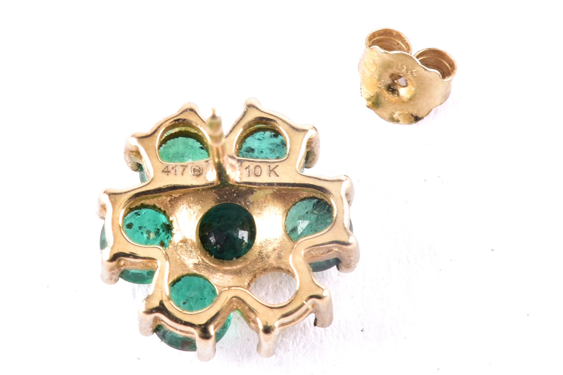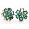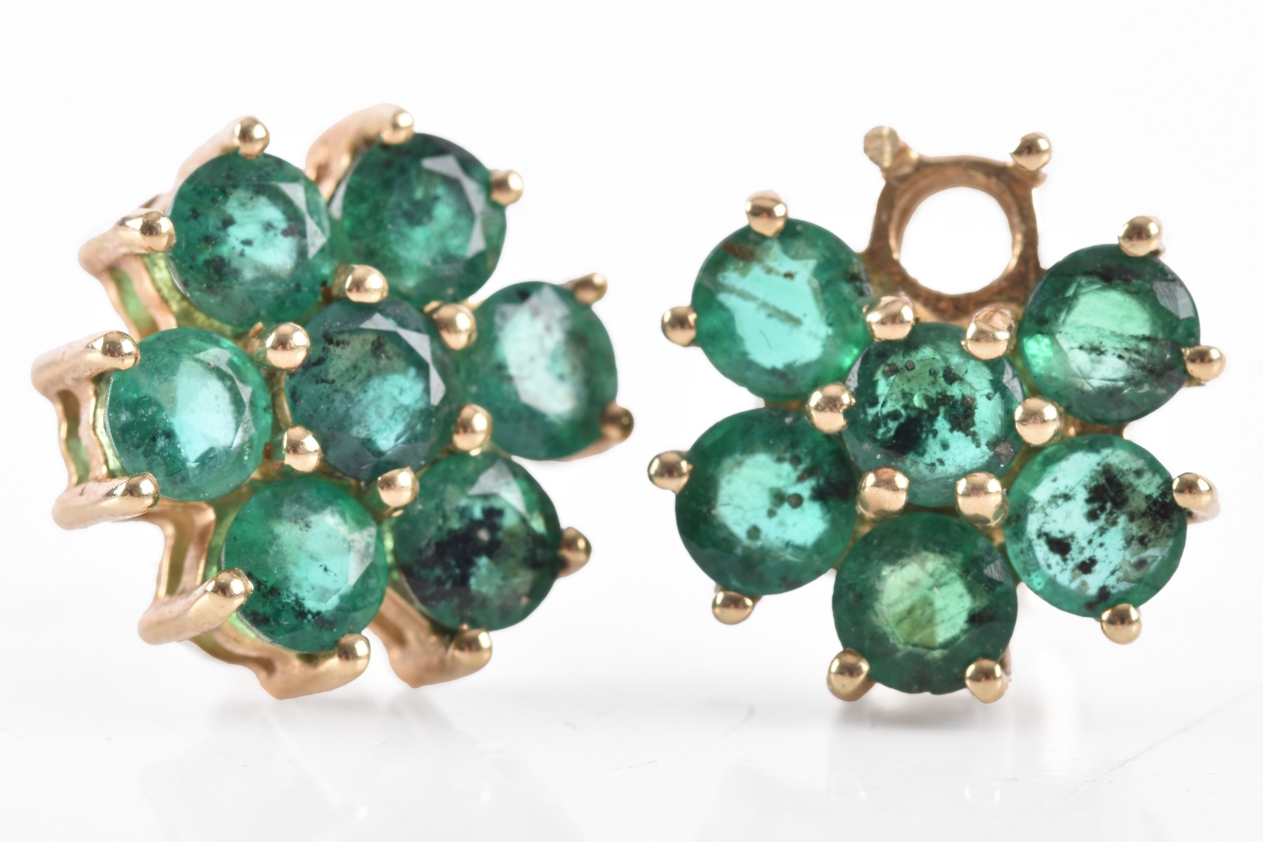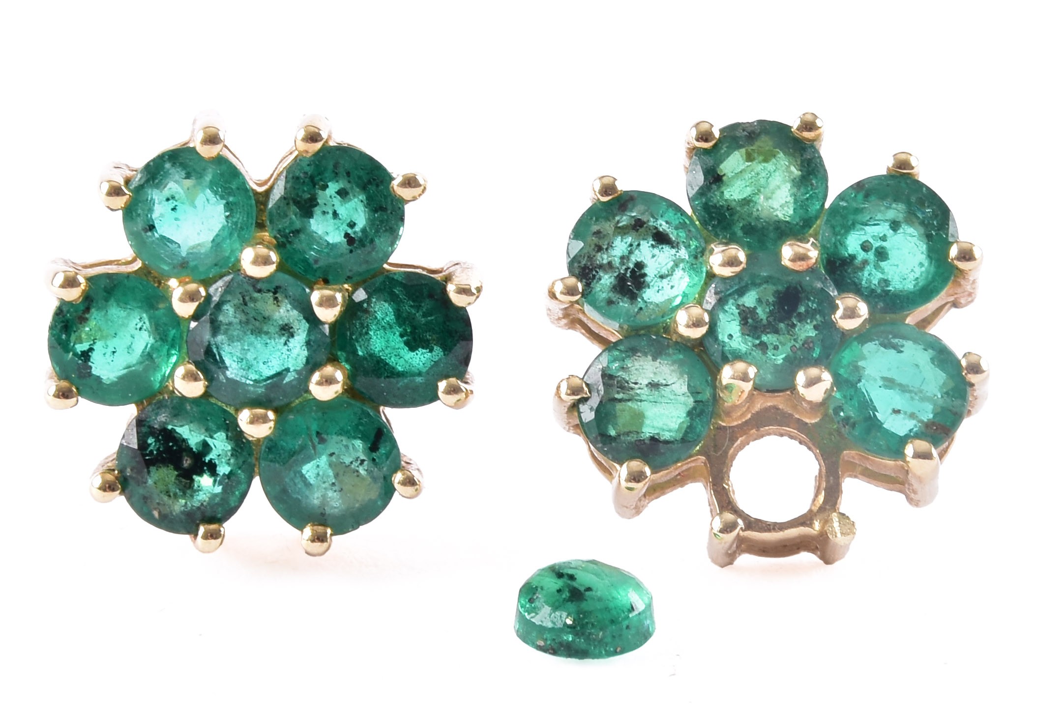 A pair of 10ct yellow gold floral emerald cluster earrings, (one loose stone), each 1 cm diameter, with butterfly fittings.