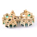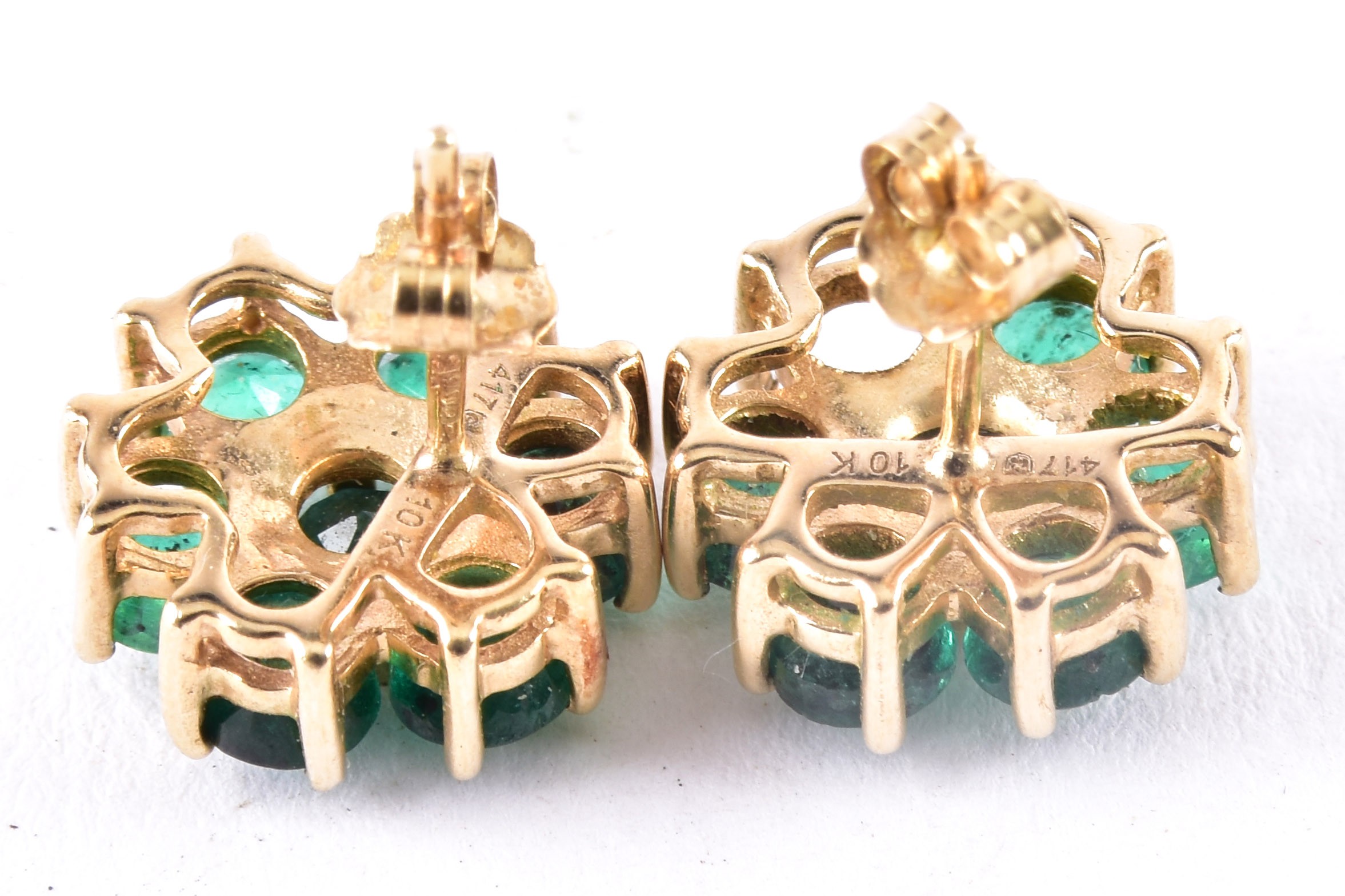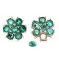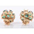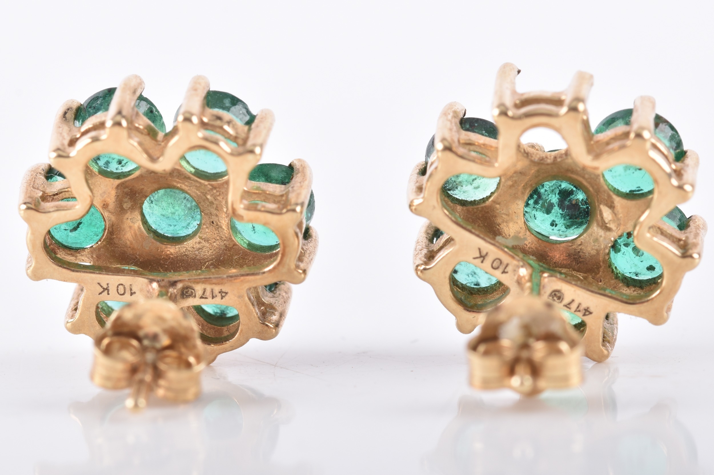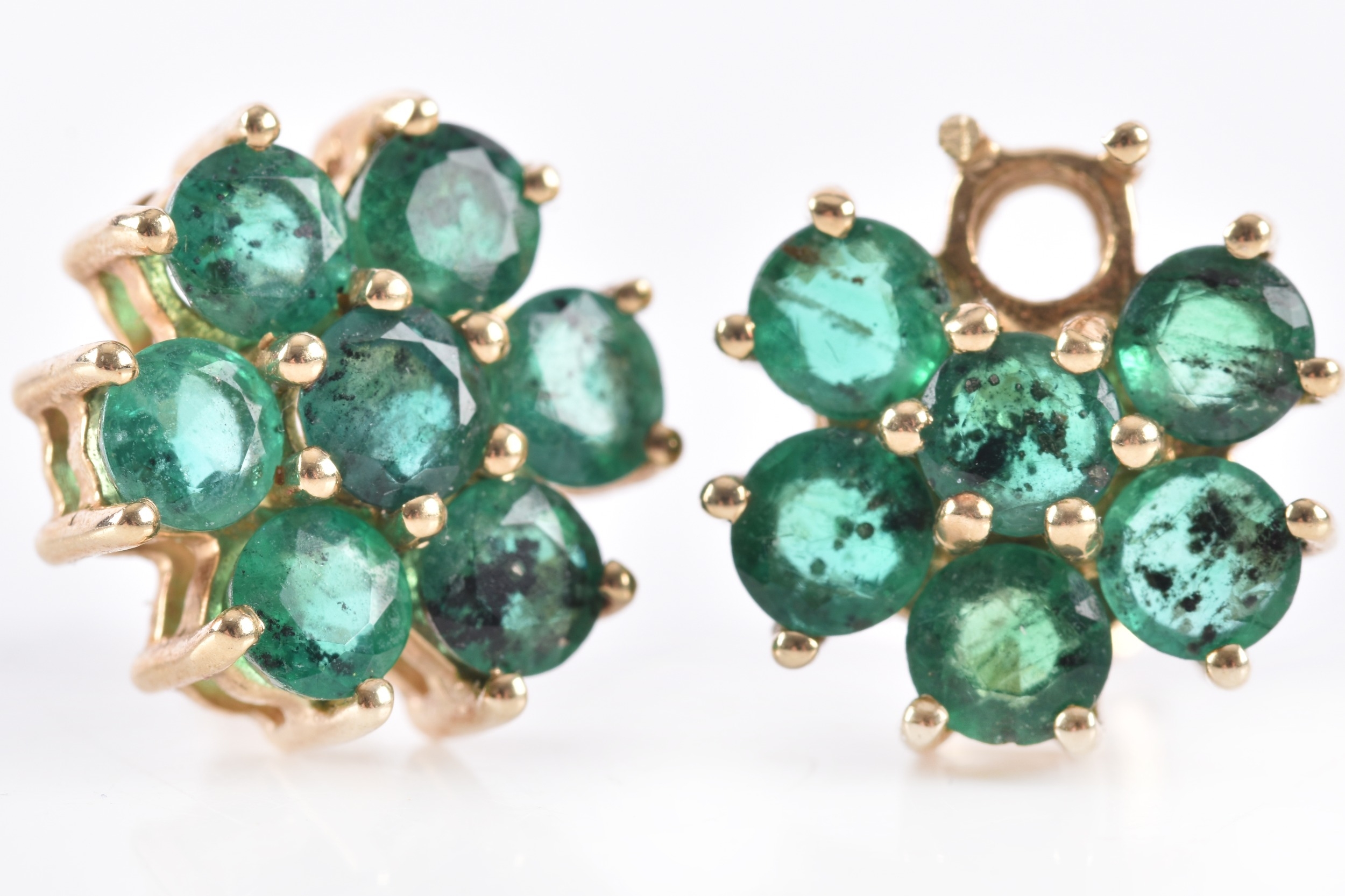 A pair of 10ct yellow gold floral emerald cluster earrings, (one loose stone), each 1 cm diameter, with butterfly fittings.