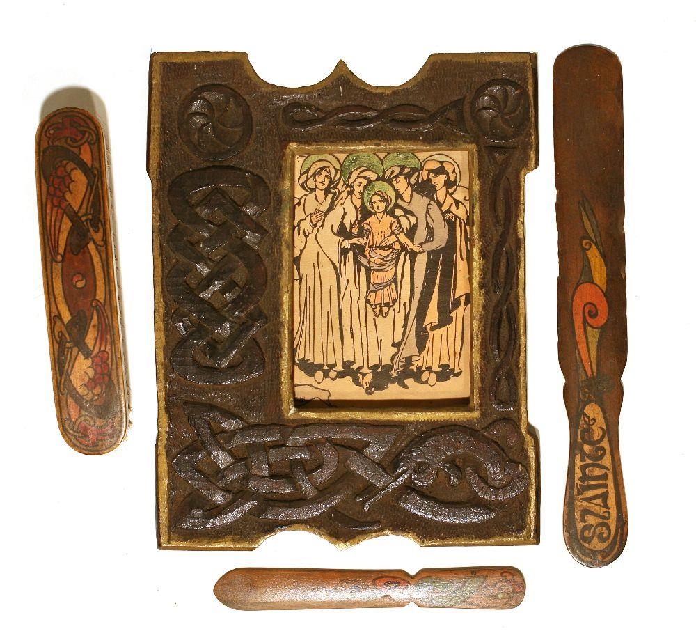 Cuala Industries: Attractive group of three wooden items, a brush and two letter-openers, each decorated with stained design in Celtic style, and a heavy carved wooden photo-frame with Celtic design. As a coll.