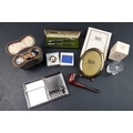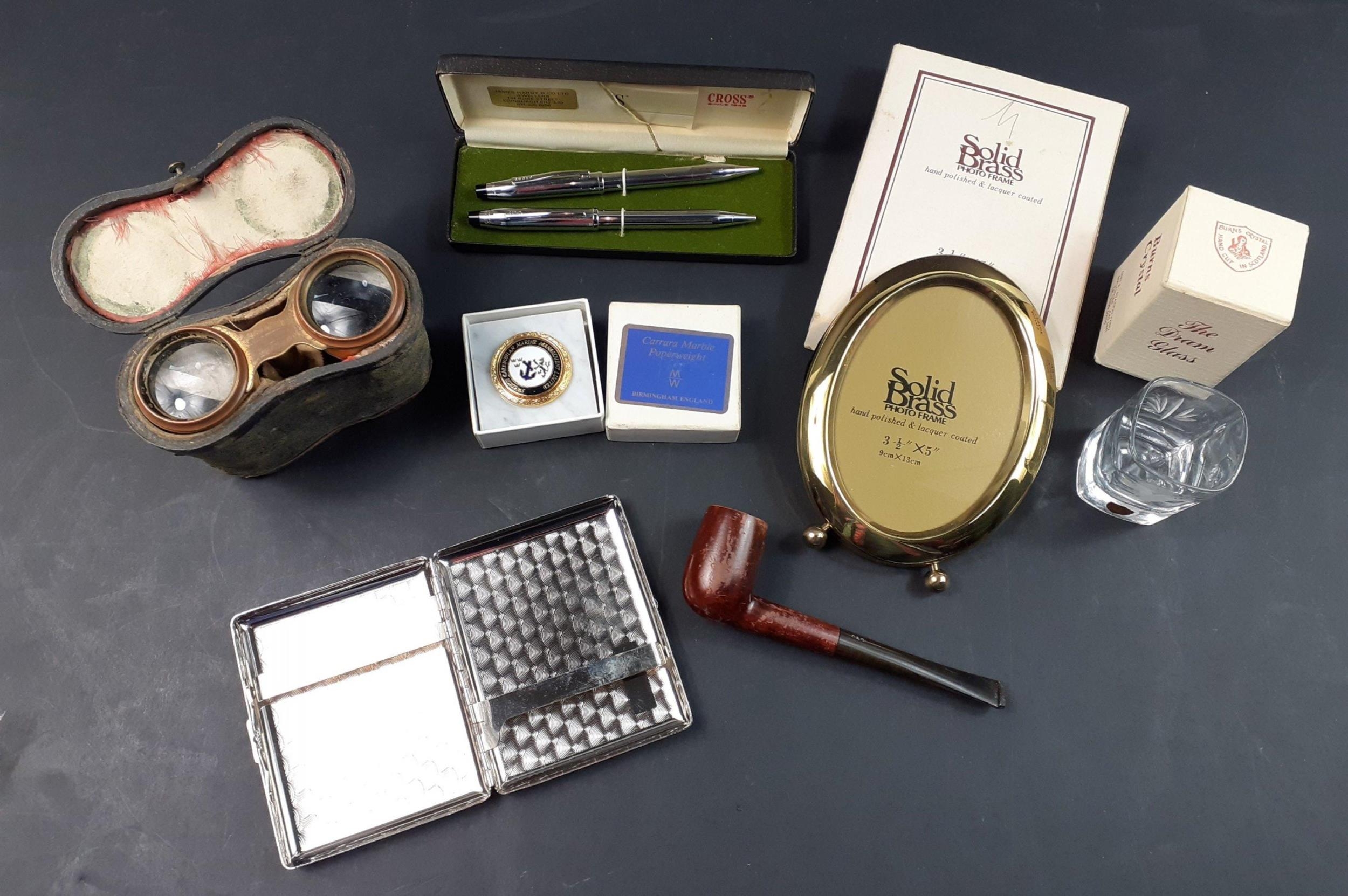 A mixed lot to include a boxed CROSS ball pen and pencil set, a brass photo frame (9x13cm), a vintage set of cased binoculars, a pipe, and a machine turned cigarette case,